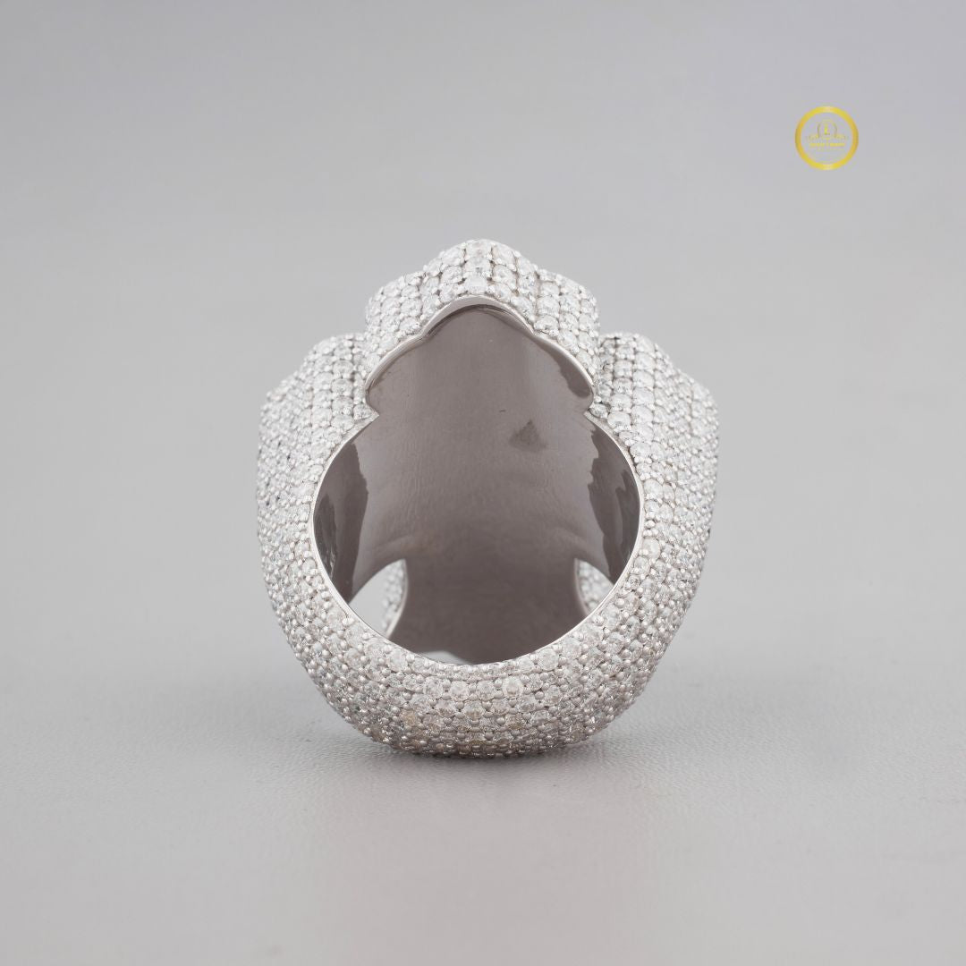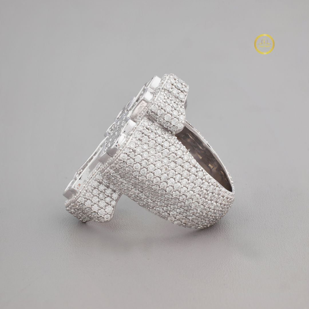 This exquisite ring features an ornate cross-shaped design crafted from meticulously arranged baguette-cut diamonds, each aligned to create a shimmering, textured pattern that captures light from every angle. The center arrangement is framed by a delicate halo of round brilliant diamonds, enhancing its luminous presence and adding depth to the intricate silhouette. Set in a polished white metal, the piece exudes elegance and symbolic significance, making it a standout statement of both craftsmanship and devotion.