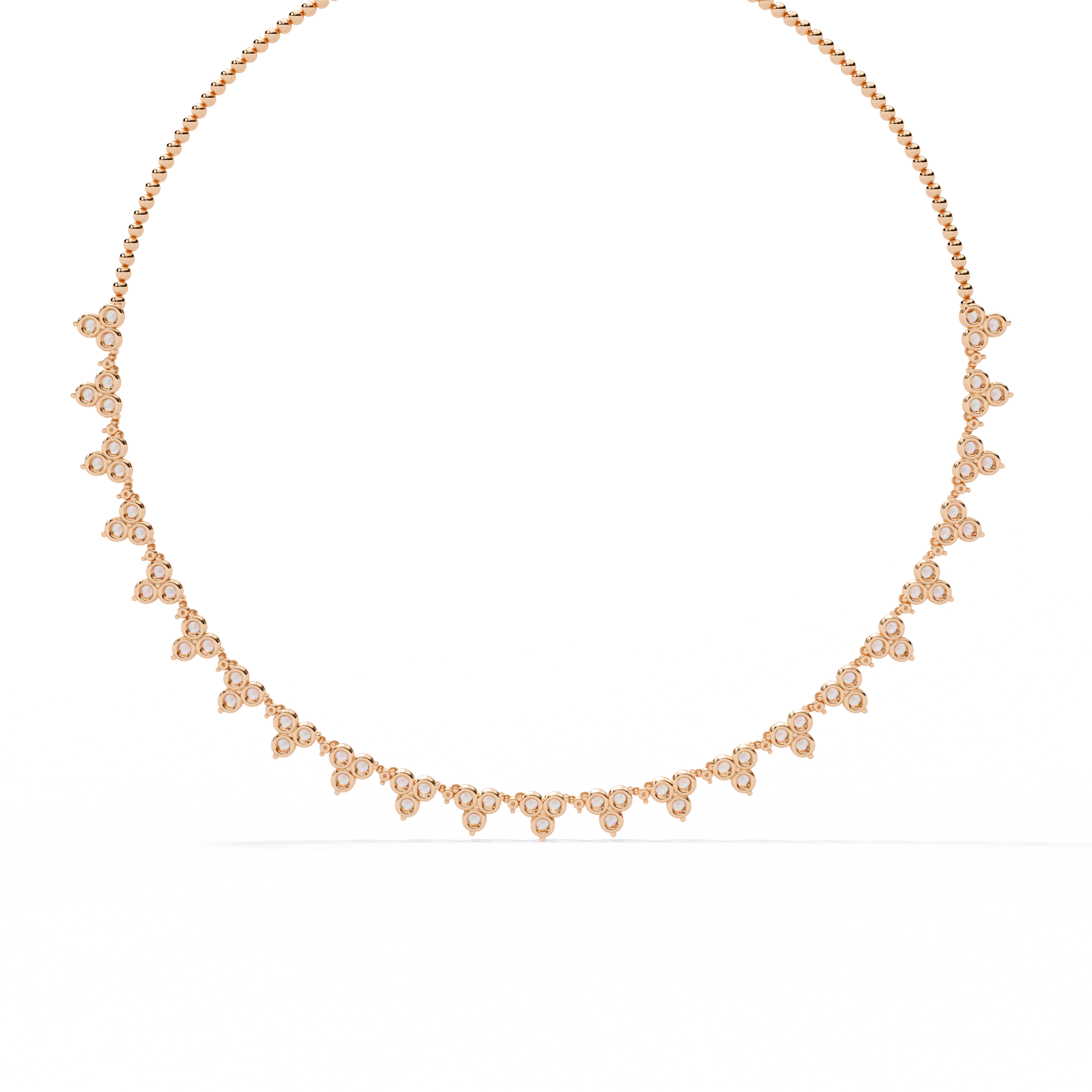 Shimmer with timeless elegance wearing this exquisite diamond Cluster Necklace. Each sparkling cubic zirconia is carefully set to create a stunning cluster design by ivevar luxury that catches the light with every movement. This necklace showcases a fine gold chain that gently curves around the neckline, leading into a beautifully arranged series of round cut diamond clusters that sparkle with every movement. Each cluster is set in a rhythmic pattern, creating a flowing, luminous effect that feels both luxurious and delicately understated. The combination of the warm gold and brilliant diamonds gives the piece a timeless elegance, making it suitable for both special occasions and refined everyday wear.