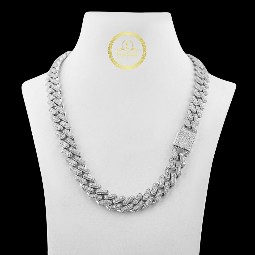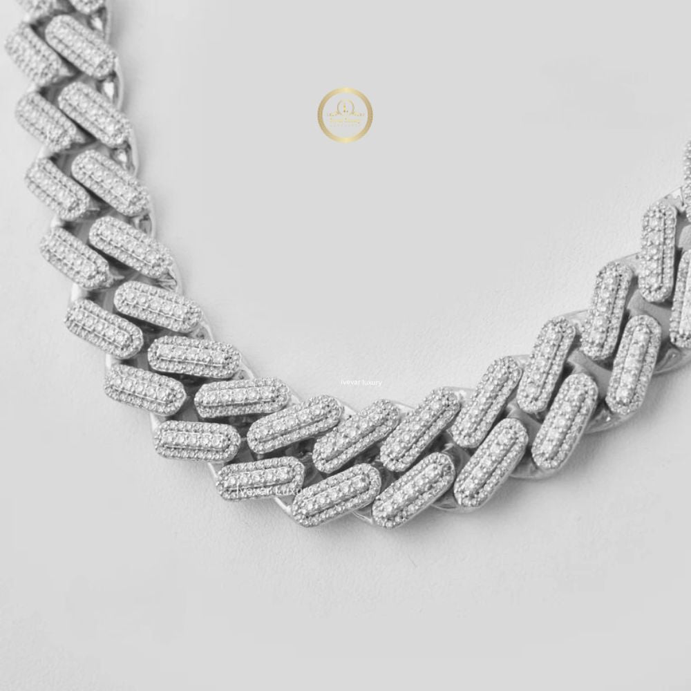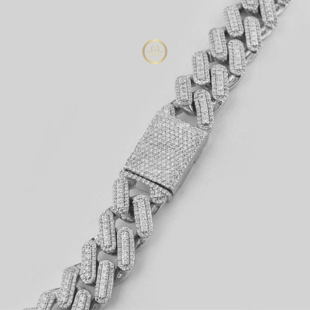 This necklace features the classic Cuban link design, recognized by its bold, thick, and tightly interlocking links that lie flat. The chain is fully "iced out" or paved, with high-quality Moissanite stones set across the surface to maximize sparkle.