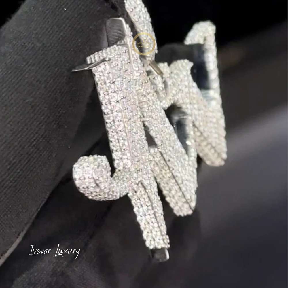 The design is rendered entirely in a silver-toned metal and is fully paved with brilliant Moissanite diamonds. The chosen font is highly stylized, giving the piece a dynamic, almost handwritten appearance that moves diagonally. The meticulous pave setting covers every curve, maximizing the overall sparkle. This is a bold, artistic piece of personalized jewelry, emphasizing custom calligraphy and high-density diamond setting for a truly unique and unmistakable statement.