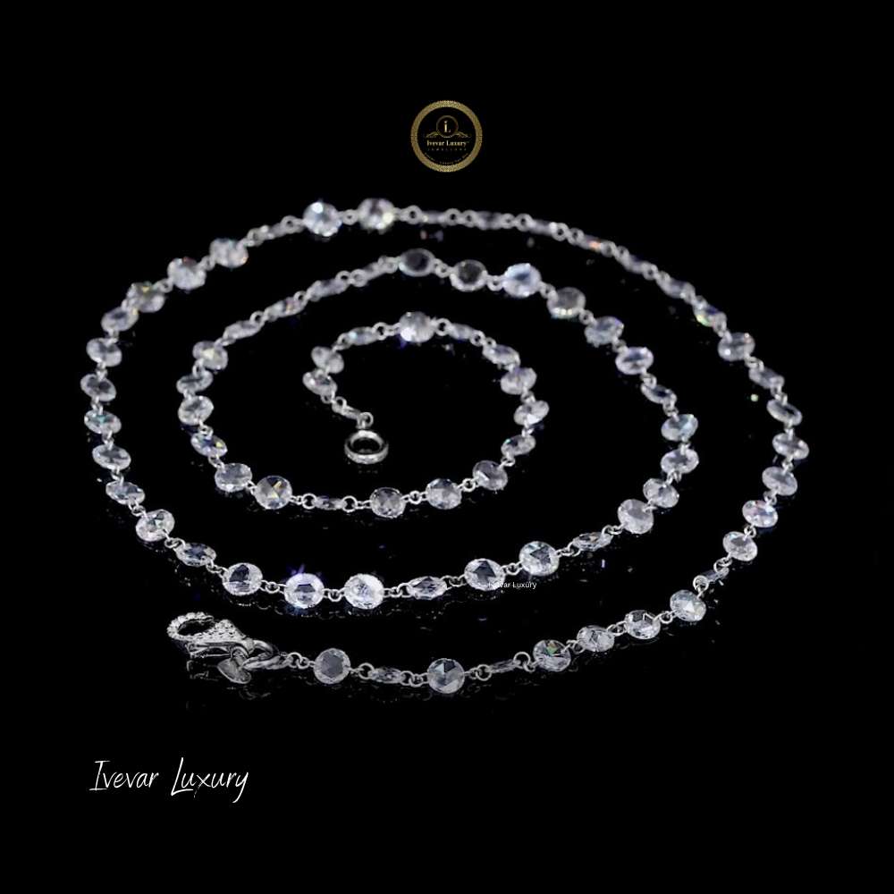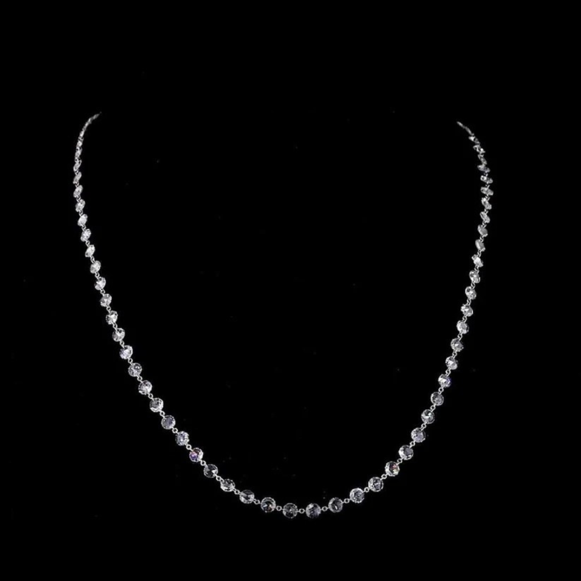 This exquisite 14K white gold necklace showcases a continuous line of natural rose-cut diamonds, offering a perfect blend of vintage charm and modern elegance. Each diamond is meticulously hand-set to highlight its unique faceting, creating a soft, romantic sparkle that catches the light from every angle. The delicate silhouette makes it ideal for both everyday sophistication and special occasions, adding a refined touch of luxury to any ensemble. Designed for those who appreciate understated brilliance, this necklace embodies timeless beauty, exceptional craftsmanship, and the natural allure of rose-cut diamonds. A truly graceful and versatile fine-jewelry piece.