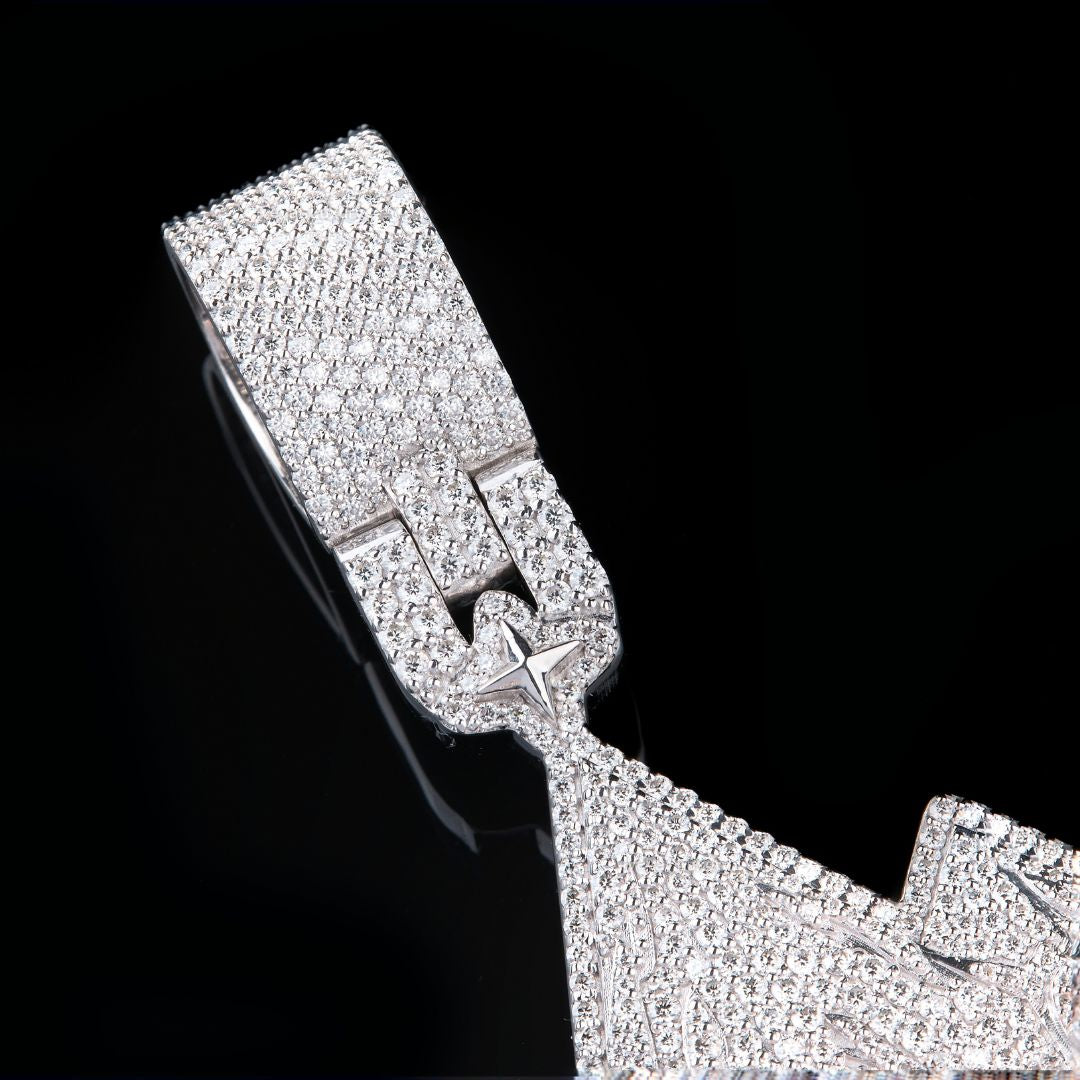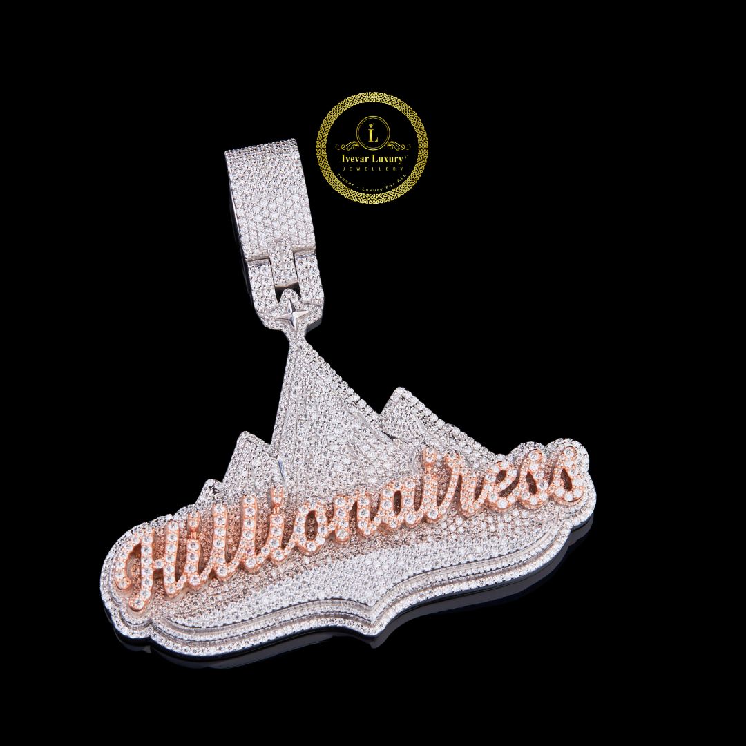 This bold pendant features the word "Hillionaires" layered over a dramatic, diamond-paved mountain or peak motif. The design utilizes a striking two-tone effect: the mountain backdrop is fully paved with lab-grown diamonds set in white metal (creating a snowy or icy look), while the word "Hillionaires" is set in contrasting rose gold for maximum visual pop. The large, fully-paved bail integrates seamlessly into the mountain shape. This piece is a heavy, statement-making jewelry item that combines textual aspiration with a powerful, iconic image.