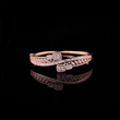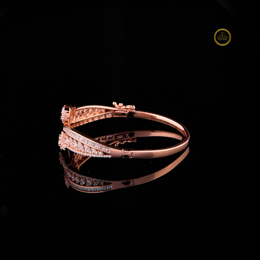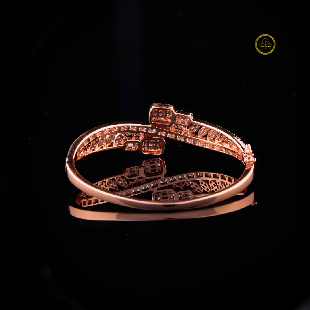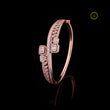 This exquisite bracelet features a luxurious rose-gold tone that beautifully enhances its shimmering, stone-studded design. Its graceful, asymmetrical layout showcases two Baguette and Round halo-set focal stones elegantly positioned at each end, connected by a gently curved band adorned with pave detailing and accents. The combination of warm metal hues and dazzling sparkle creates a striking blend of sophistication and modern charm. Perfect for evening wear, celebrations, or adding a touch of refined glamour to any outfit, this bracelet embodies elegance with a contemporary twist.