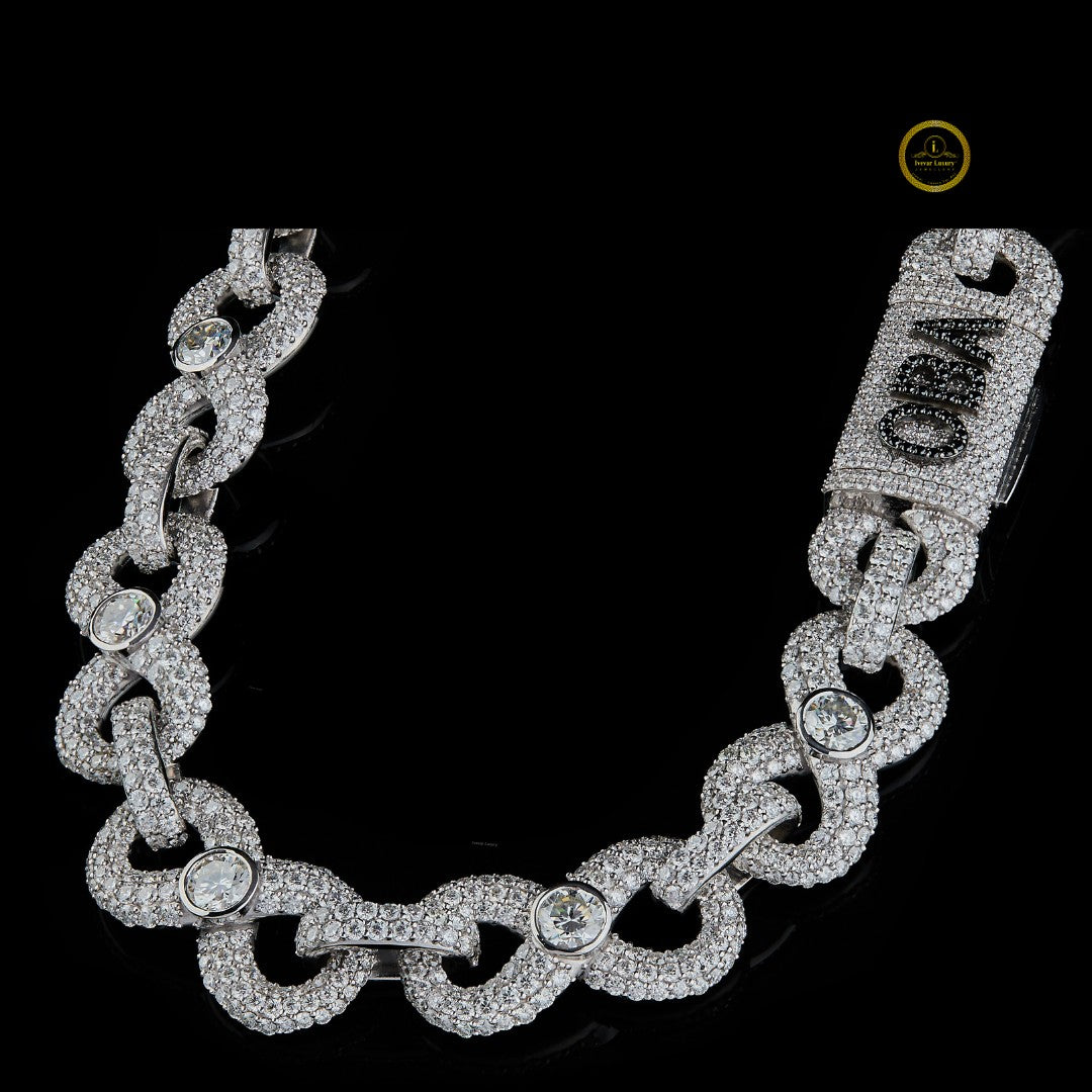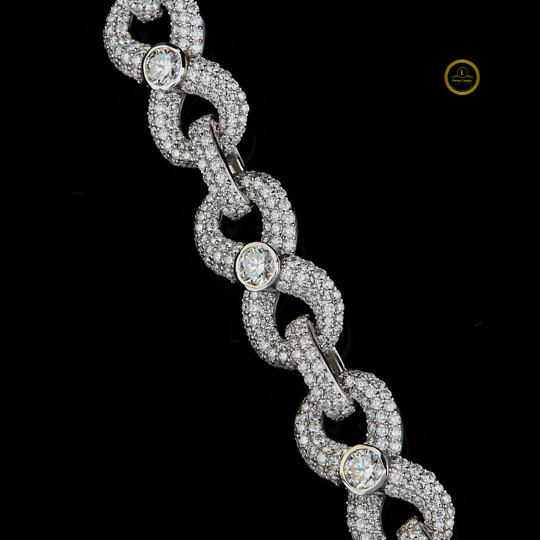 This is an opulent custom chain, likely a necklace, featuring a dense covering of moissanite 'diamonds' set across intricate links. The design appears to be a variation of a link-style chain, with a heavily iced-out surface that maximizes sparkle and brilliance.