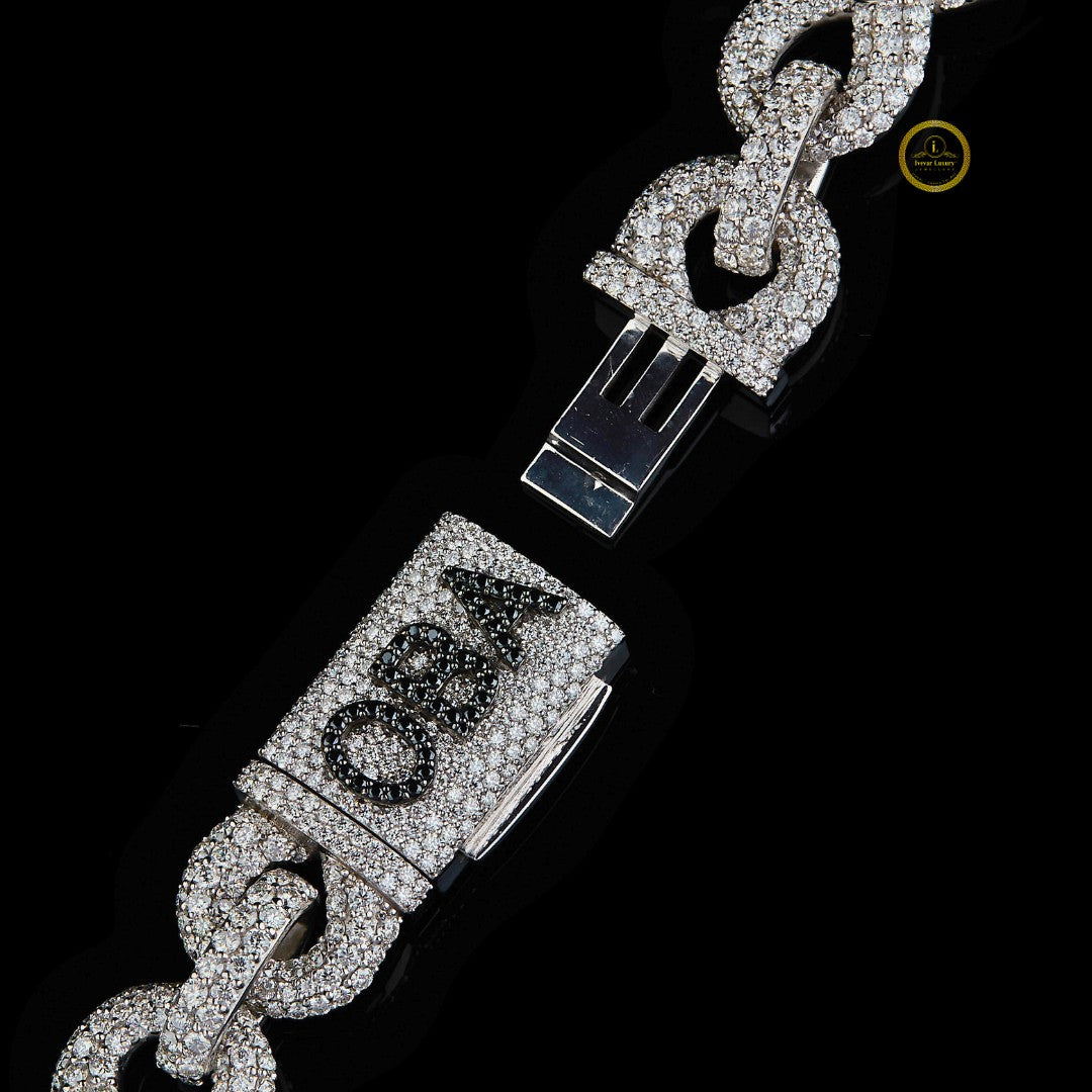 A distinctive feature is the custom rectangular clasp or bar element, which is also fully paved with stones and includes engraved text, which appears to read "OBA" vertically, adding a personalized touch. The piece exhibits high-end craftsmanship often associated with luxury jewelry. The overall aesthetic is bold, flashy, and designed for maximum visual impact, fitting the hip-hop or luxury streetwear style.