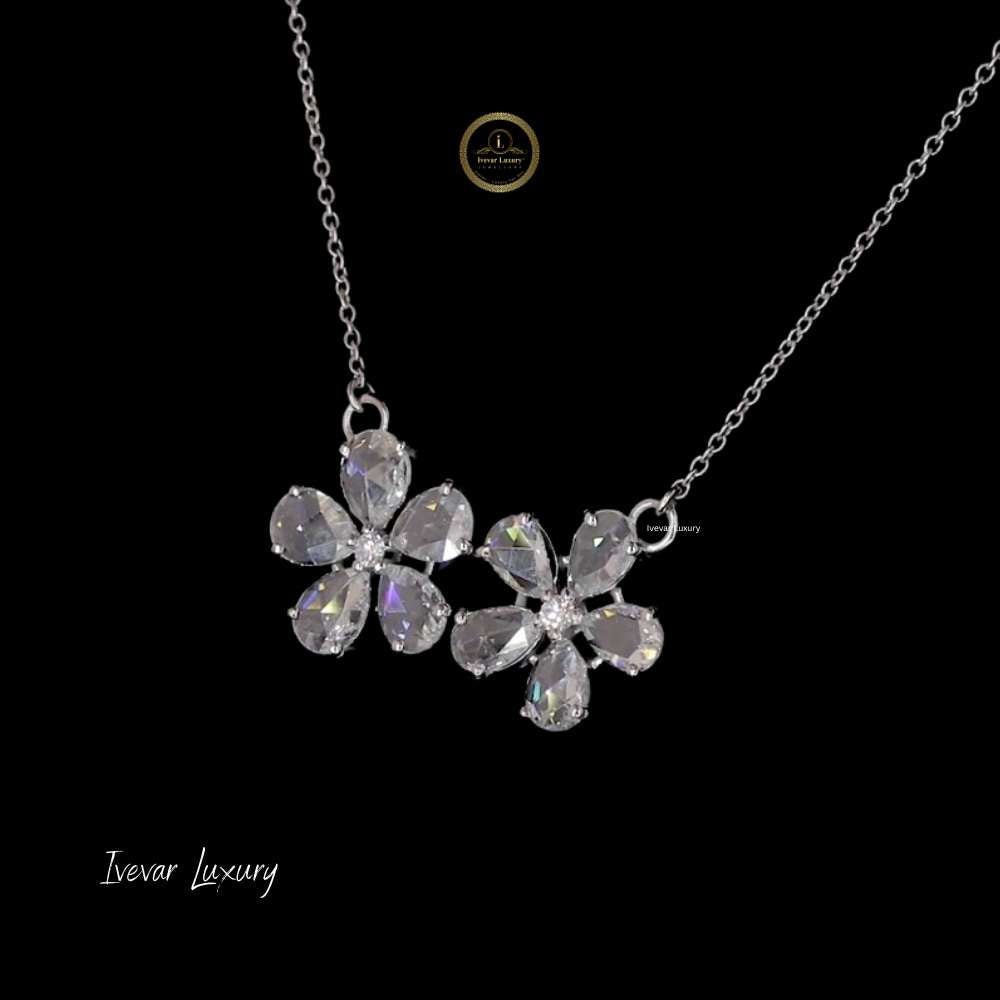 This luxurious 14k white gold necklace features an antique-inspired design with two interconnected, diamond-encrusted floral pendants. The larger and smaller blossoms are intricately crafted using rose-cut natural diamonds for the petals, which give off a soft, romantic shimmer unlike the intense sparkle of modern brilliant cuts. These main stones are beautifully framed by a pavé halo of smaller brilliant-cut diamonds, maximizing the overall glow. Suspended from a delicate white gold chain, this necklace offers a refined blend of vintage charm and contemporary elegance. The double floral motif symbolizes connection and growth, making it a meaningful and exquisite statement piece.