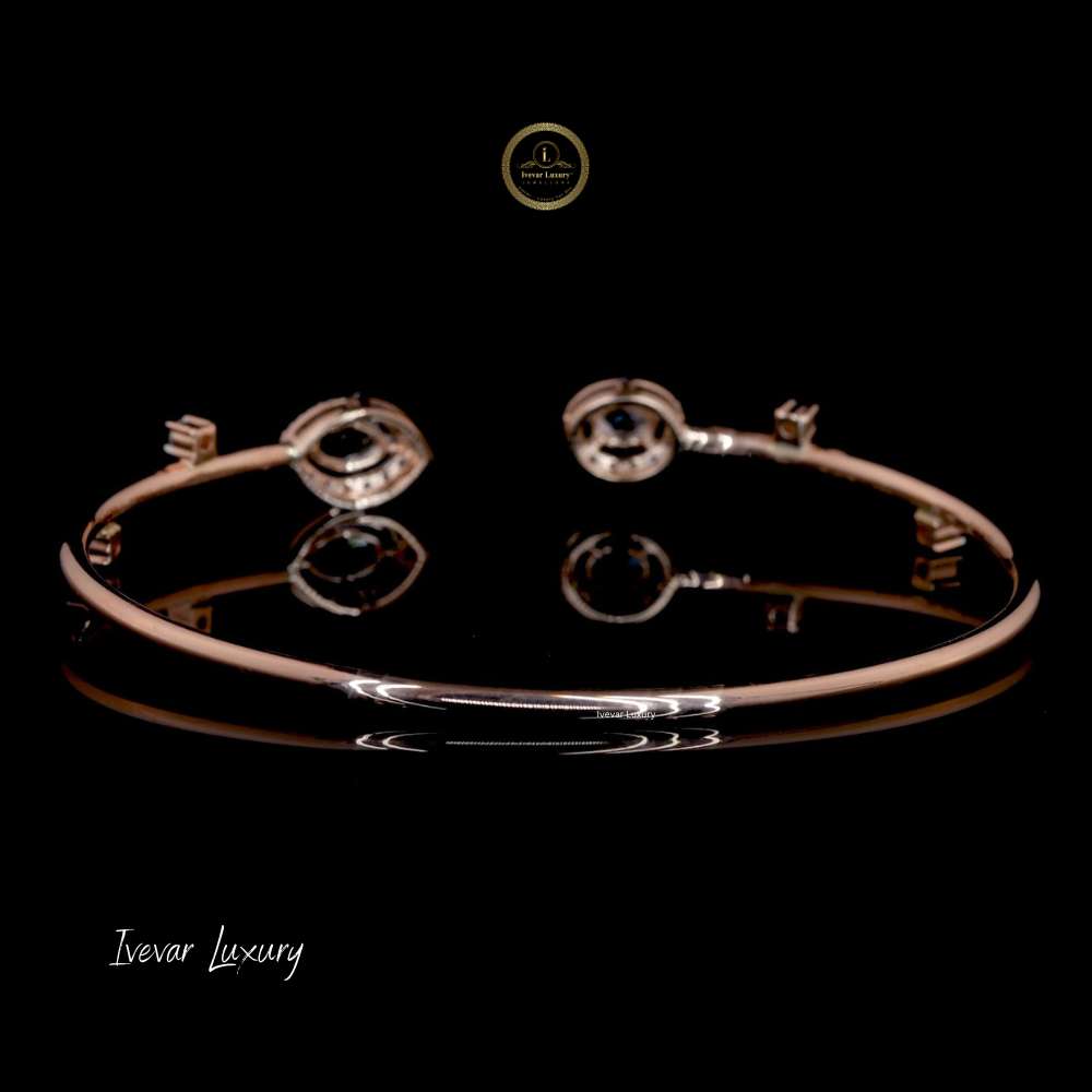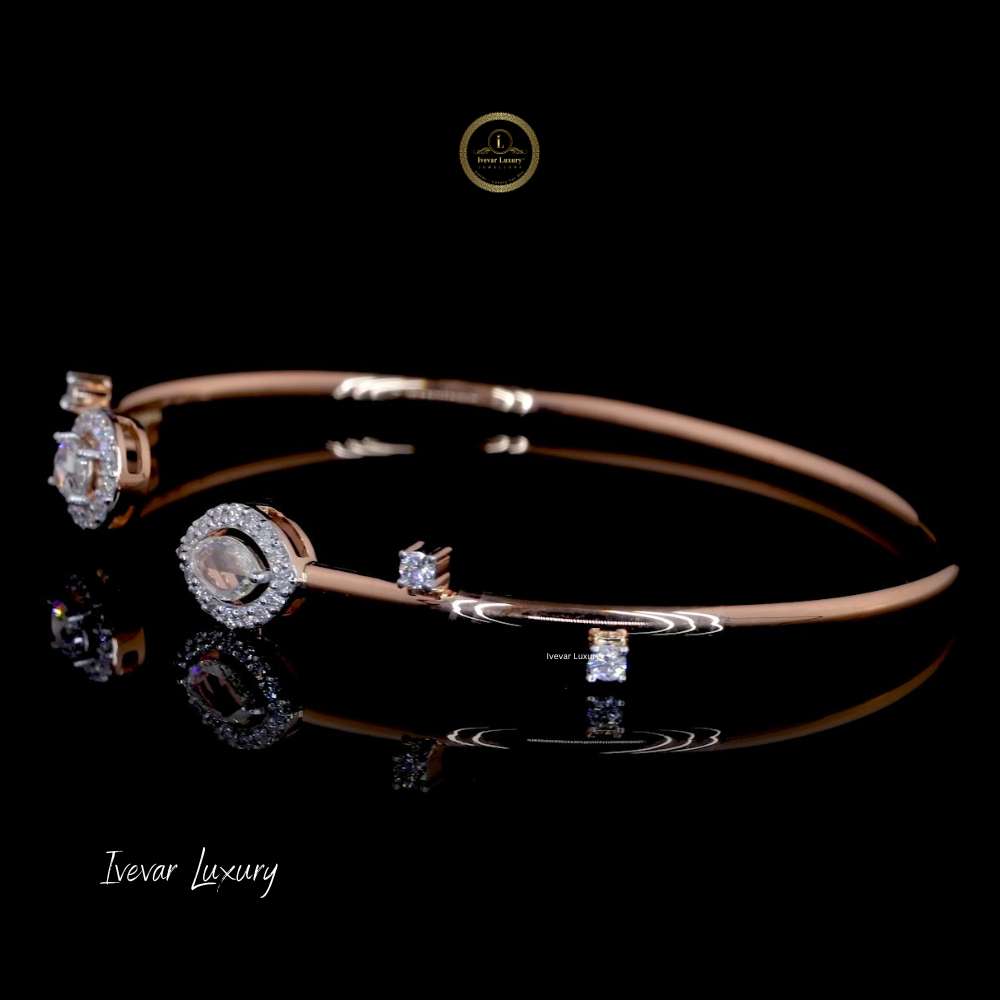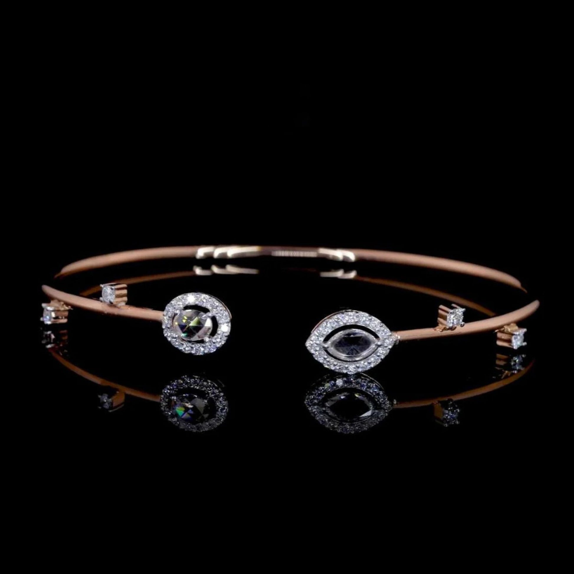 The focal point of the piece is the opposing tips, set with two distinct shapes of rose-cut natural diamonds: one circular and one marquise (or navette). Both central stones are surrounded by a brilliant halo of smaller, pave-set diamonds, enhancing their sparkle. The slim bracelet shank is further accented with scattered square or princess-cut diamonds, adding subtle detail. This bracelet embodies minimalist luxury with a unique asymmetrical layout, making it a chic and fashionable statement piece.