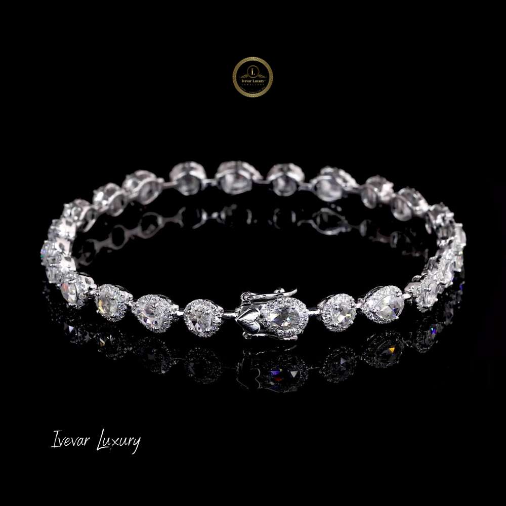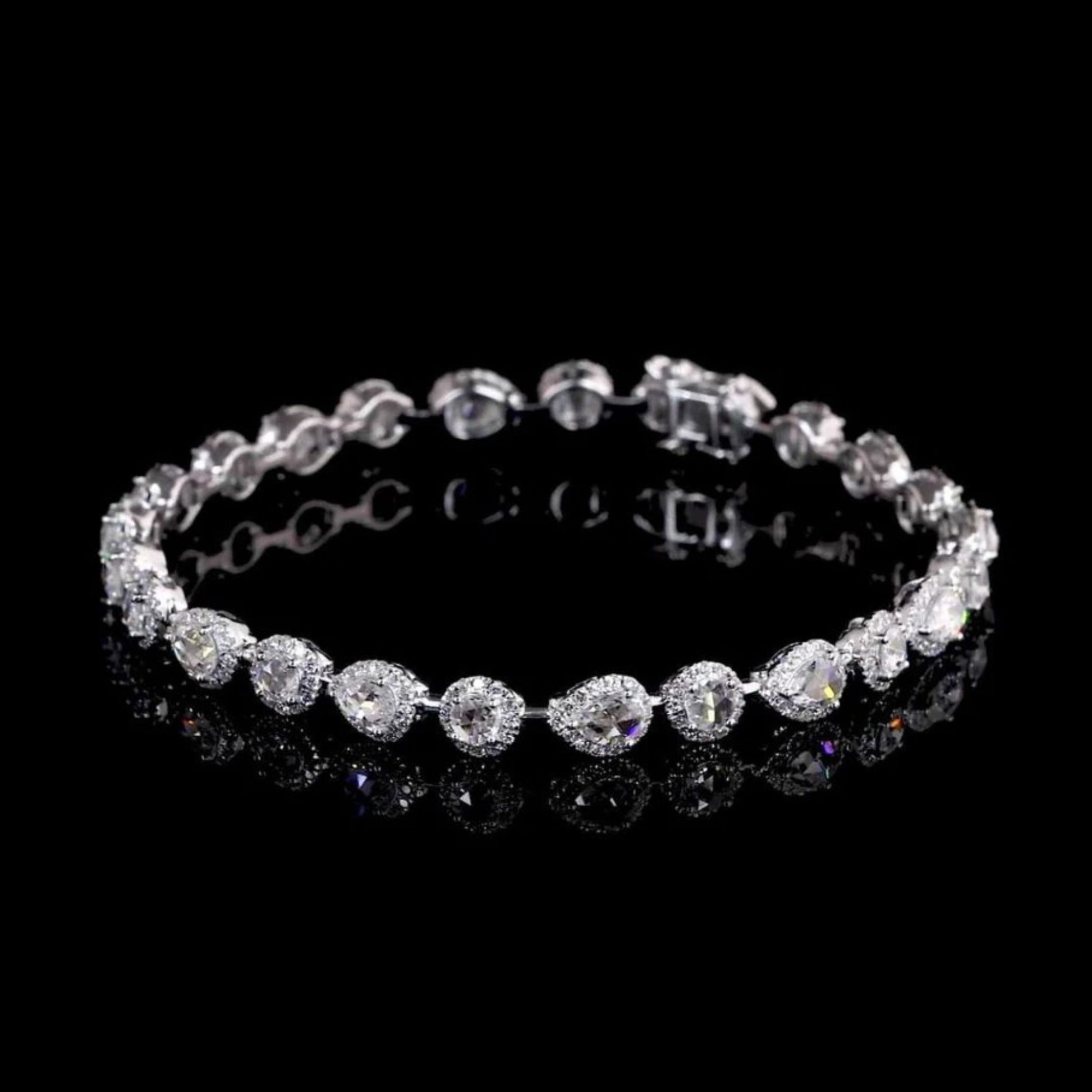 This stunning 14k white gold bracelet showcases the timeless elegance of rose-cut natural diamonds. Featuring a continuous row of dazzling stones, each diamond is likely set in a halo style, where a border of smaller stones enhances the brilliance and perceived size of the central, rose-cut diamond. The intricate setting and highly polished white gold create a breathtaking sparkle against the dark background. The rose cut, known for its flat base and dome-shaped crown with triangular facets, offers a unique, antique-inspired glow that is softer and more romantic than modern brilliant cuts. This piece represents a sophisticated blend of classic design and luxurious materials, making it a perfect heirloom or an exquisite statement accessory for special occasions. It fastens securely with a box clasp.