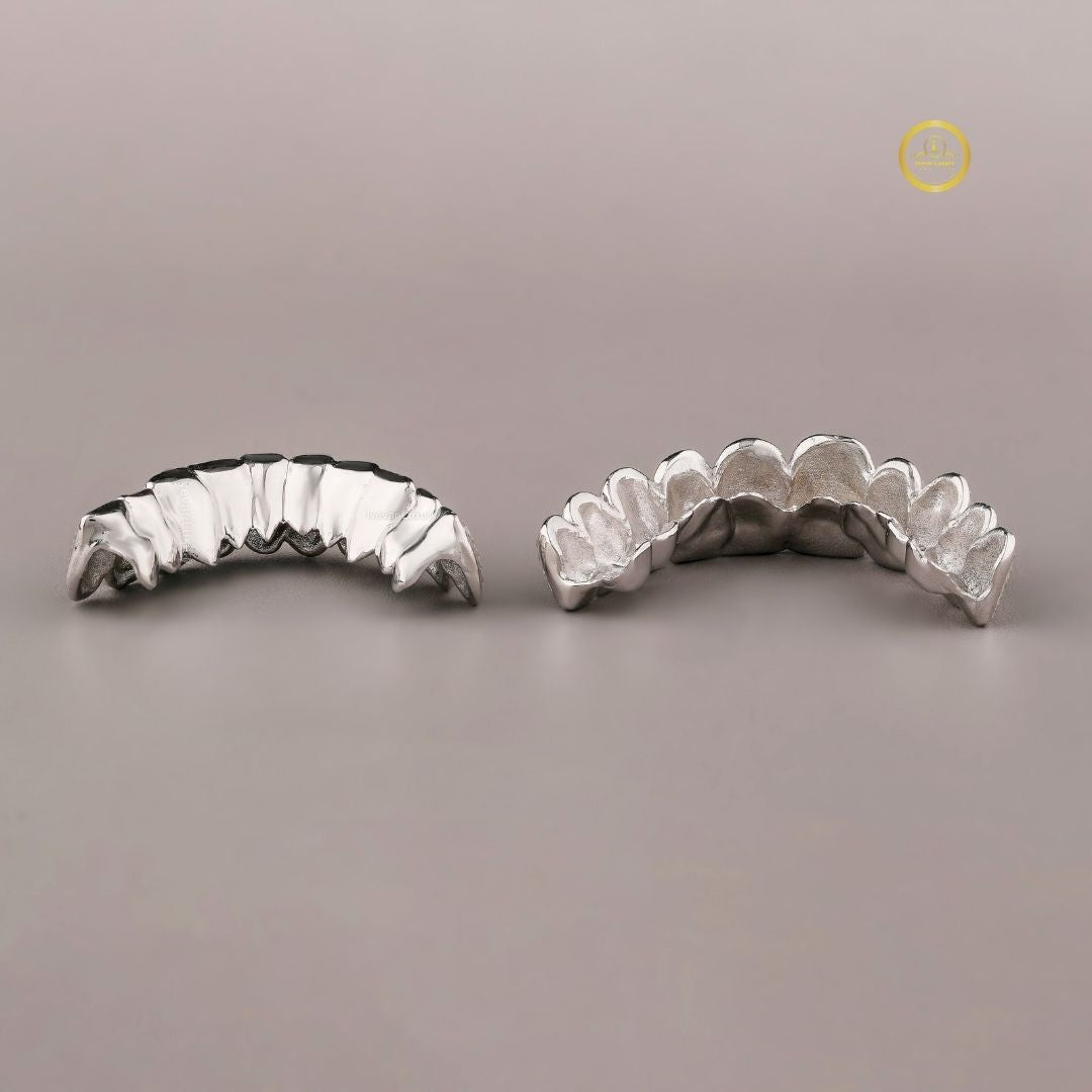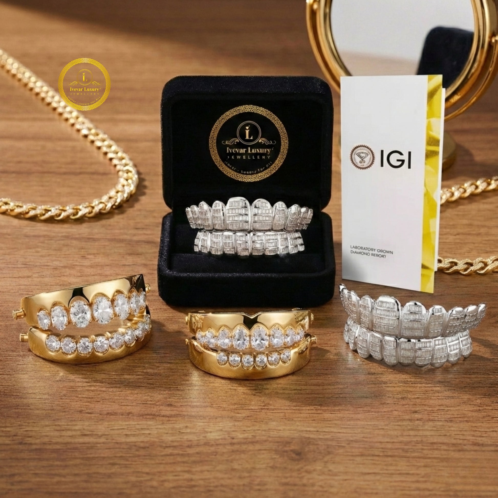 The image displays a pair of dazzling custom teeth grillz, designed for both the upper and lower teeth. These pieces are lavishly covered with lab-grown diamonds, offering the brilliance and luxury of natural diamonds but at a more accessible price point and with an ethical sourcing benefit.