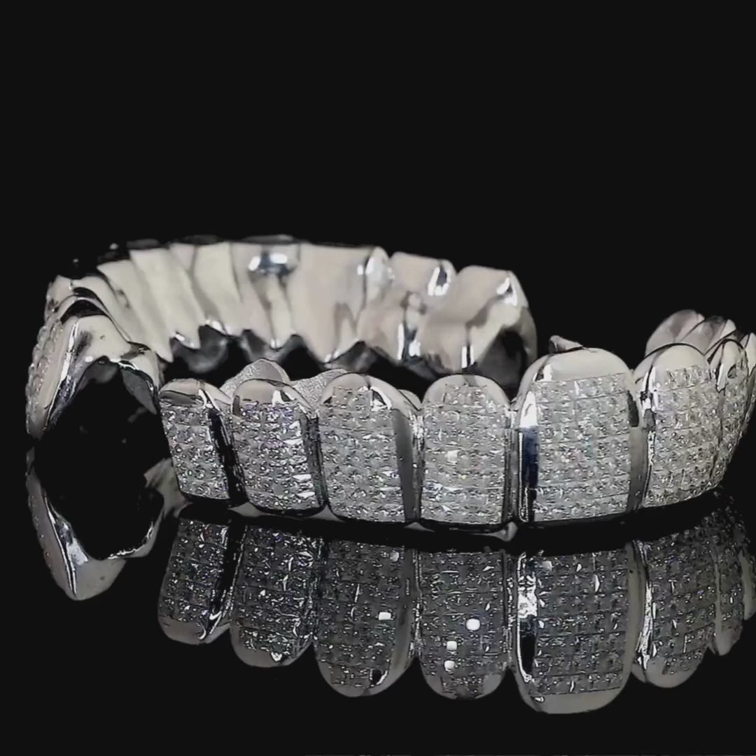 Each tooth is precisely fitted with a surface paved in multiple smaller diamonds, creating a continuous, high-shine iced-out appearance. The grillz appear to be crafted from a polished white metal, likely silver or white gold, enhancing the stones' luminosity. The branding suggests they are a luxury, custom-fitted item, ensuring maximum comfort and a secure fit. These statement pieces are the epitome of high-end hip-hop and streetwear jewelry.