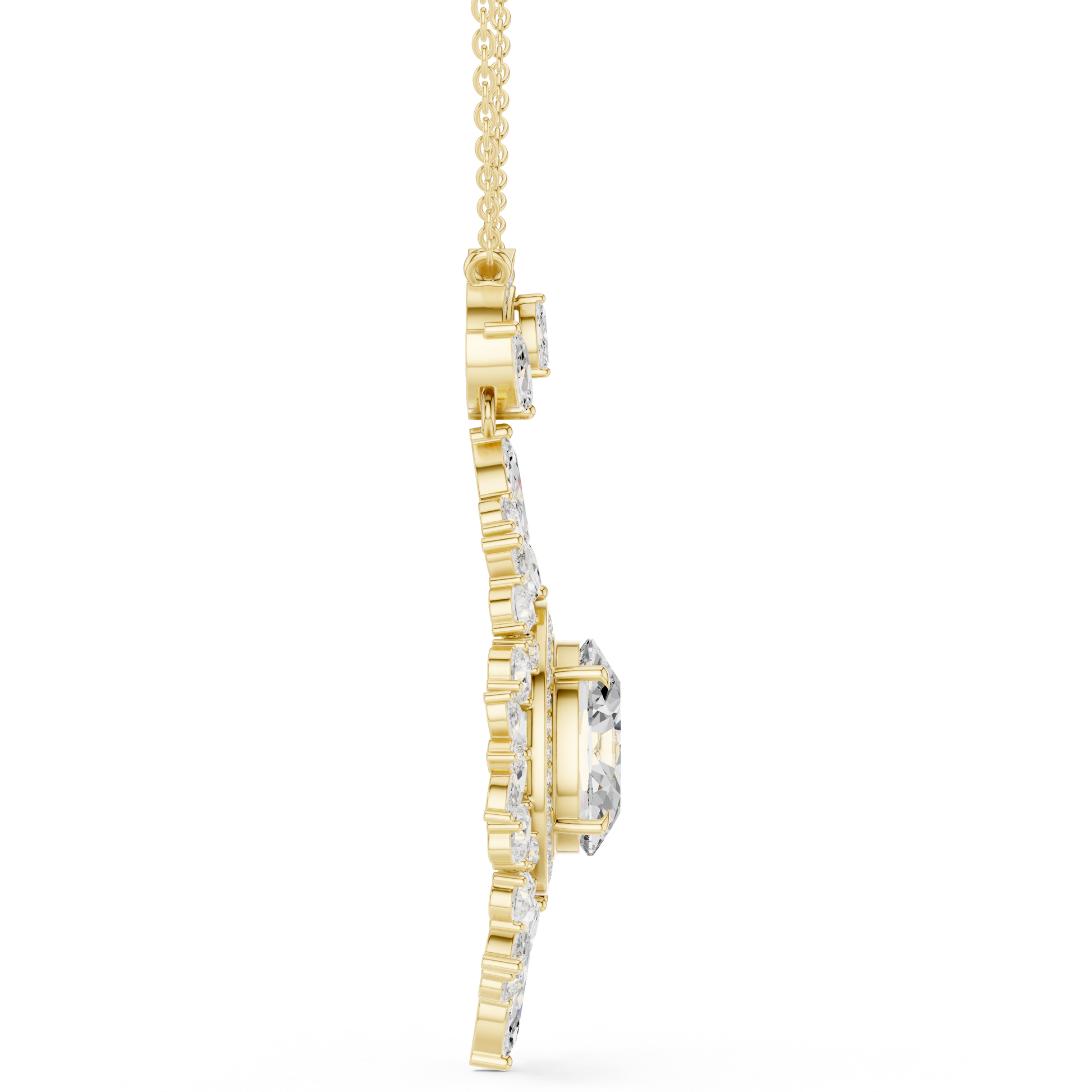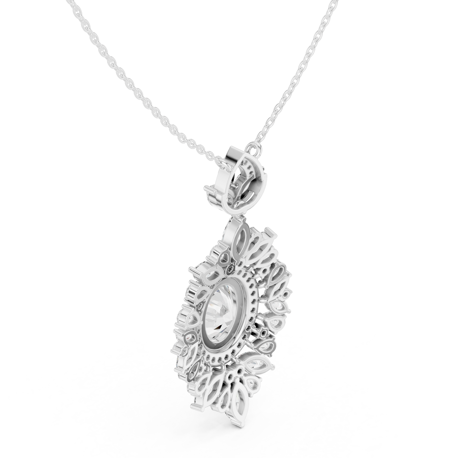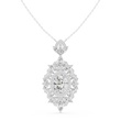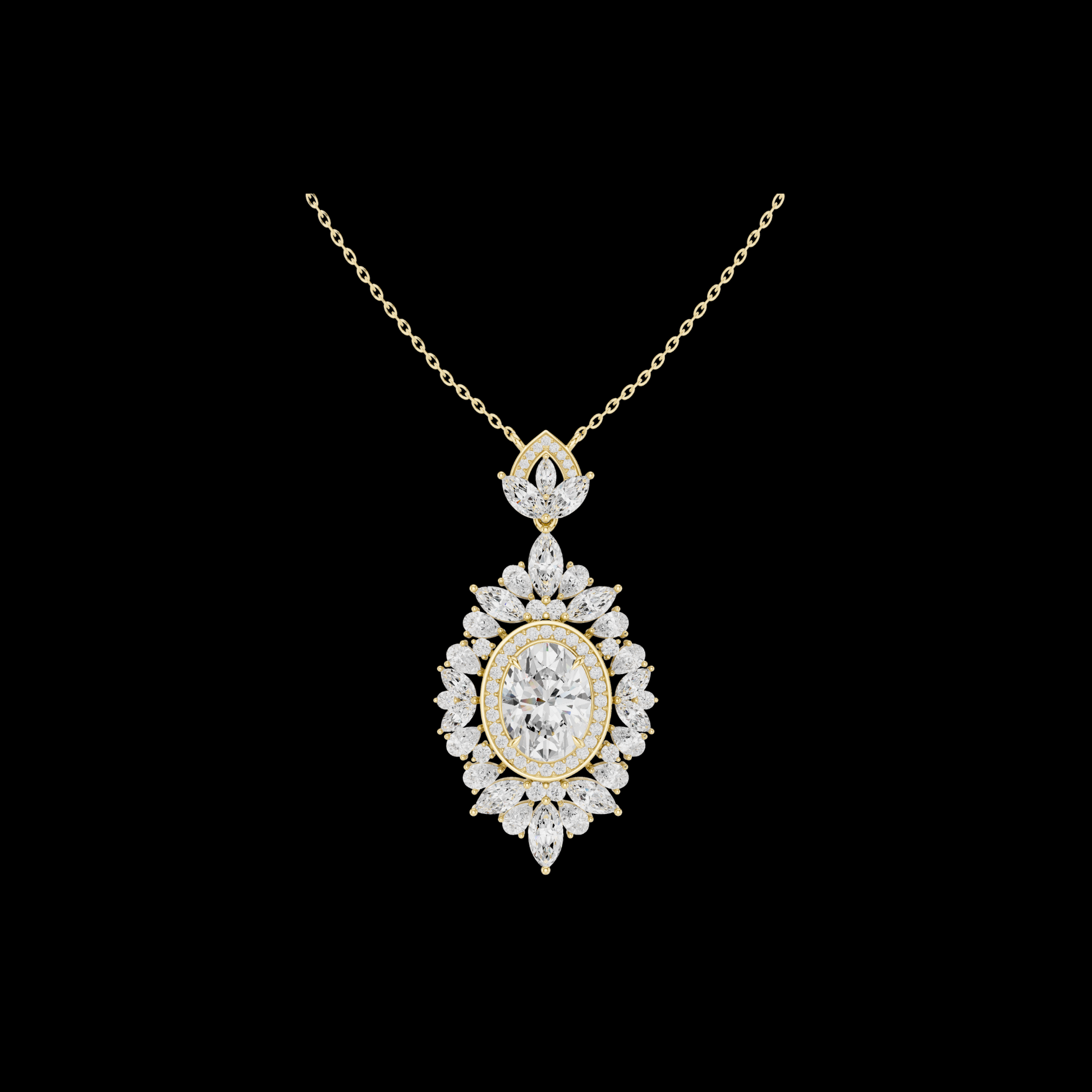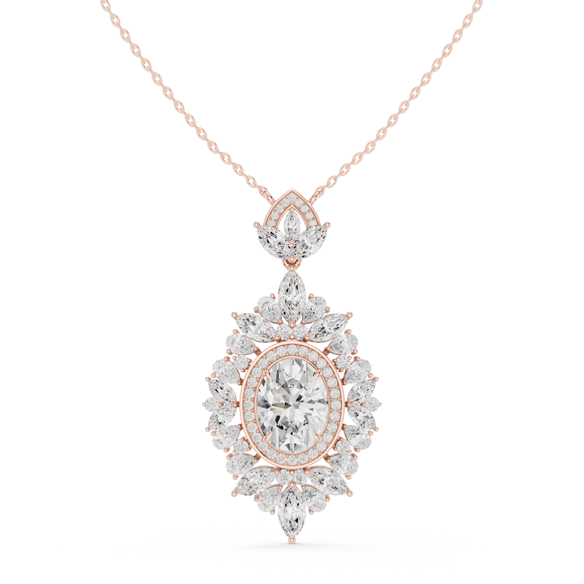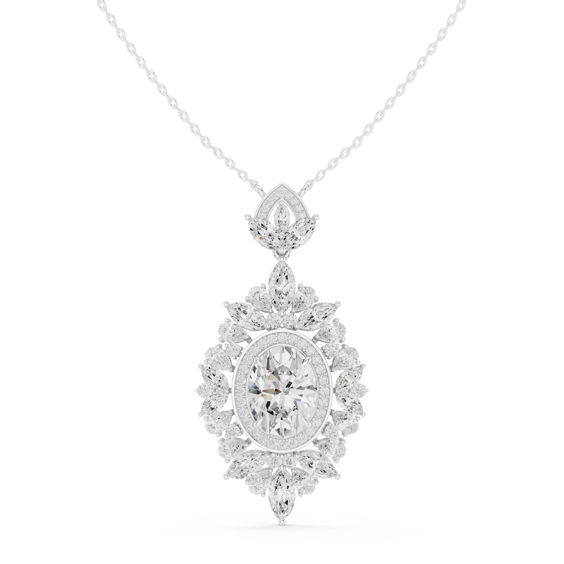 This breathtaking oval diamond halo pendant is a true statement of timeless elegance and refined craftsmanship. the centerpiece features a brilliant oval-cut diamond, encircled by a luminous halo of marquise-cut & round cut diamonds arranged in a floral-inspired silhouette. The intricate detailing and layered sparkle create depth, brilliance, and a regal presence that captures light from every angle.
