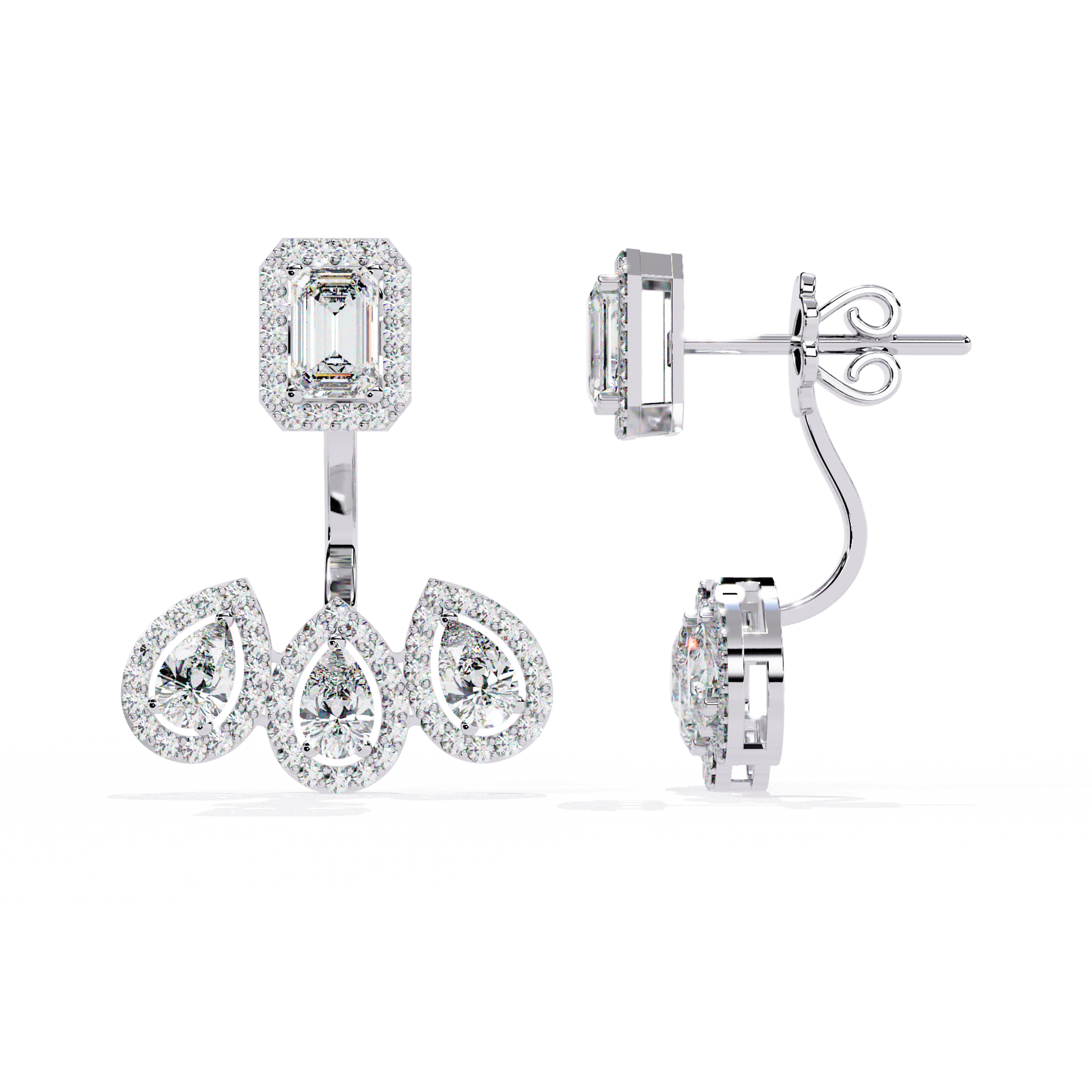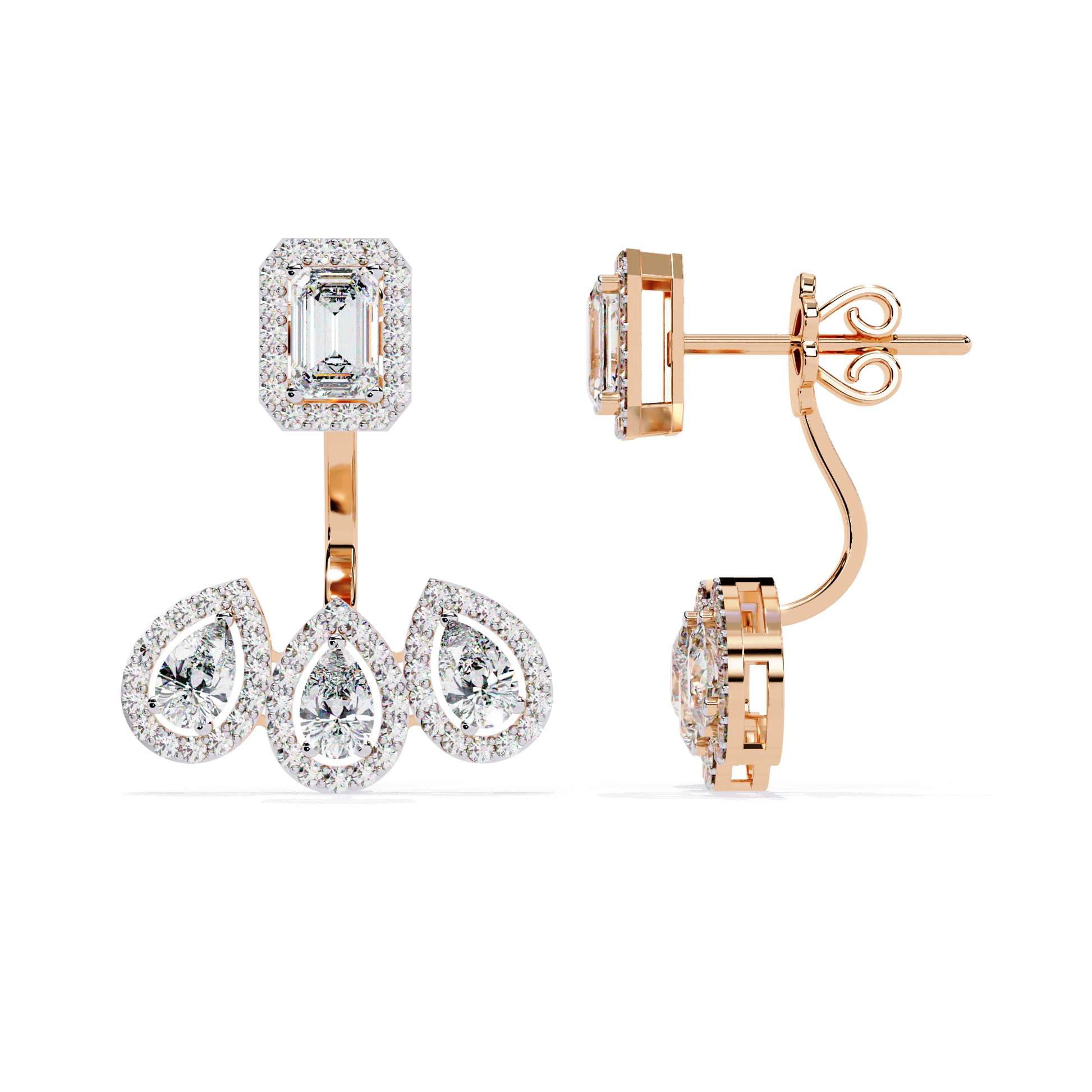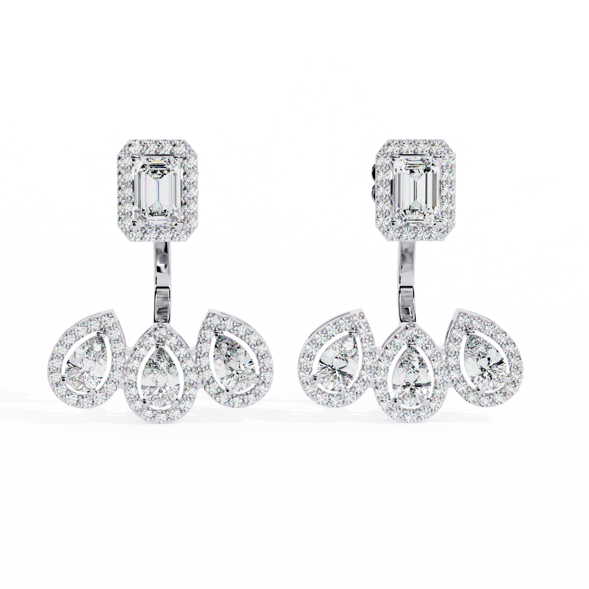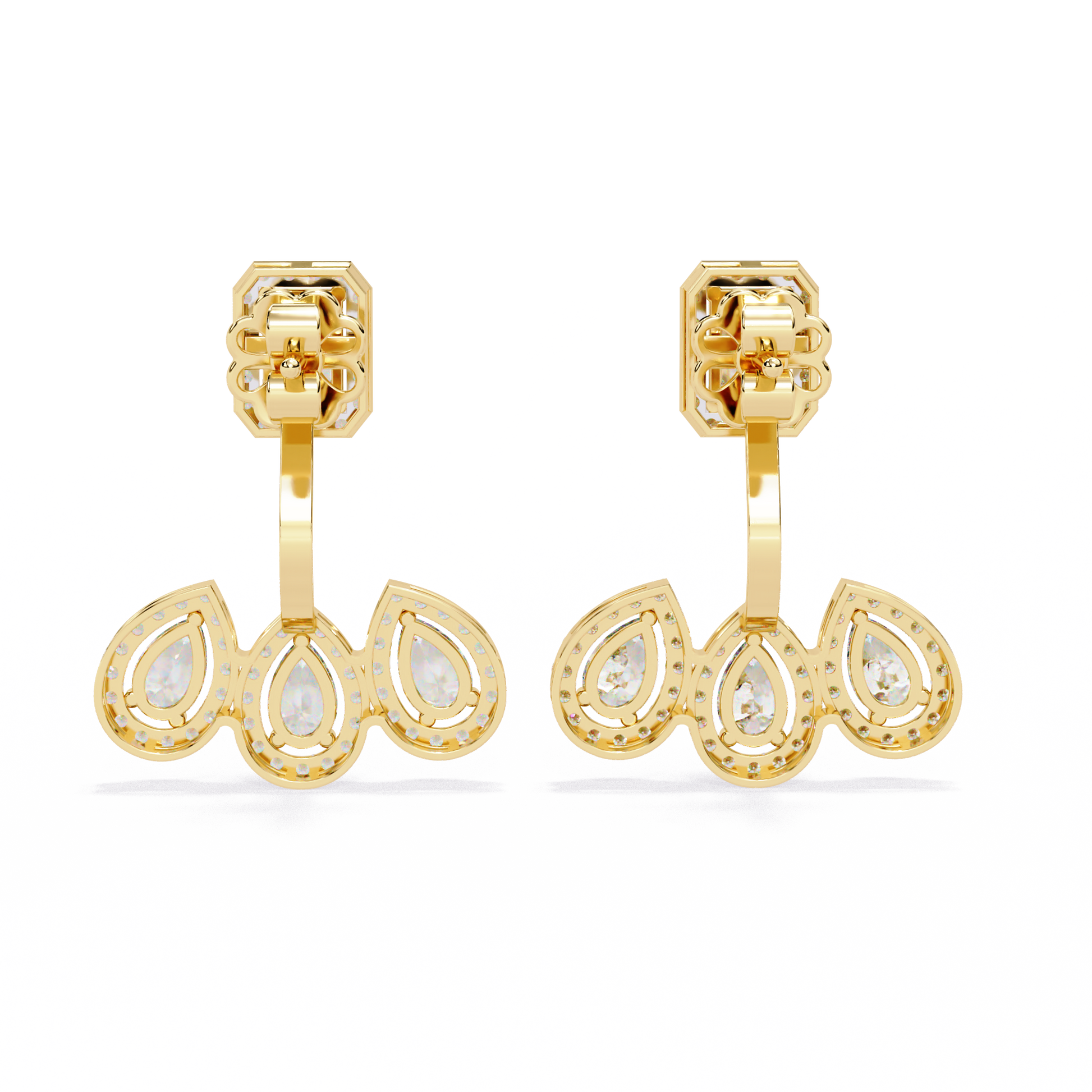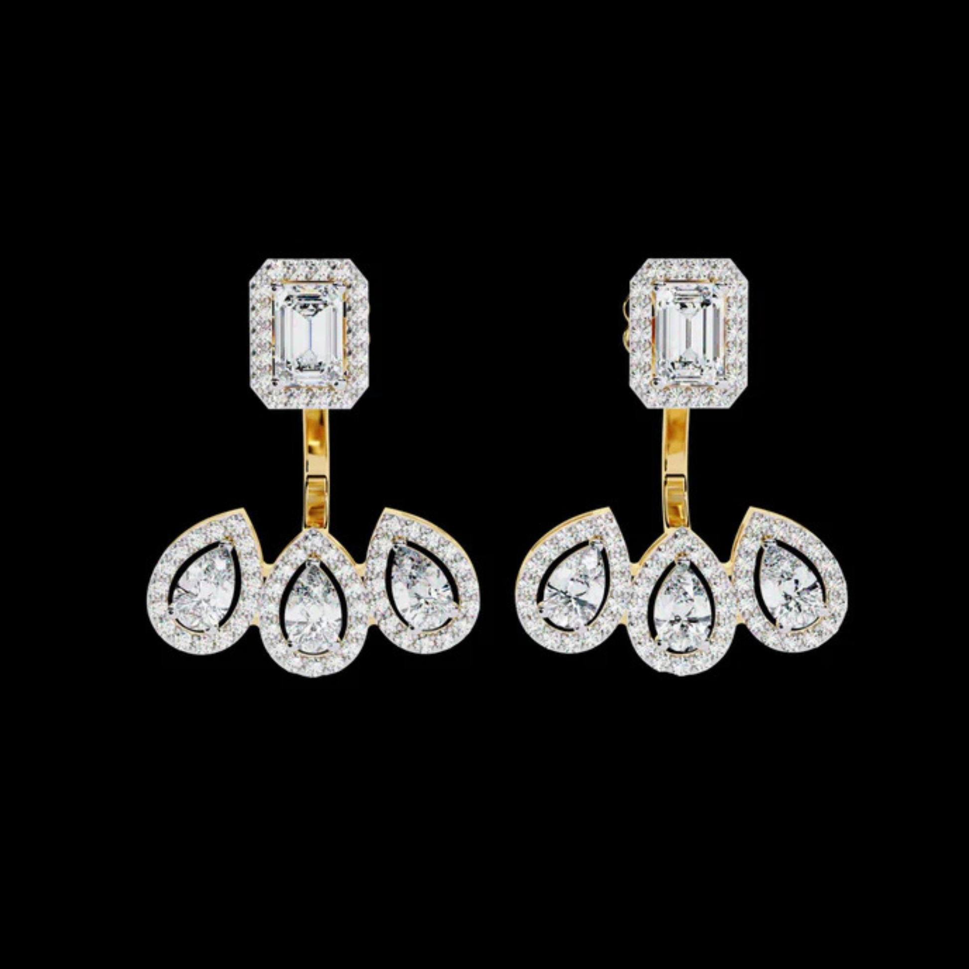 Exude sophistication and radiance with these Emerald-Cut and Pear Diamond Halo Drop Earrings. Meticulously crafted in luminous yellow gold, each earring features a striking emerald-cut diamond at the top, gracefully complemented by three pear-shaped diamonds suspended below. The surrounding halos of fine pavé-set stones enhance the brilliance, creating a captivating dance of light and dimension. A flawless blend of modern artistry and timeless glamour, these earrings are perfect for grand evenings or refined celebrations.