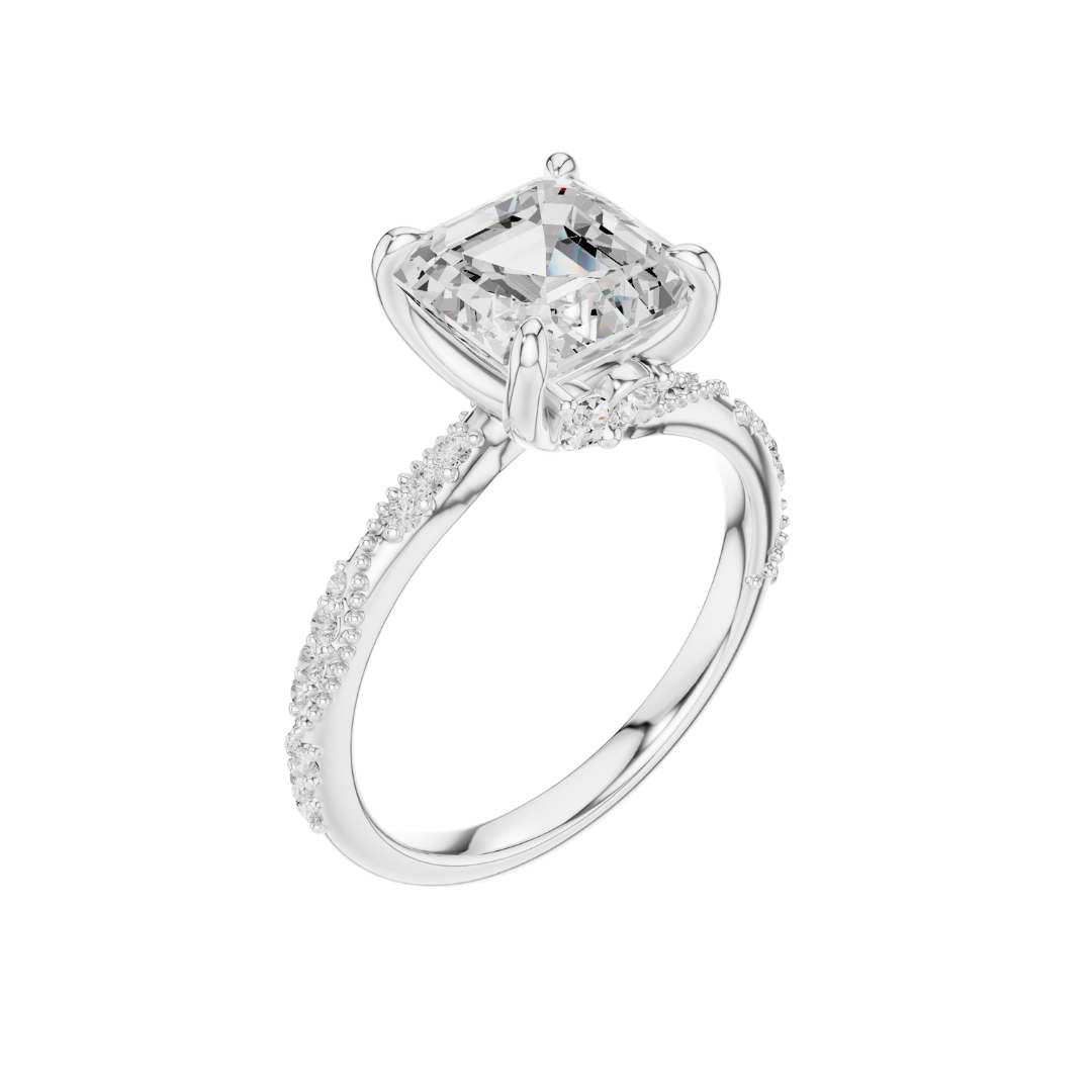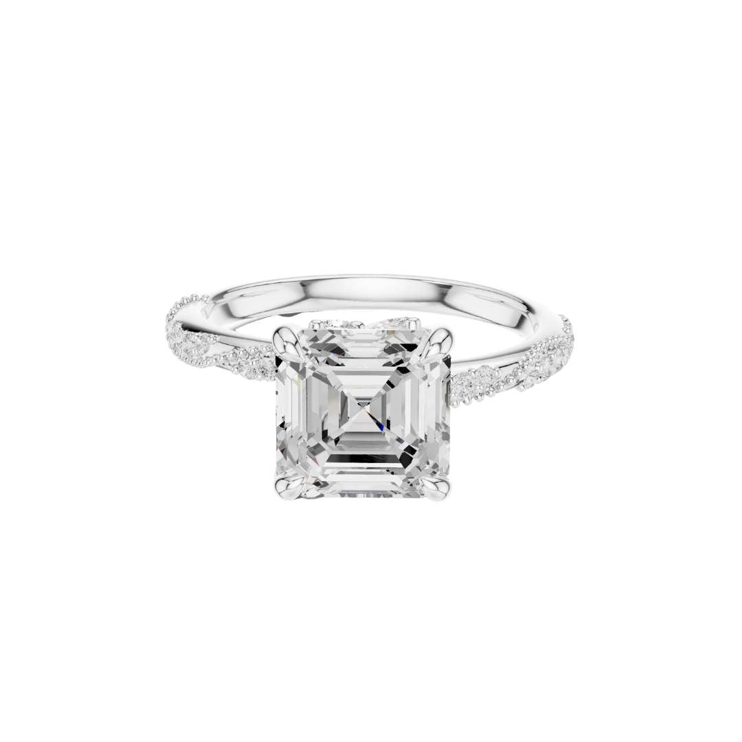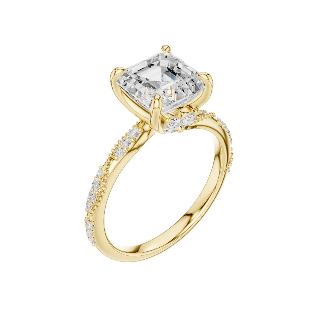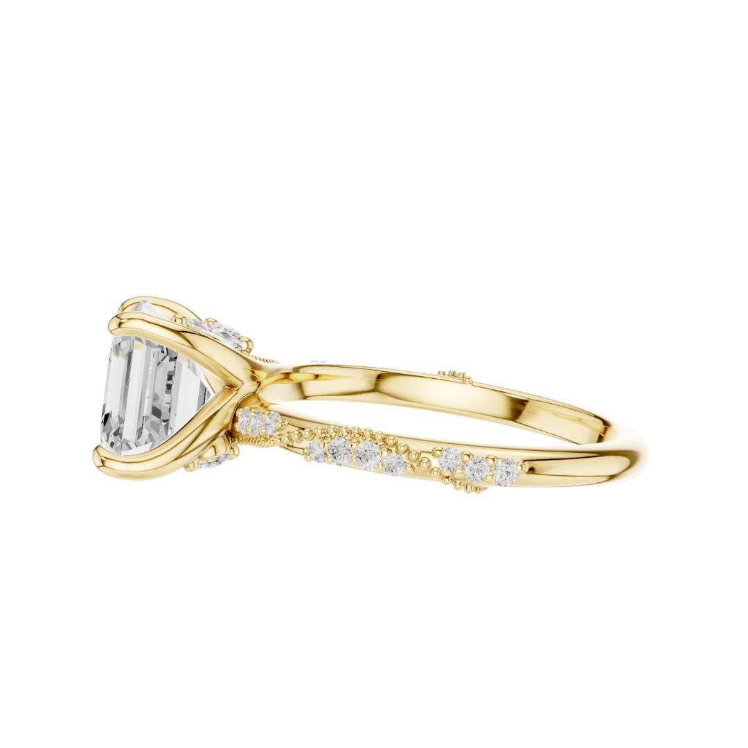 This elegant engagement ring features a striking Emerald Square-cut diamond set in a classic four-prong mounting, allowing its crisp facets and hall-of-mirrors brilliance to take center stage. The band crafted in polished gold, is adorned with a delicate line of pave diamonds that add subtle sparkle without overwhelming the centerpiece. Its blend of vintage sophistication and modern refinement makes this ring a timeless symbol of love and style.
