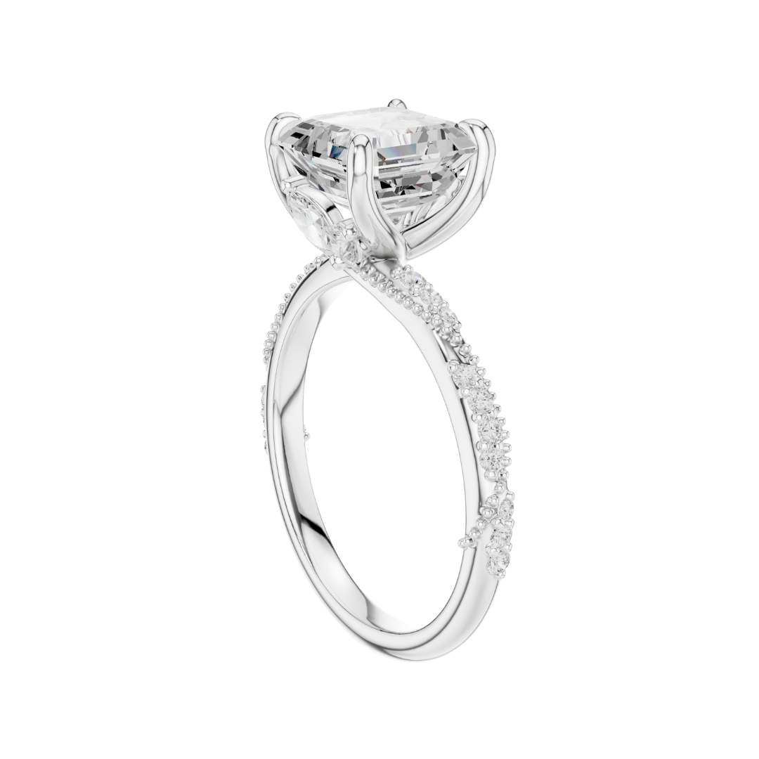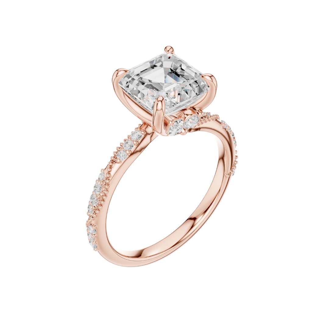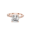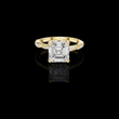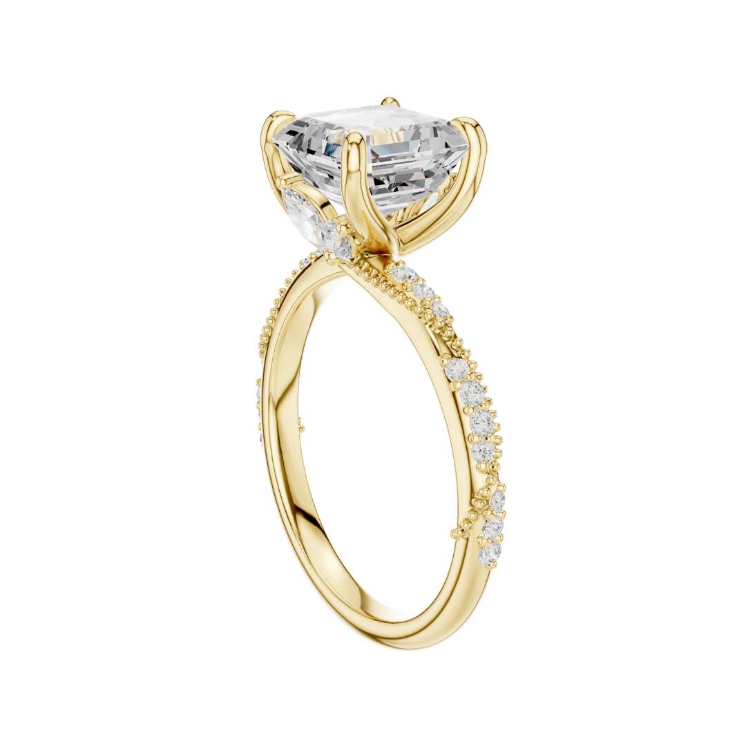 This elegant engagement ring features a striking Emerald Square-cut diamond set in a classic four-prong mounting, allowing its crisp facets and hall-of-mirrors brilliance to take center stage. The band crafted in polished gold, is adorned with a delicate line of pave diamonds that add subtle sparkle without overwhelming the centerpiece. Its blend of vintage sophistication and modern refinement makes this ring a timeless symbol of love and style.