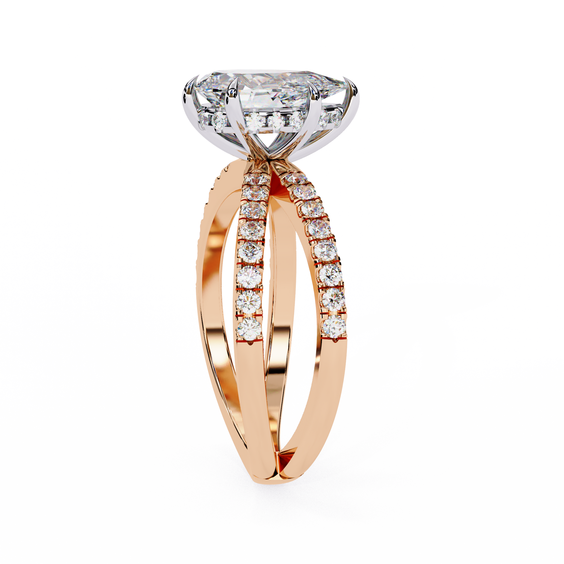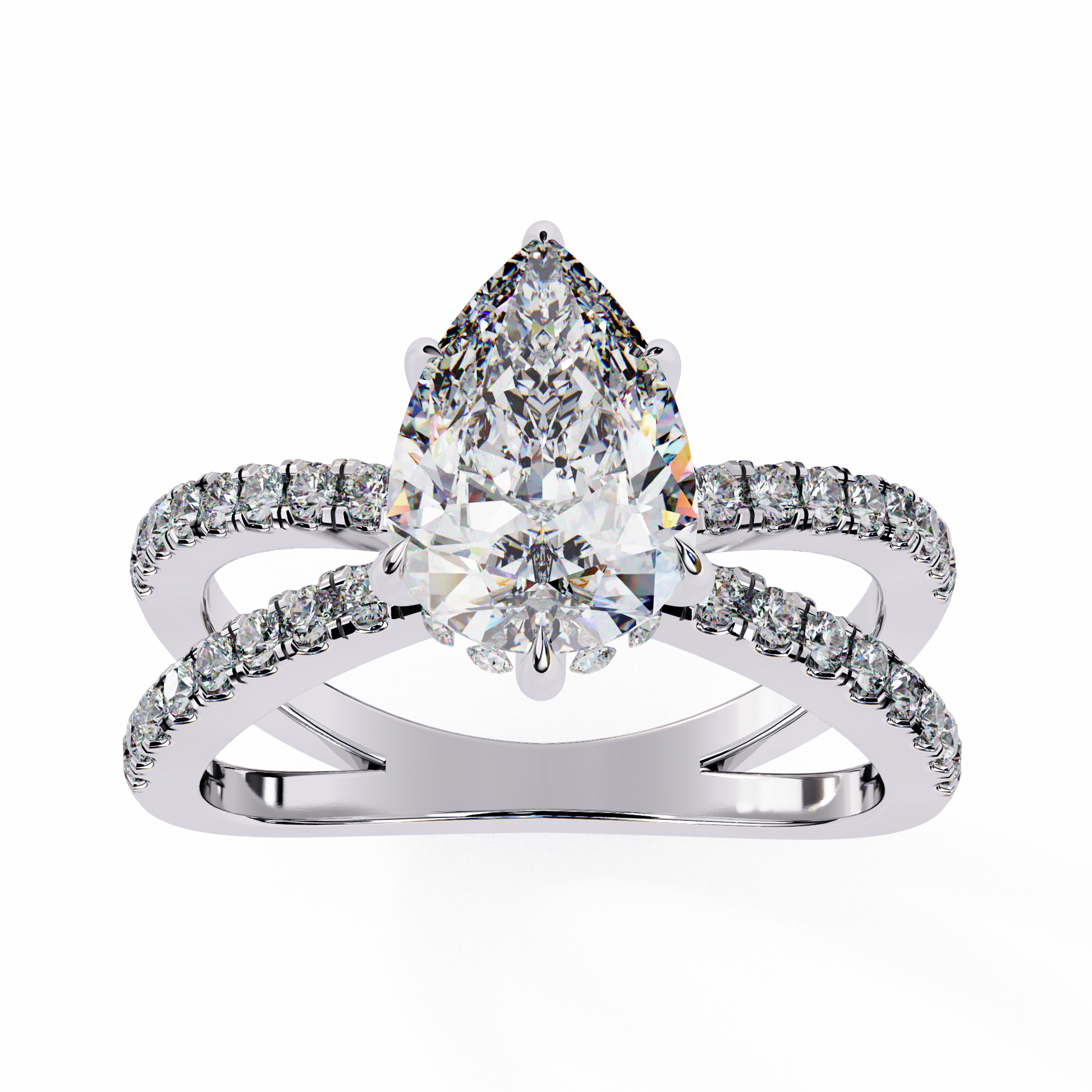 This breathtaking engagement ring features a luminous pear-cut diamond that captures attention with its extraordinary sparkle and clarity. The elegant double pave bands, adorned with rows of brilliant micro-diamonds, create a captivating frame that enhances the center stone’s radiant presence. Crafted with meticulous attention to detail, this ring exudes modern sophistication, timeless beauty, and high-end craftsmanship, making it the perfect symbol of enduring love and refined luxury.