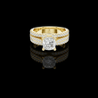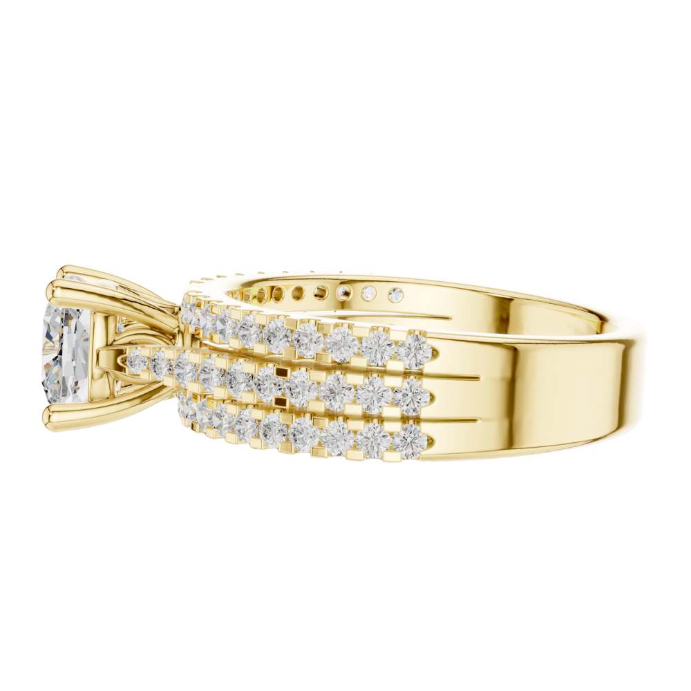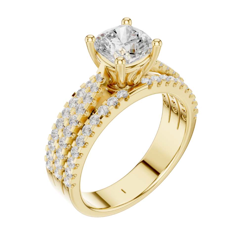 This luxurious ring showcases a brilliant cushion-cut diamond held in a classic four-prong setting, beautifully elevated by a stunning triple-row micro-pave band crafted in polished gold. The tightly set pave diamonds wrap around the band in three sparkling rows, creating a dramatic, high-impact brilliance that enhances the bold center stone. Elegant, radiant, and irresistibly glamorous, this piece is perfect for someone who loves timeless style with a lavish touch by Ivevar.