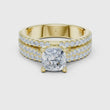 This luxurious ring showcases a brilliant cushion-cut diamond held in a classic four-prong setting, beautifully elevated by a stunning triple-row micro-pave band crafted in polished gold. The tightly set pave diamonds wrap around the band in three sparkling rows, creating a dramatic, high-impact brilliance that enhances the bold center stone. Elegant, radiant, and irresistibly glamorous, this piece is perfect for someone who loves timeless style with a lavish touch by Ivevar.
