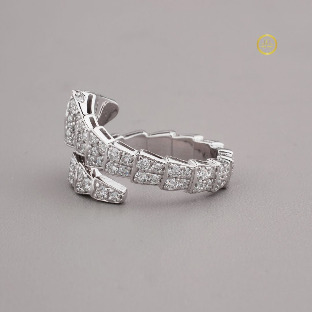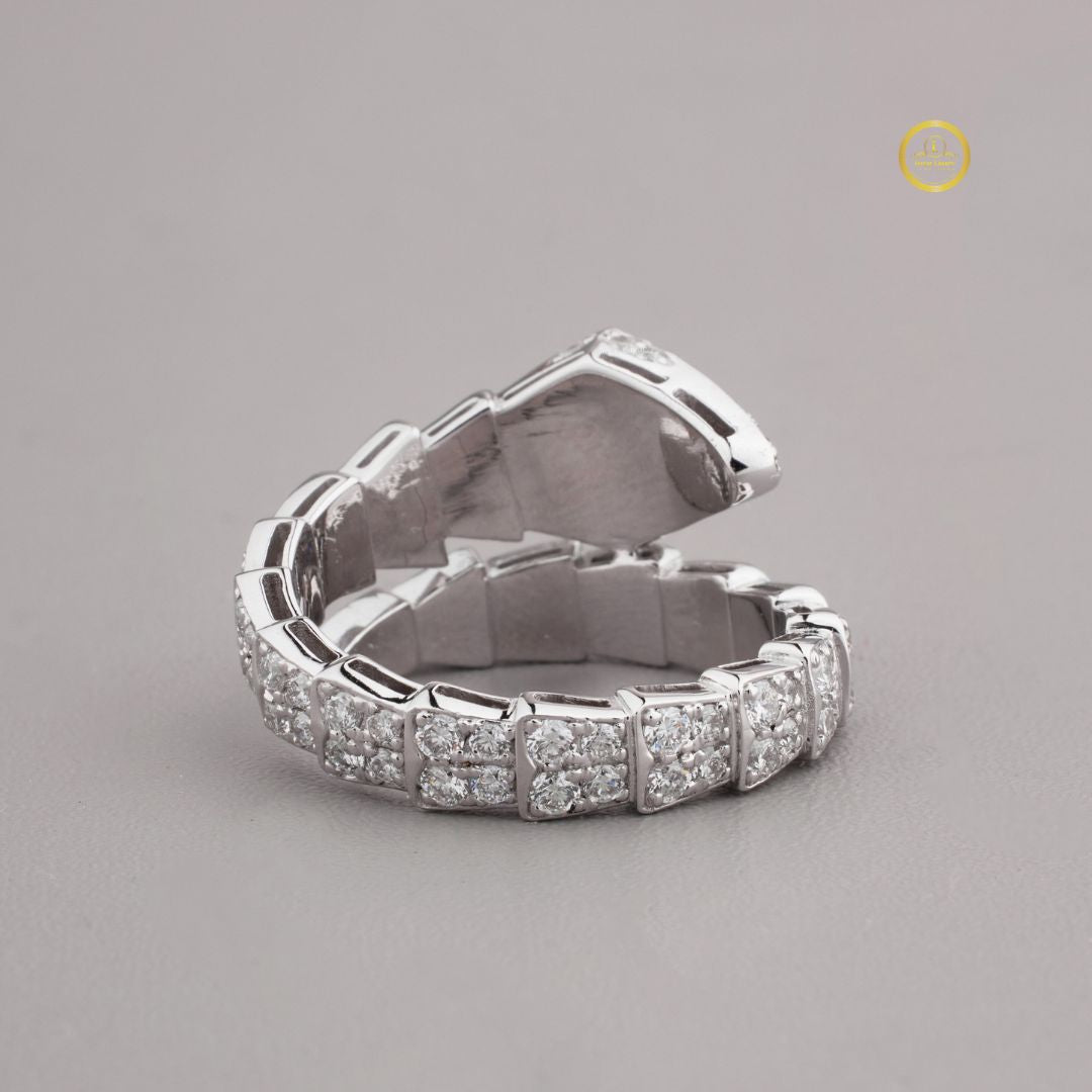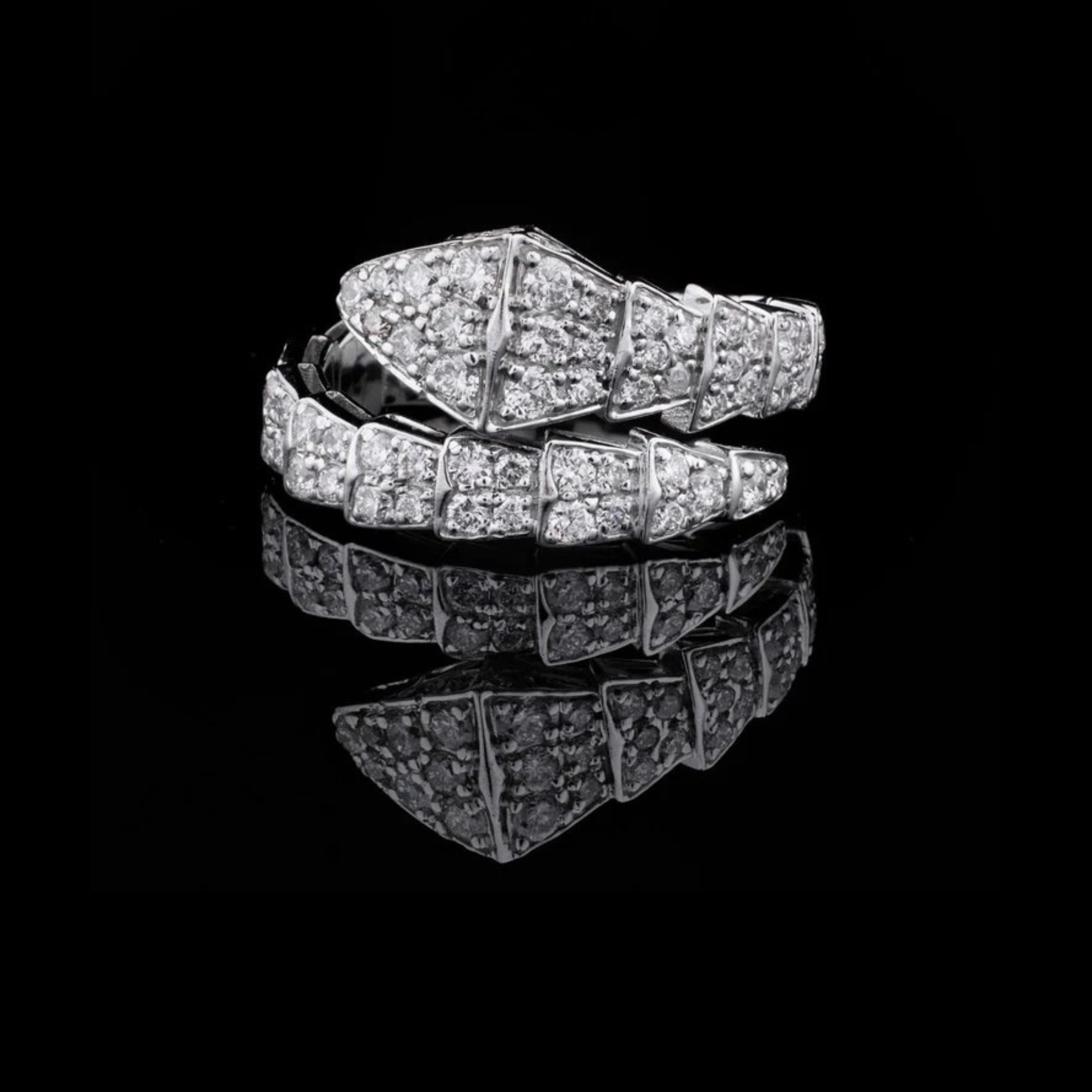 This striking ring features a bold, serpent-inspired wrap design crafted in polished white metal and covered in shimmering pave-set round diamonds. Its articulated, scale-like segments create a dynamic, fluid silhouette that coils elegantly around the finger, giving it both a luxurious and fiercely modern character. The richly textured diamond surface enhances its brilliance, while the meticulous craftsmanship highlights every contour and curve, making this piece a captivating statement of sophistication and strength.