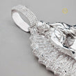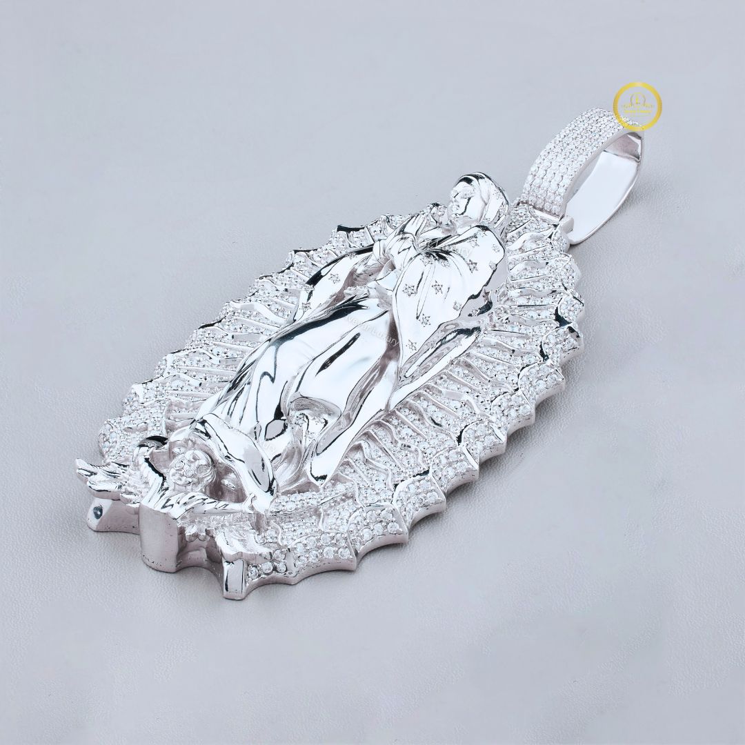 This striking pendant is a testament to luxurious custom jewelry, crafted in the detailed likeness of the Virgin Mary, often associated with the revered image of Our Lady of Guadalupe. The main figure is prominently set against an oval-shaped background, which is fully paved with brilliant moissanite stones to simulate a diamond-encrusted halo or radiant aura. The use of moissanite provides a high-sparkle, durable, and more accessible alternative to natural diamonds. The metal appears to be white gold or sterling silver, accentuating the icy white brilliance of the stones. The bail is also pave-set, ensuring 360-degree sparkle. It's a statement piece blending deep religious symbolism with contemporary, high-end hip-hop jewelry aesthetics.