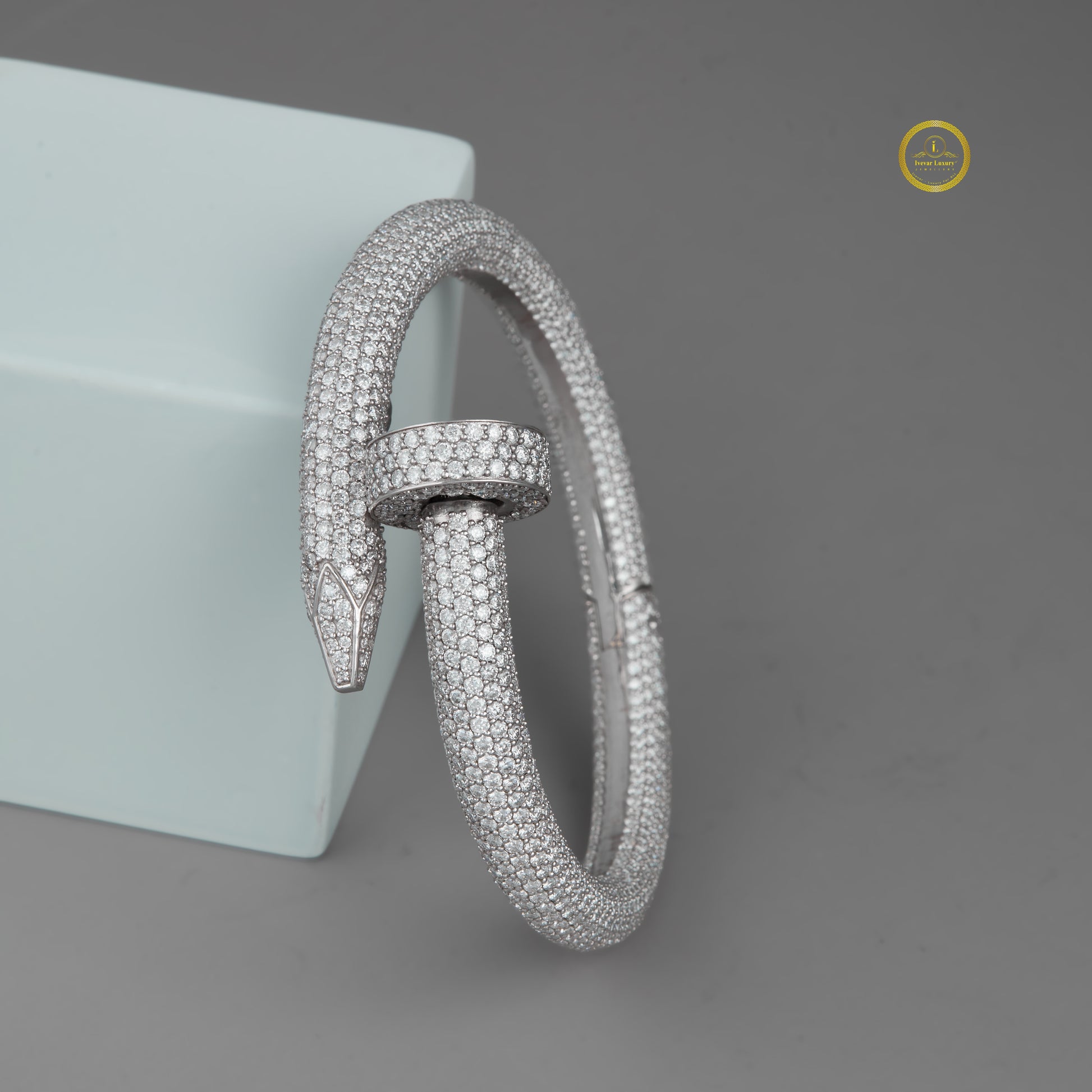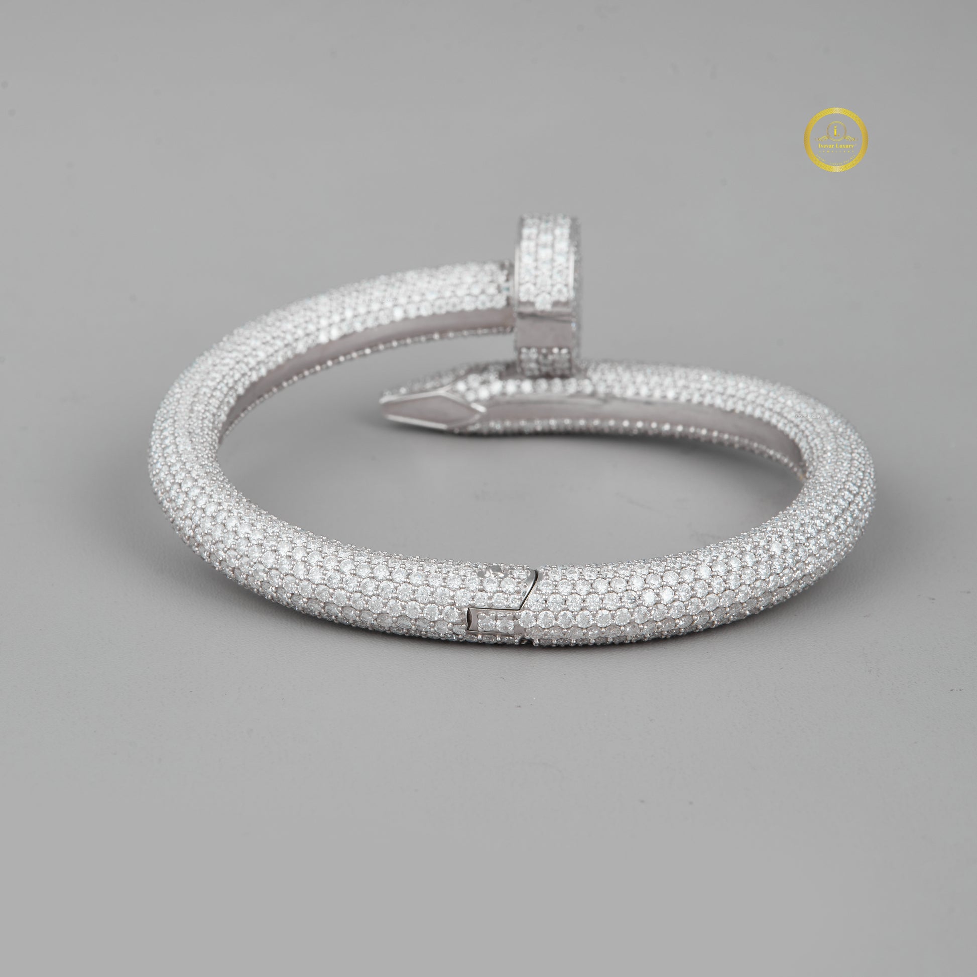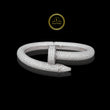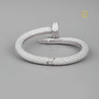 The bracelet is crafted in a silver-tone metal and cleverly mimics the shape of a nail bent into a circular form, with the head and point meeting/overlapping at the center. Its bold, industrial-chic aesthetic is balanced by the luxurious brilliance of the pave setting, making it a modern, statement piece suitable for both casual and formal wear.