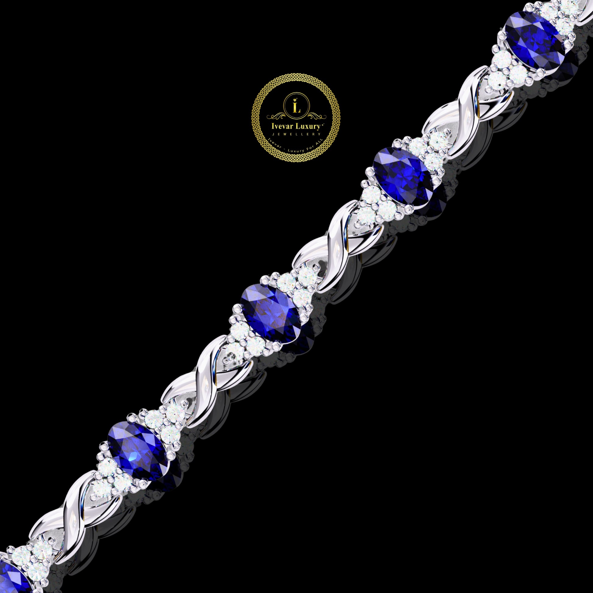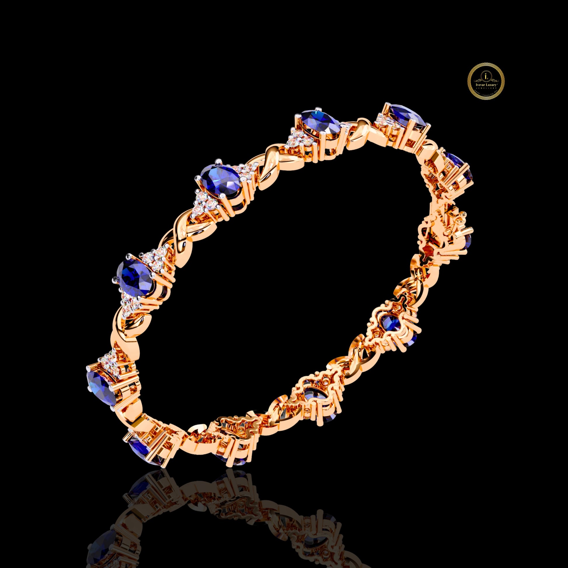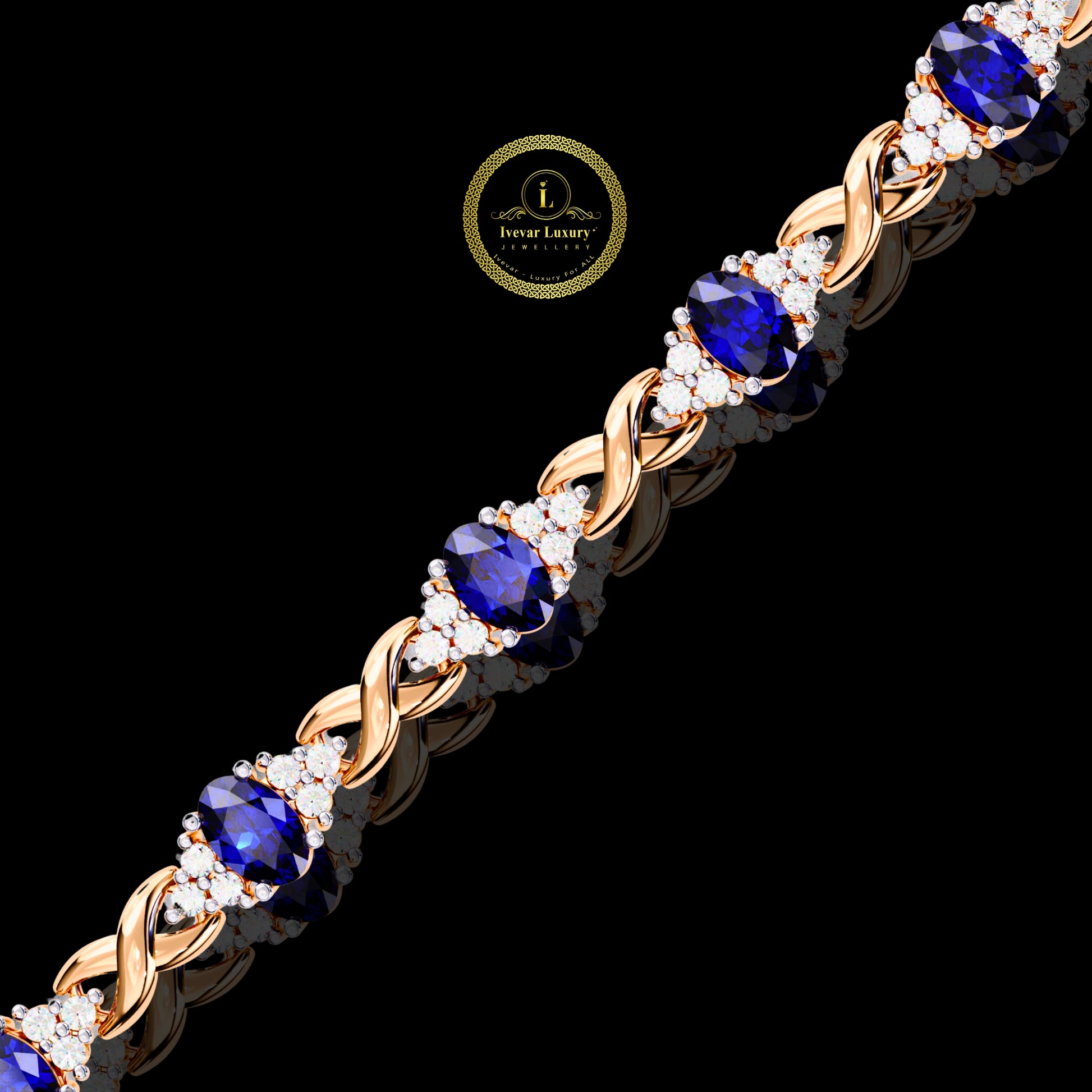 This elegant bracelet features a series of fancy vivid blue oval gemstones set in intricate gold settings, each stone accented by small sparkling round diamonds that enhance its brilliance. The design incorporates a twisted gold motif that flows gracefully around the wrist, giving the piece a luxurious and timeless feel. Rich in color and crafted with fine detail, the bracelet exudes sophistication and makes a striking statement, whether worn for special occasions or as an everyday touch of refinement by Ivevar.