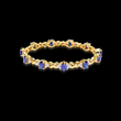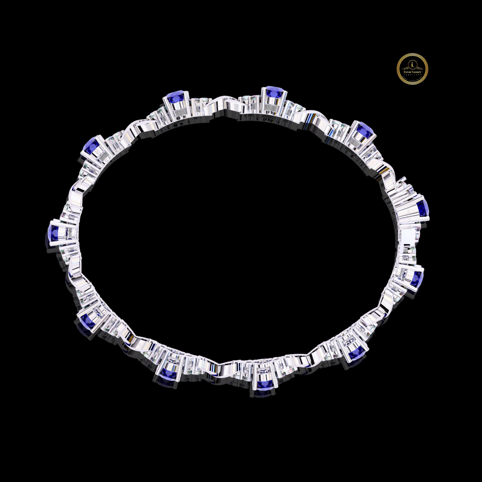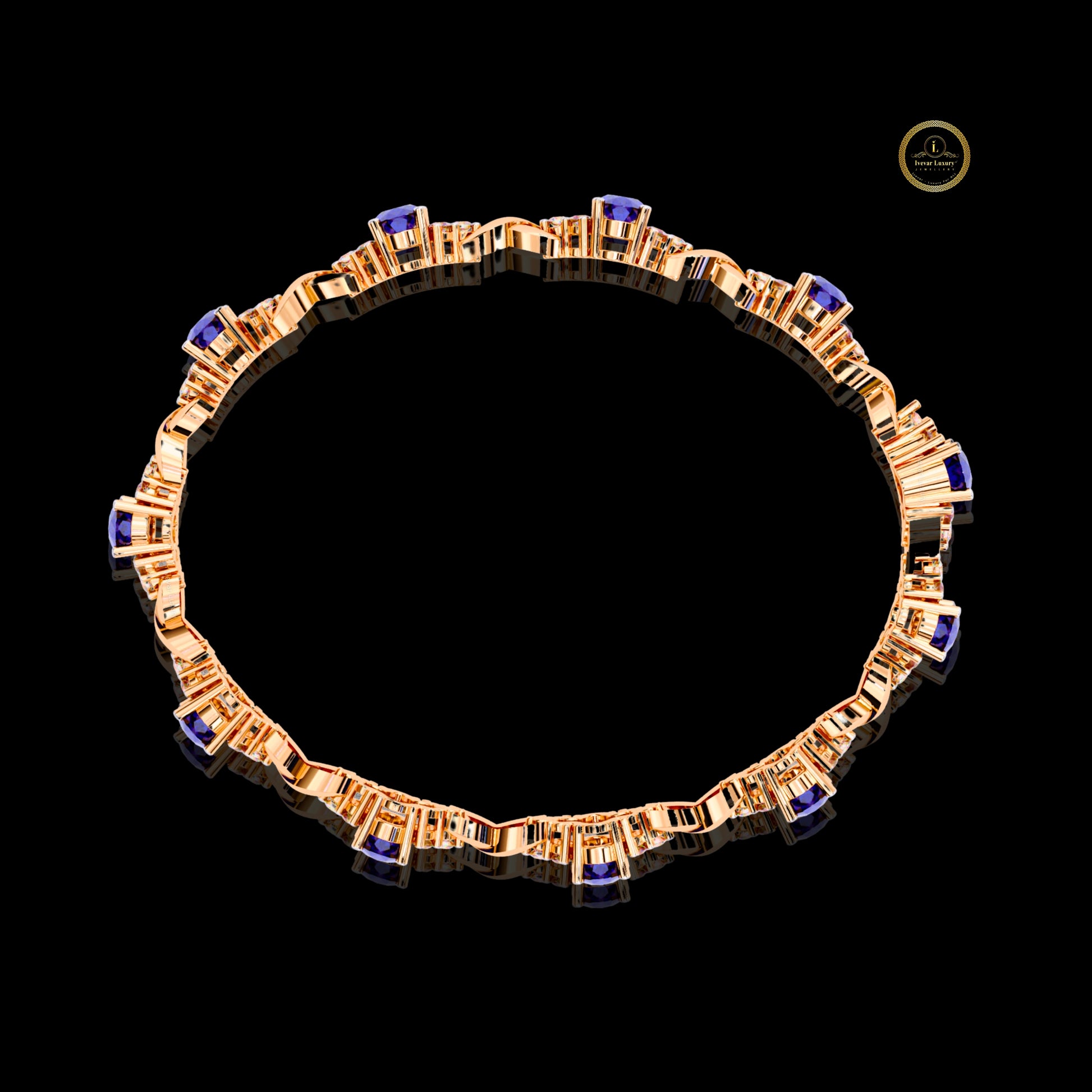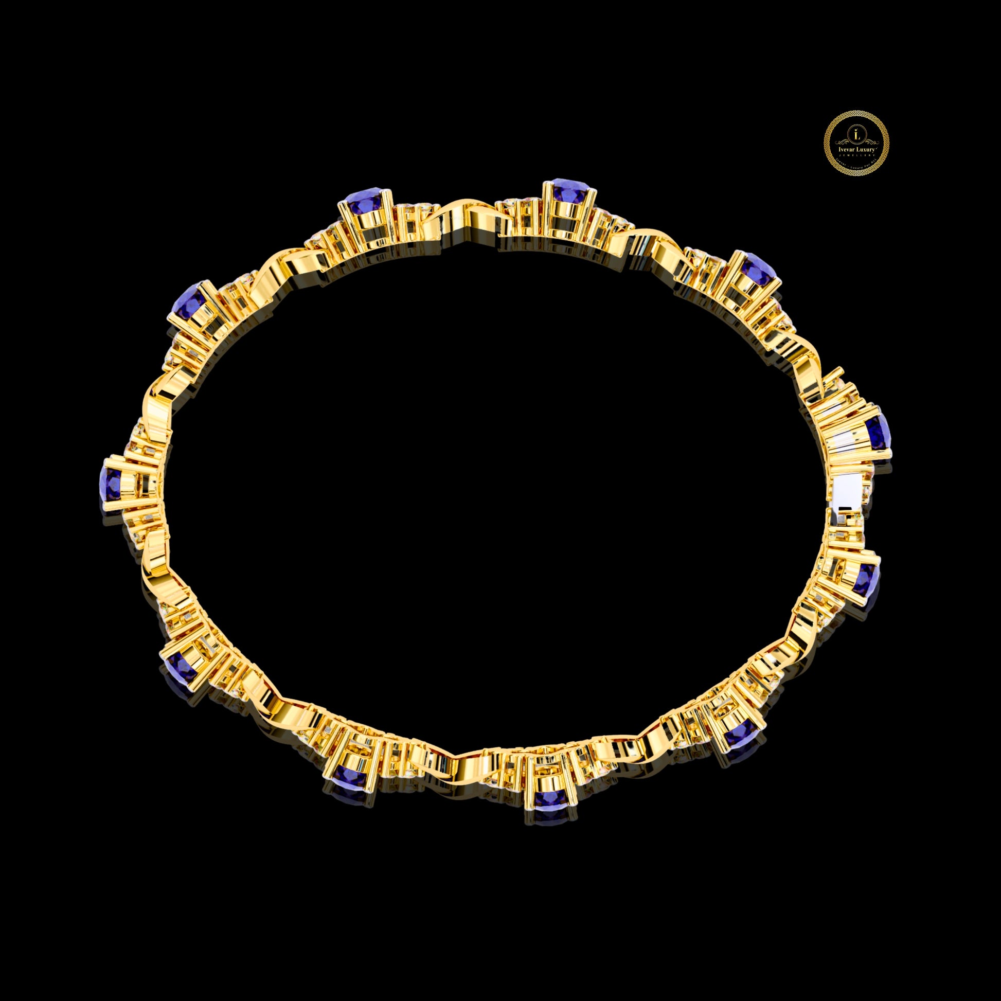 This elegant bracelet features a series of fancy vivid blue oval gemstones set in intricate gold settings, each stone accented by small sparkling round diamonds that enhance its brilliance. The design incorporates a twisted gold motif that flows gracefully around the wrist, giving the piece a luxurious and timeless feel. Rich in color and crafted with fine detail, the bracelet exudes sophistication and makes a striking statement, whether worn for special occasions or as an everyday touch of refinement by Ivevar.