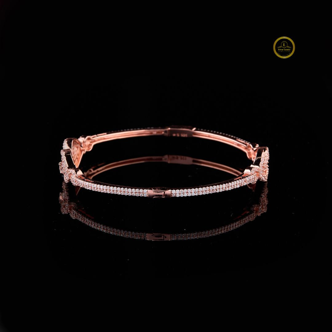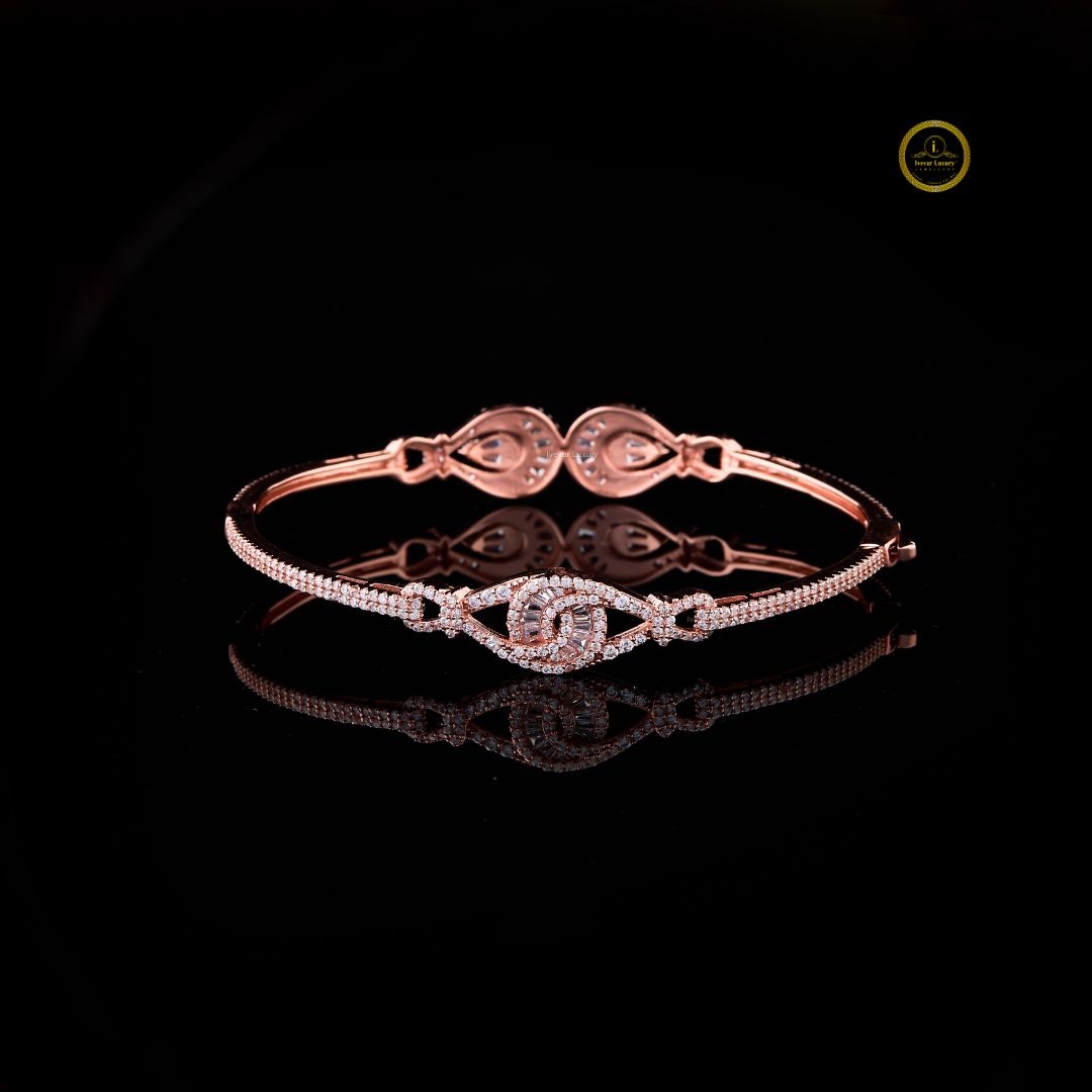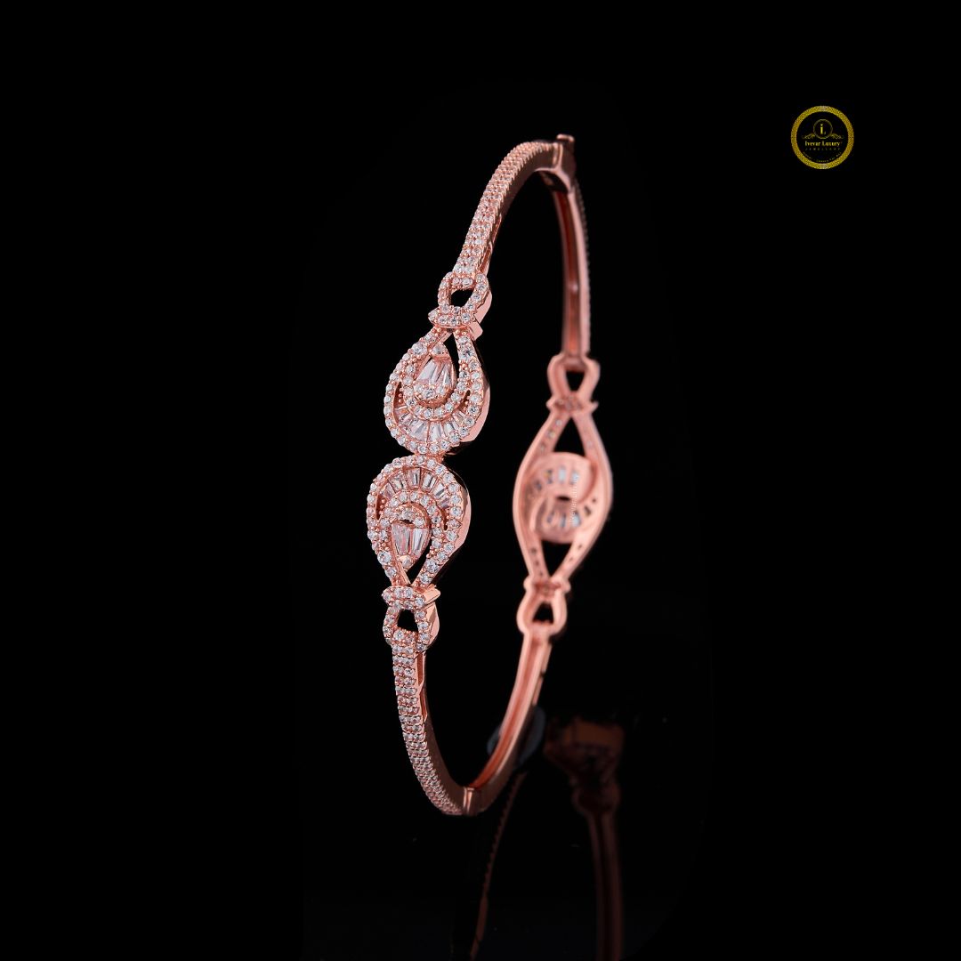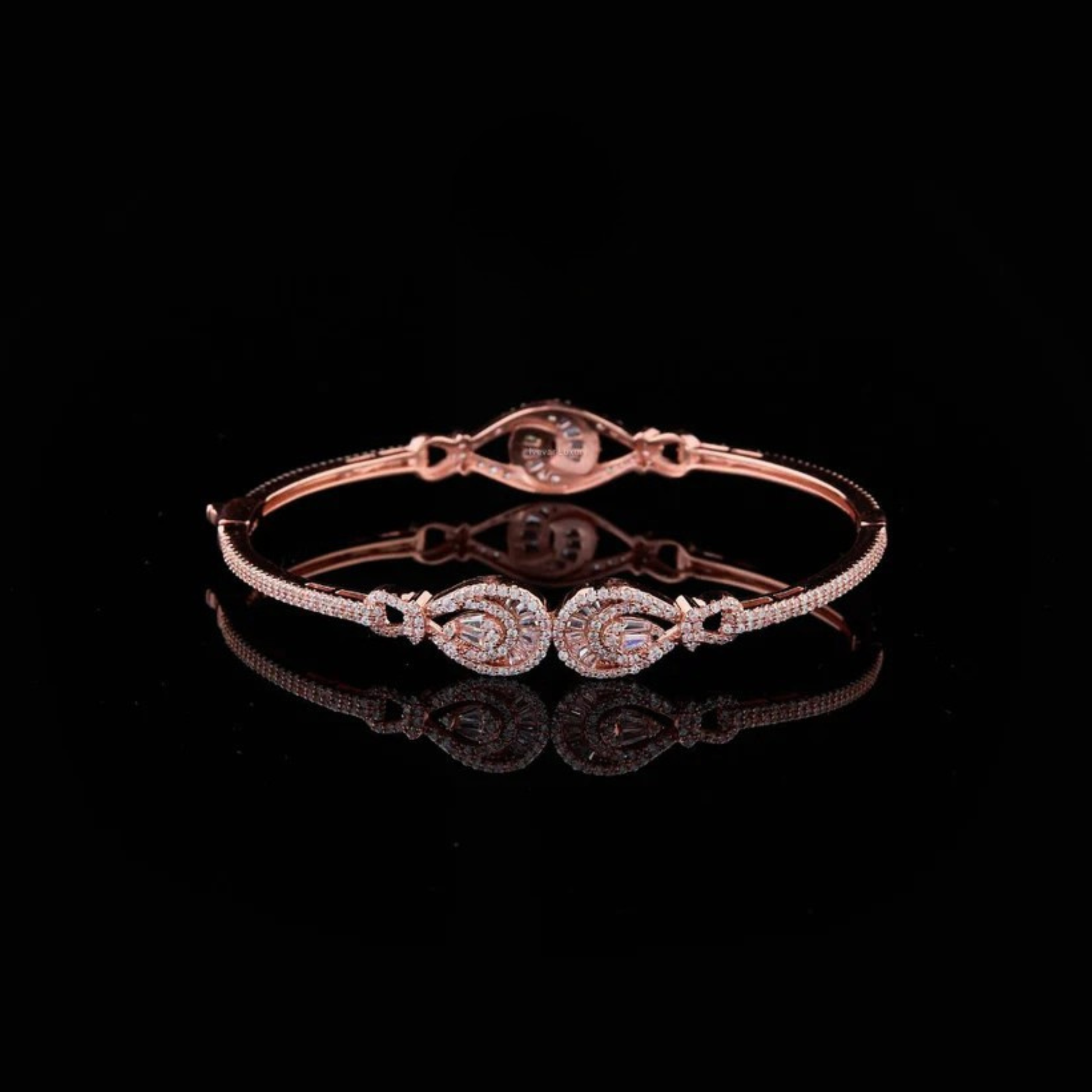 This refined rose gold bracelet features twin teardrop-shaped diamond motifs surrounded by shimmering pavé round-cut detailing. Its slim, graceful silhouette and intricate craftsmanship create a luxurious look that blends sophistication with timeless charm. Perfect for evening wear, special occasions, or adding a delicate sparkle to your everyday style.