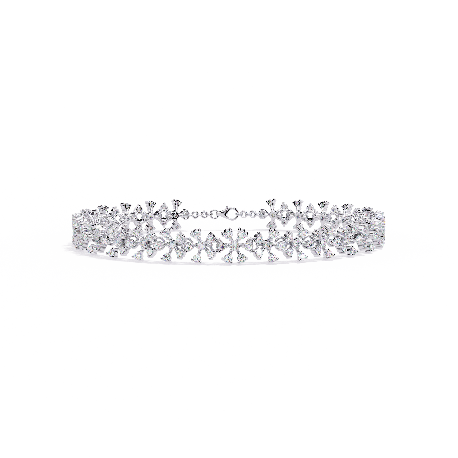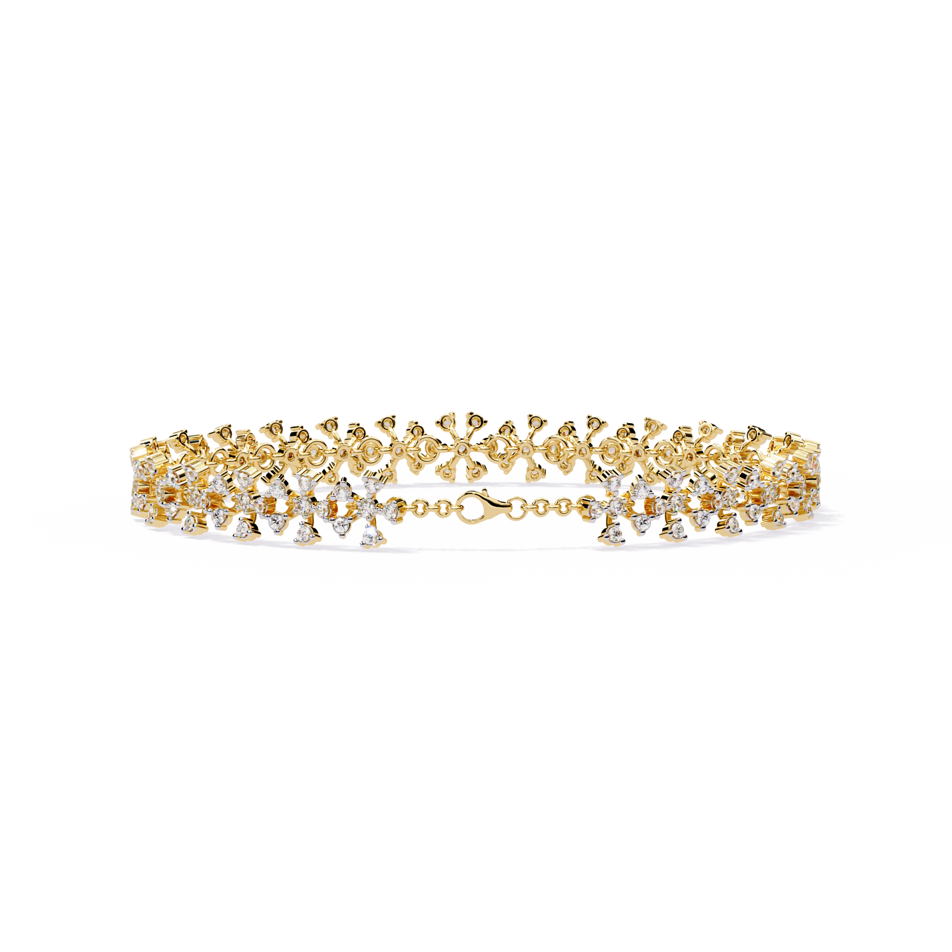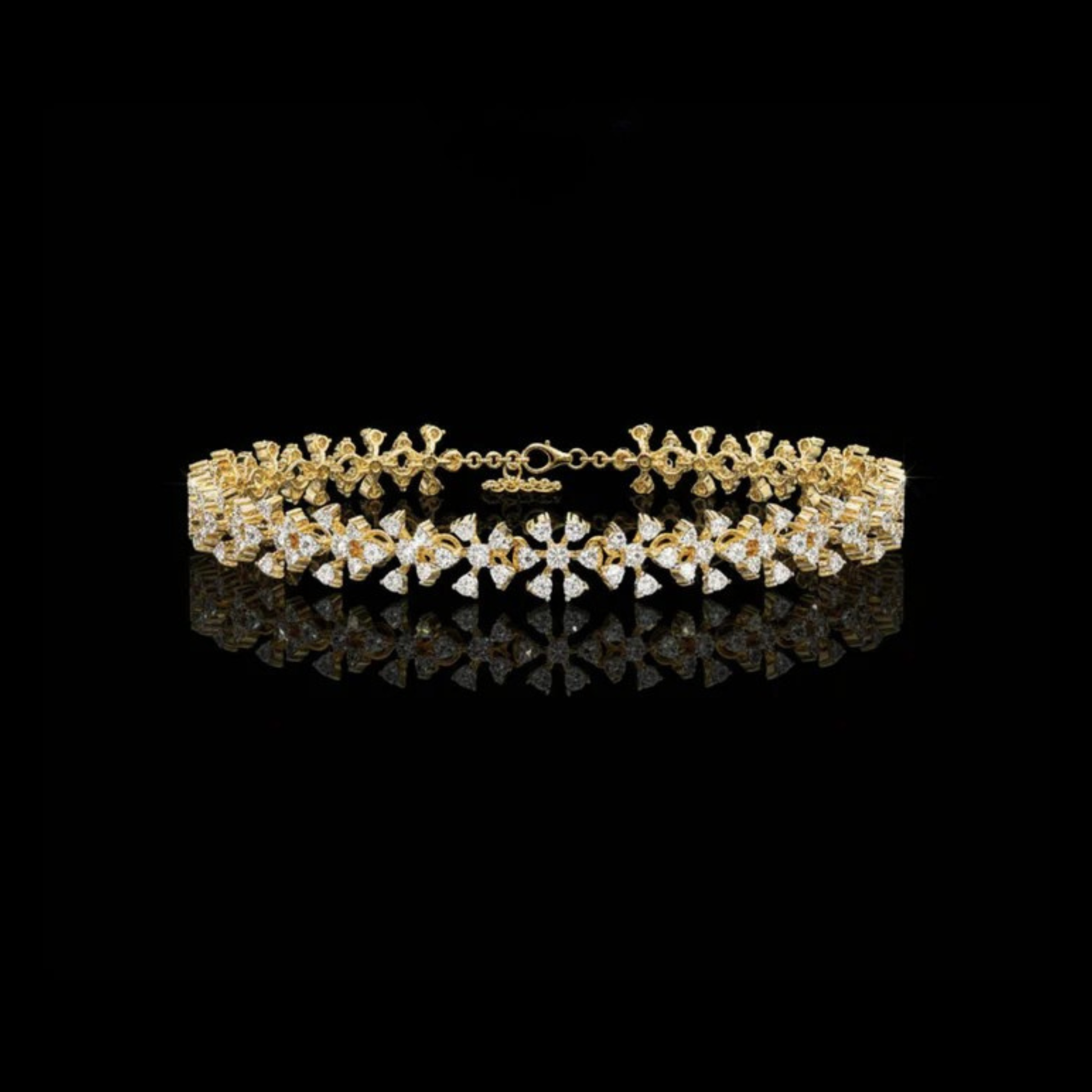 This exquisite bracelet captures the essence of floral elegance with its intricate petal-inspired design and shimmering round diamond accents. Each flower motif is meticulously crafted to reflect brilliance and grace, creating a captivating play of light with every movement. The bracelet’s refined craftsmanship and secure clasp ensure both comfort and durability, making it an ideal piece for luxurious occasions or everyday sophistication. A true statement of timeless beauty and artful design from Ivevar Luxury.
