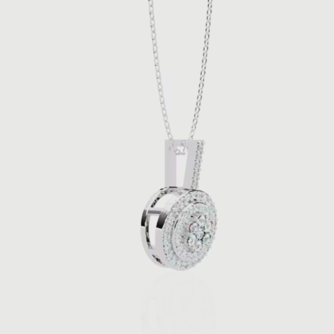 This stunning pendant showcases a dazzling circular design crafted in rich gold, featuring a captivating Cluster of Brilliant Round Diamonds at its center. Encircling the centerpiece are two concentric halos of smaller, meticulously set diamonds that amplify its sparkle and elegance. The diamond-encrusted bail adds a refined finishing touch, making this piece a perfect symbol of timeless luxury and radiant beauty, ideal for adding glamour to any special occasion or everyday look by Ivevar.