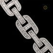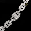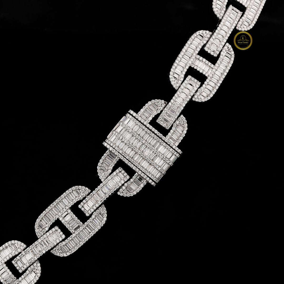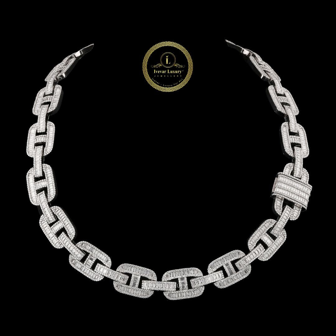 This striking piece is a custom iced-out chain featuring an anchor or mariner link style, entirely paved with lab grown diamonds. The design is distinct, moving away from the traditional Cuban link to offer a unique, nautical-inspired pattern where each link is a variation of an oval or rectangular shape with a central bar.