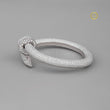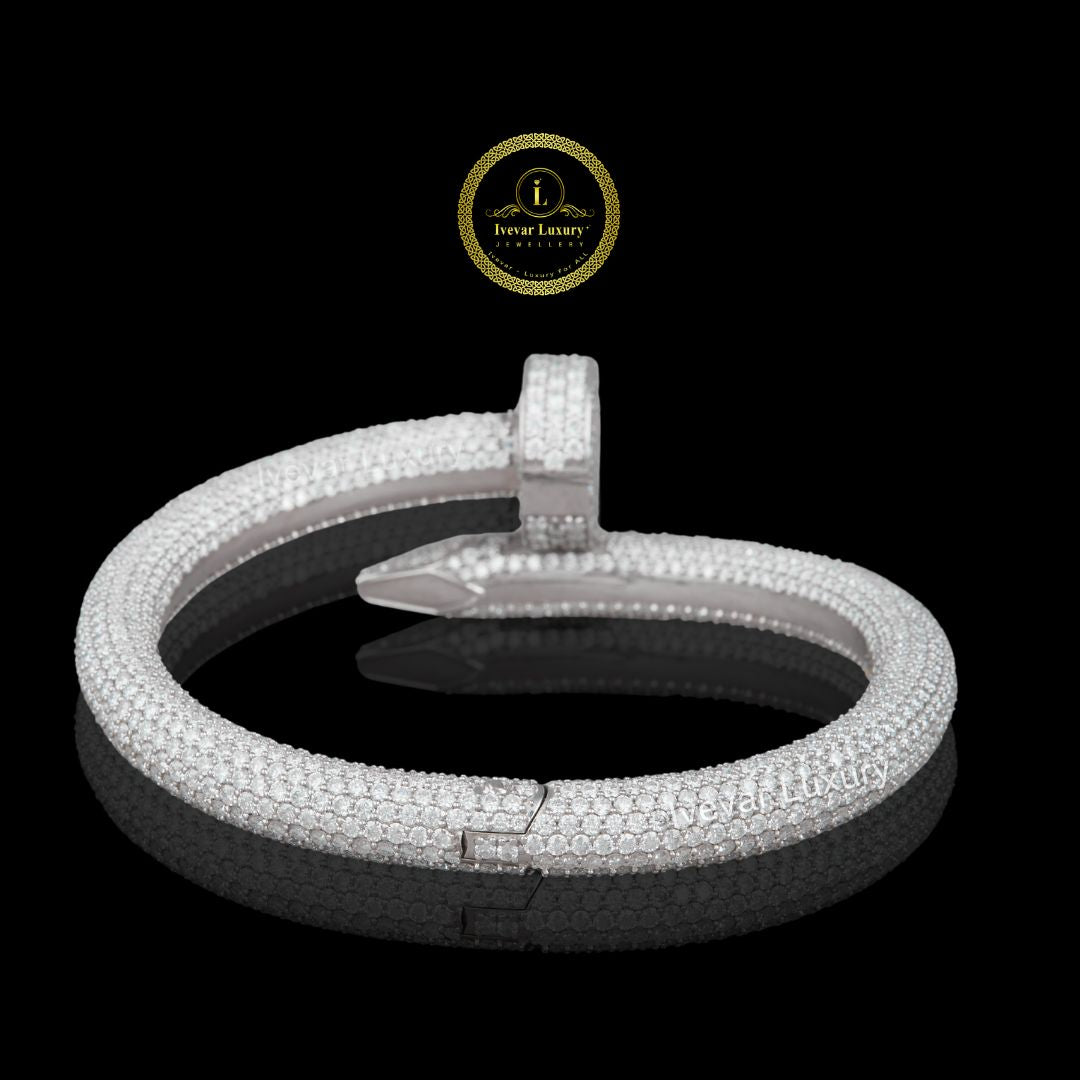 The bracelet is completely covered in small, brilliant lab-grown diamonds, giving it an exceptionally luxurious and sparkly appearance. The setting is likely white gold or sterling silver with rhodium plating to complement the diamonds' brilliance. The piece combines an industrial, edgy form (the bent nail) with high-end, classic materials (the pavé diamonds), making it a bold statement accessory. It appears to have a secure clasp mechanism integrated into the underside of the band.