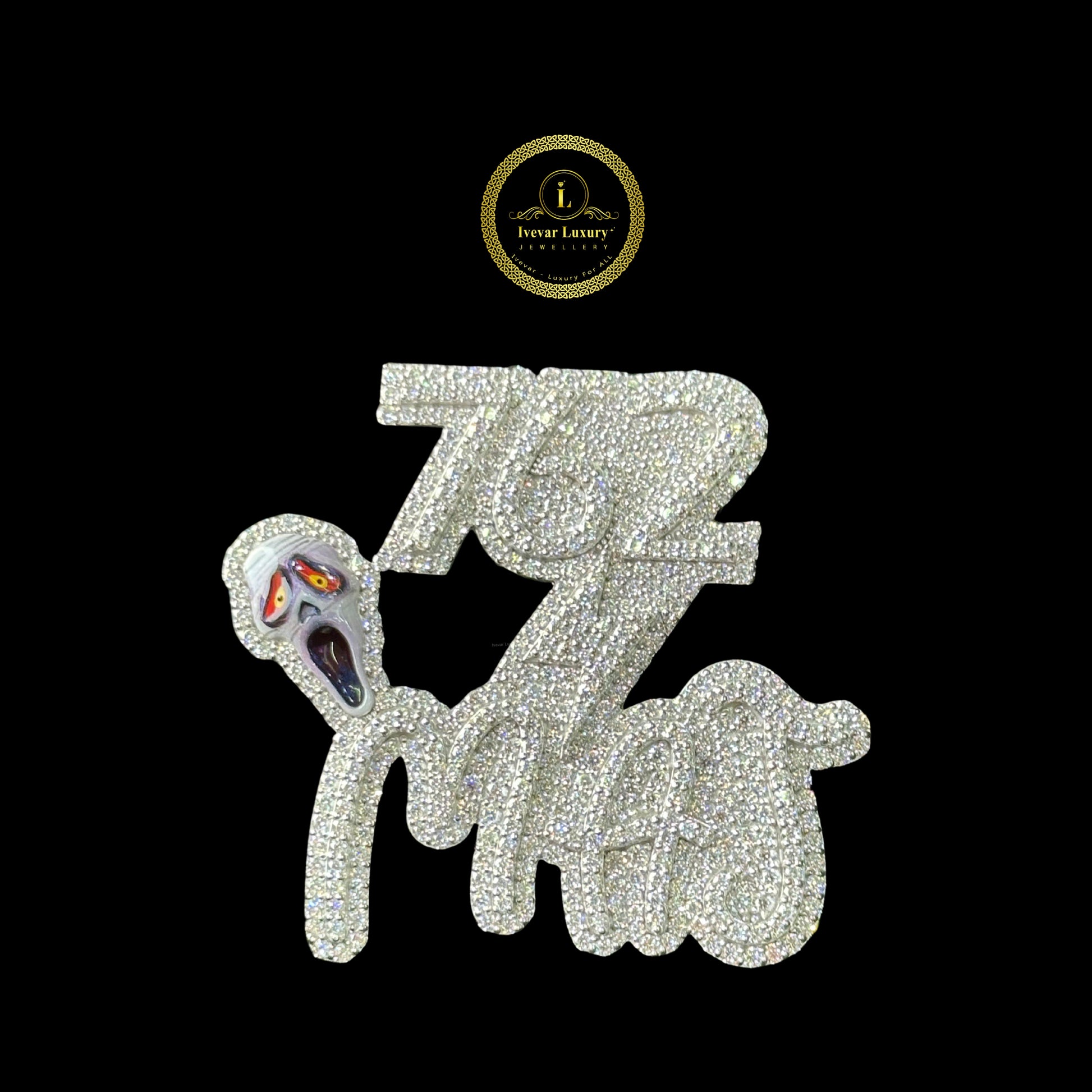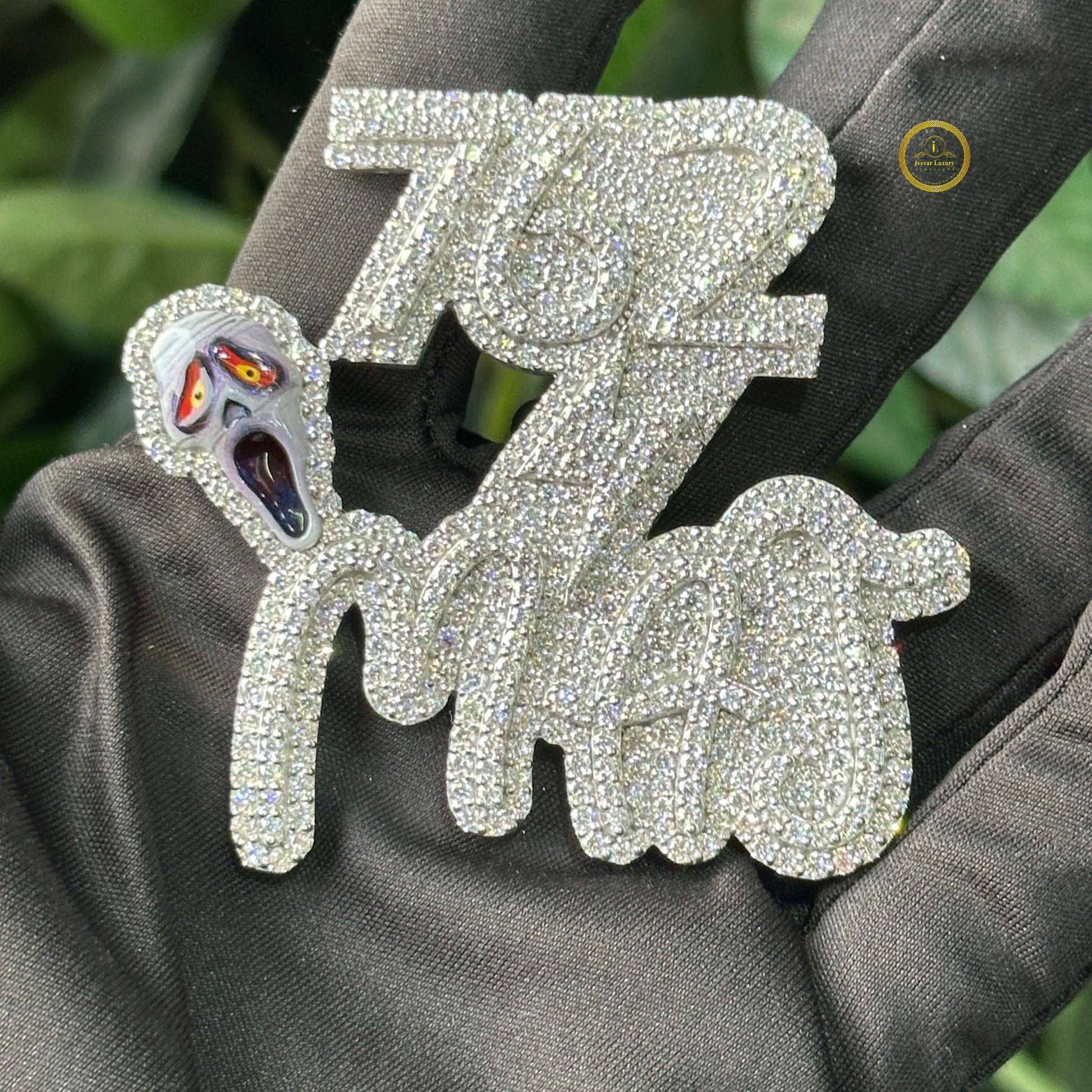 The main body of the pendant is shaped in a flowing, script font that appears to read "762 MAJ" and is fully covered in shimmering, closely-set moissanite diamonds (pave setting) for a completely "iced out" look. The piece is likely crafted from white gold or sterling silver to complement the brilliance of the stones. A unique and contrasting feature is the small, hand-painted or enameled ghost/screaming face positioned to the left. This element adds a splash of vibrant color and a spooky, streetwear-inspired edge to the high-end jewelry. This custom piece is designed to be a significant, statement accessory.