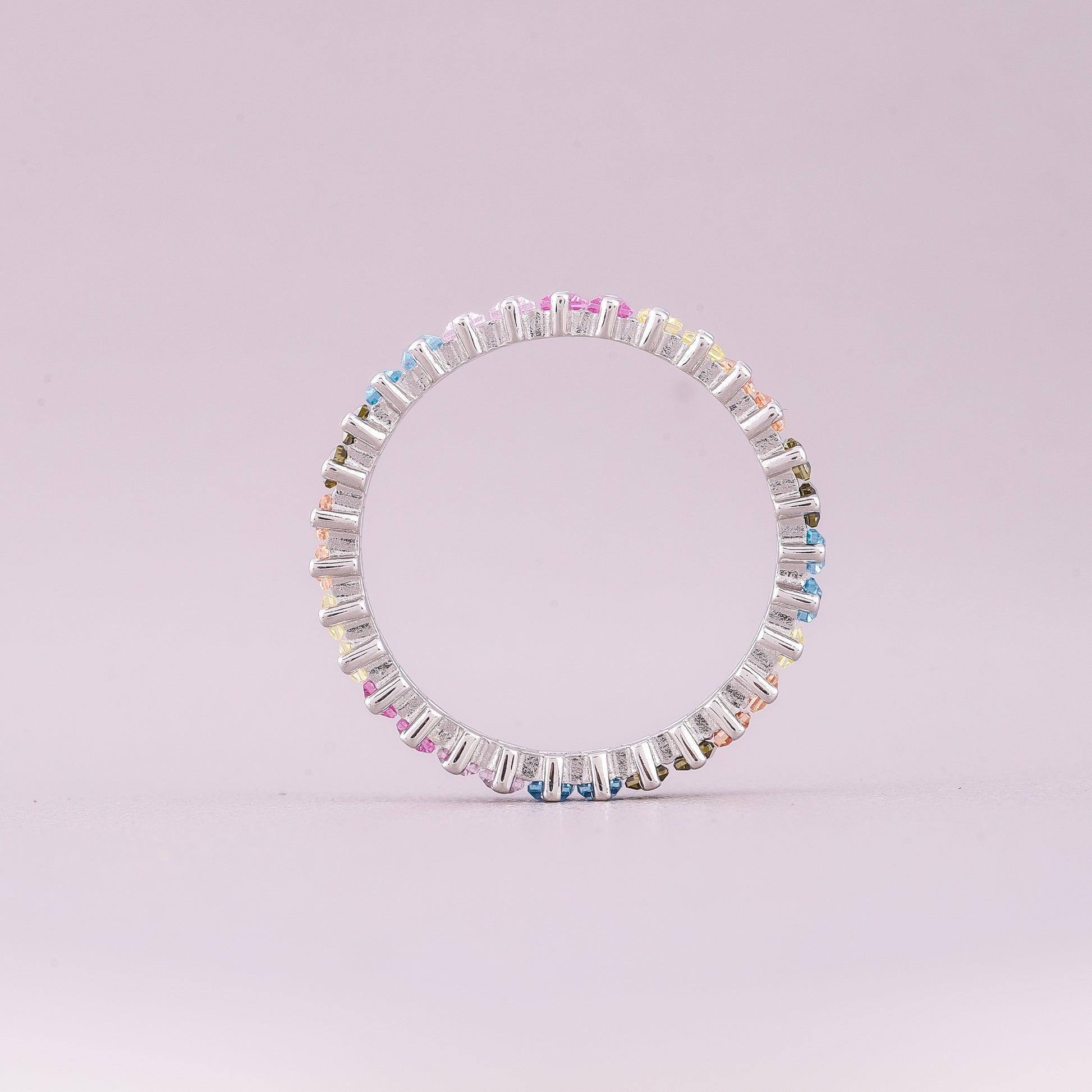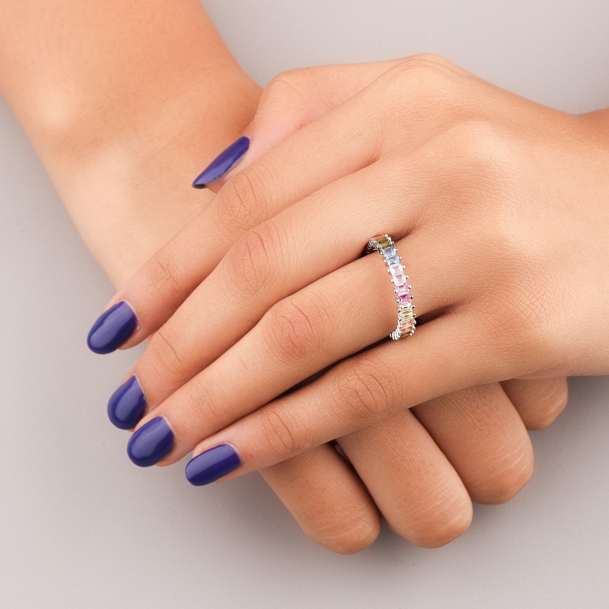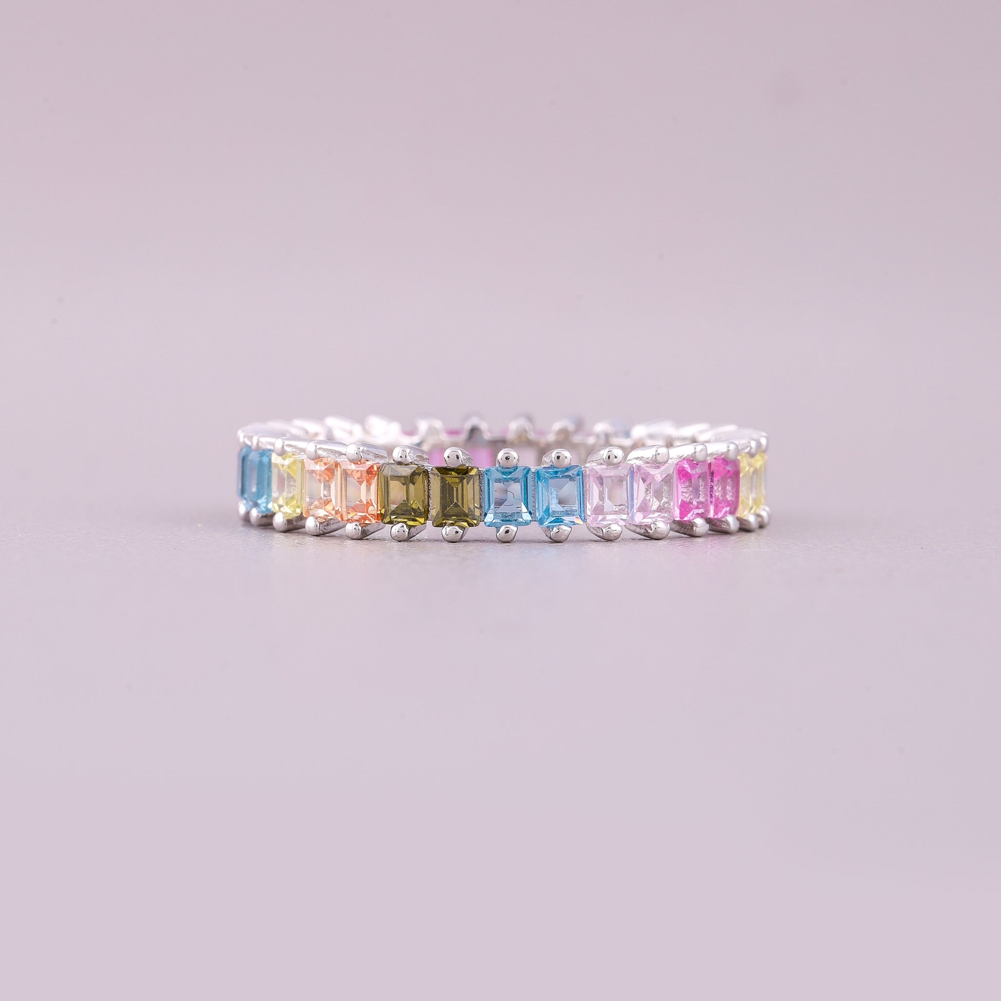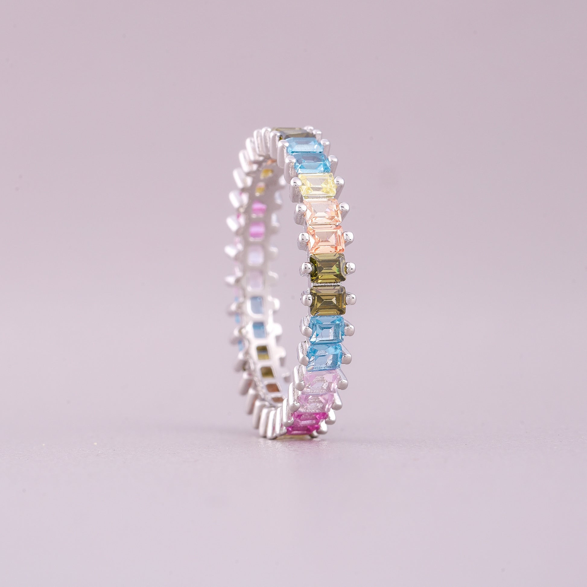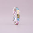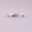 This elegant Rainbow Baguette Eternity Band showcases natural multi-colored sapphires alternating with small diamonds. The striking design features rectangular, baguette-cut gemstones, set in a repeating pattern of vibrant hues. It's a colorful, contemporary piece that offers sophisticated style and sparkle.