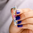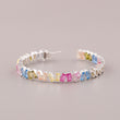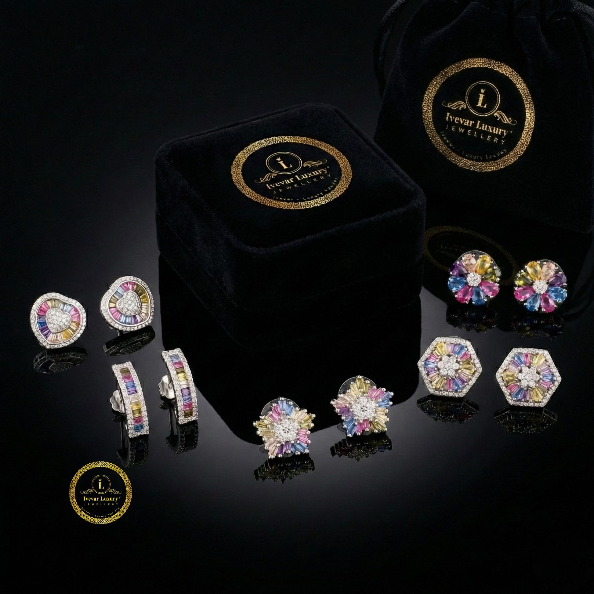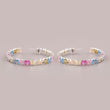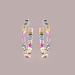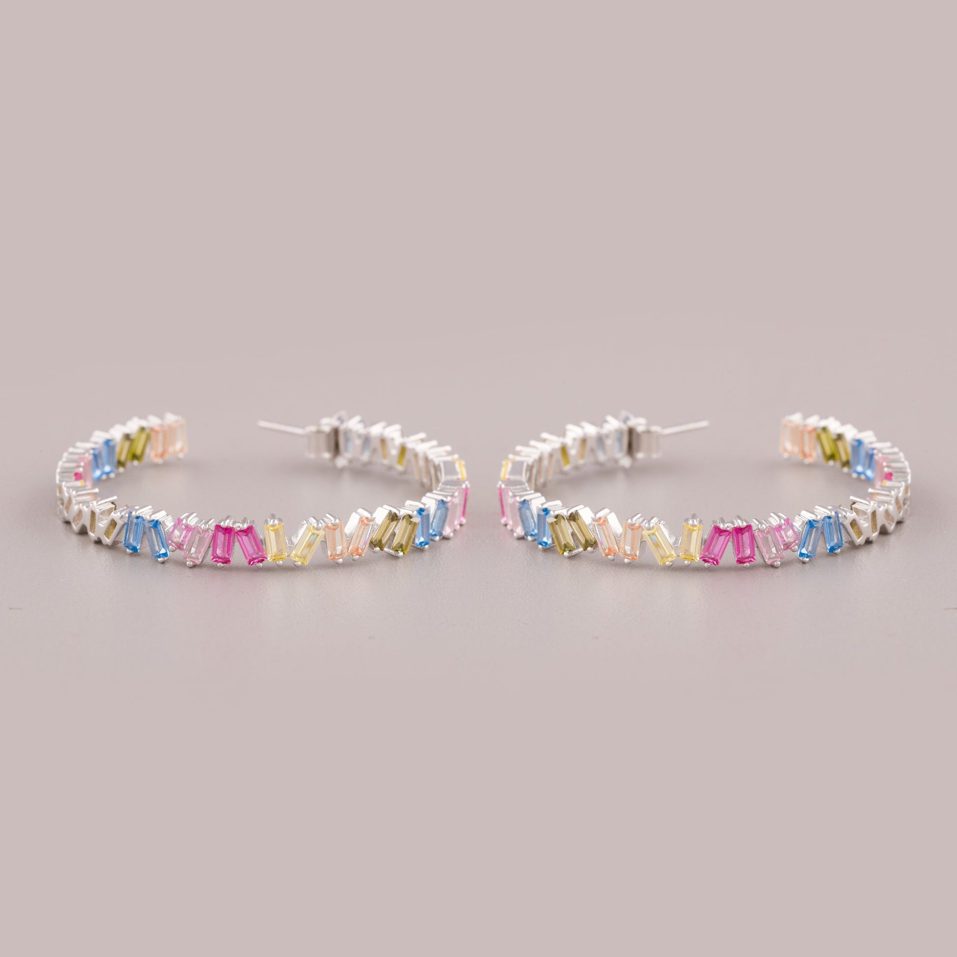 This image presents a stunning pair of Large Rainbow Emerald Hoop Earrings. These earrings feature an open hoop or C-hoop design, set with a single row of horizontally oriented baguette-cut stones. The stones are meticulously arranged in a sequence of colors, including soft blues, pinks, yellows, and greens, creating a beautiful "natural rainbow" effect. The vibrant, elongated shape of the baguettes provides a modern, geometric look that contrasts with the classic circular form of the hoop. Set in a silver-tone metal, the generous size of the hoops ensures they are a bold, light-catching statement piece perfect for adding a glamorous and colorful twist to a sophisticated outfit.