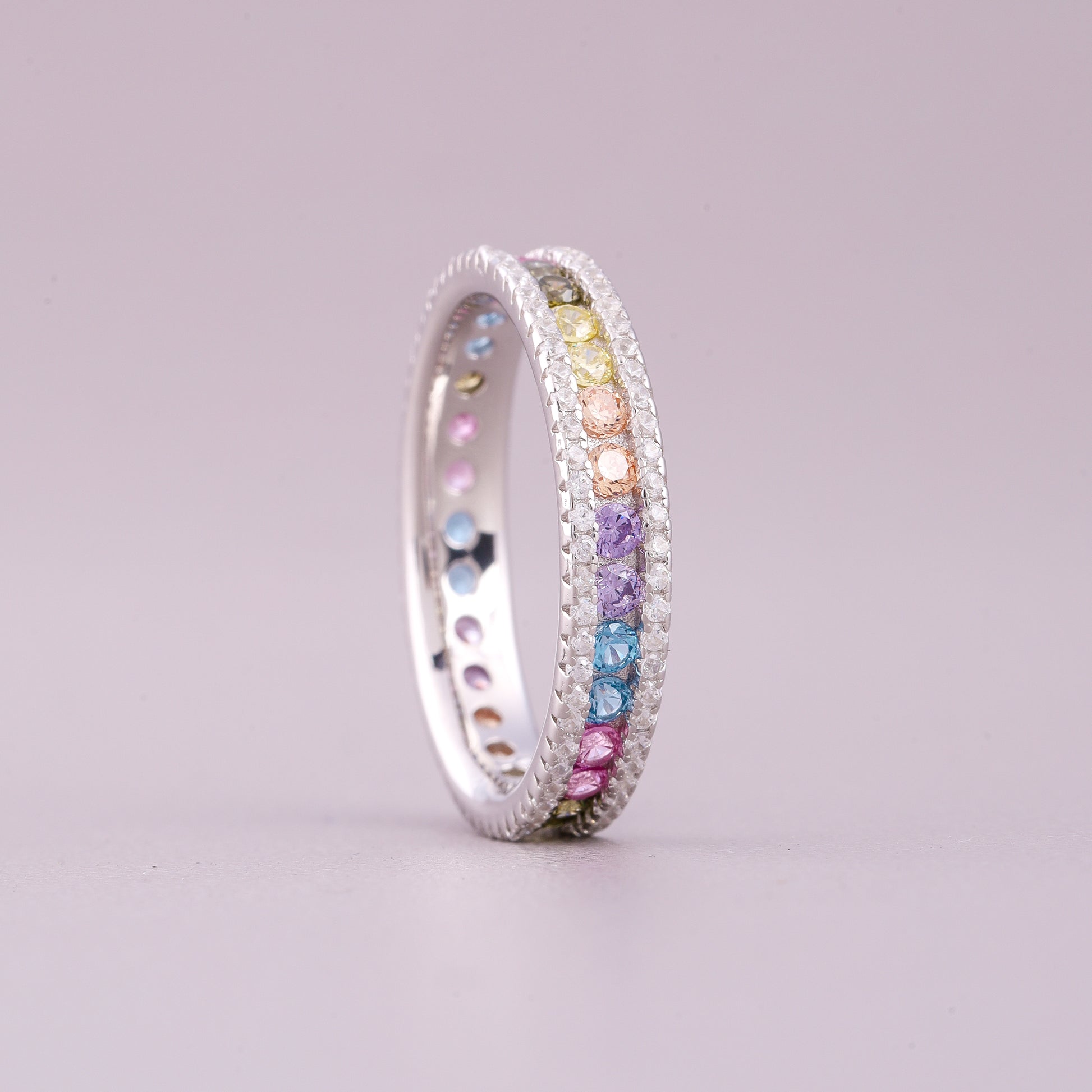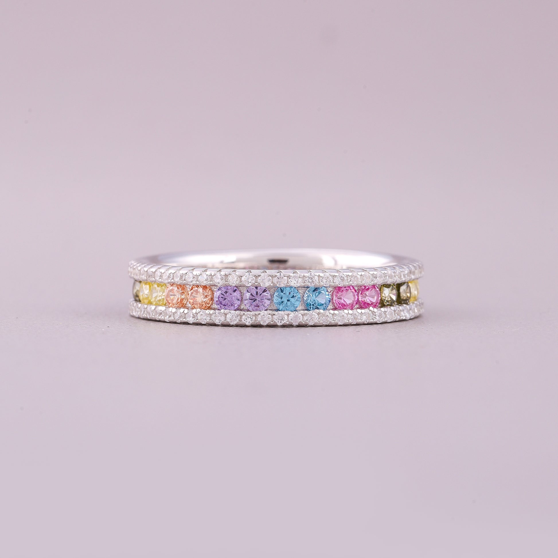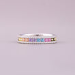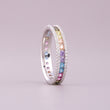 This elegant natural sapphire diamond ring highlights a delicate row of round-cut sapphires arranged in a soft, pastel rainbow gradient. Each sapphire—ranging from serene blues and purples to gentle pinks, greens, and warm yellows—adds a touch of subtle color and charm. The sapphires are beautifully set within a refined white-gold band, while two surrounding rows of brilliant round diamonds enhance the ring’s sparkle and sophistication. Perfect for those who appreciate graceful color combinations and timeless craftsmanship, this ring offers a luxurious yet playful aesthetic, making it a standout piece for everyday elegance or special occasions.