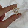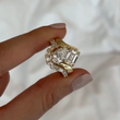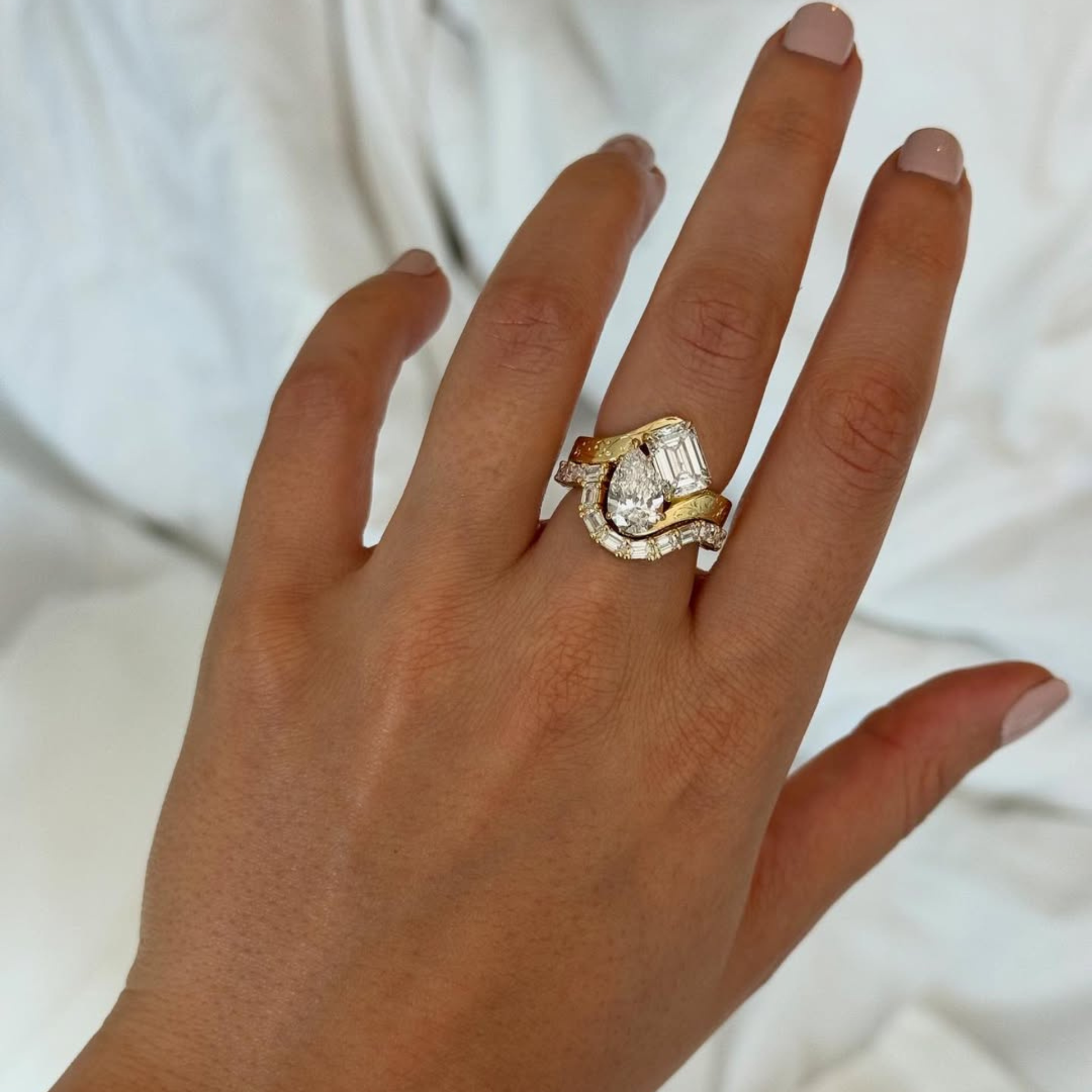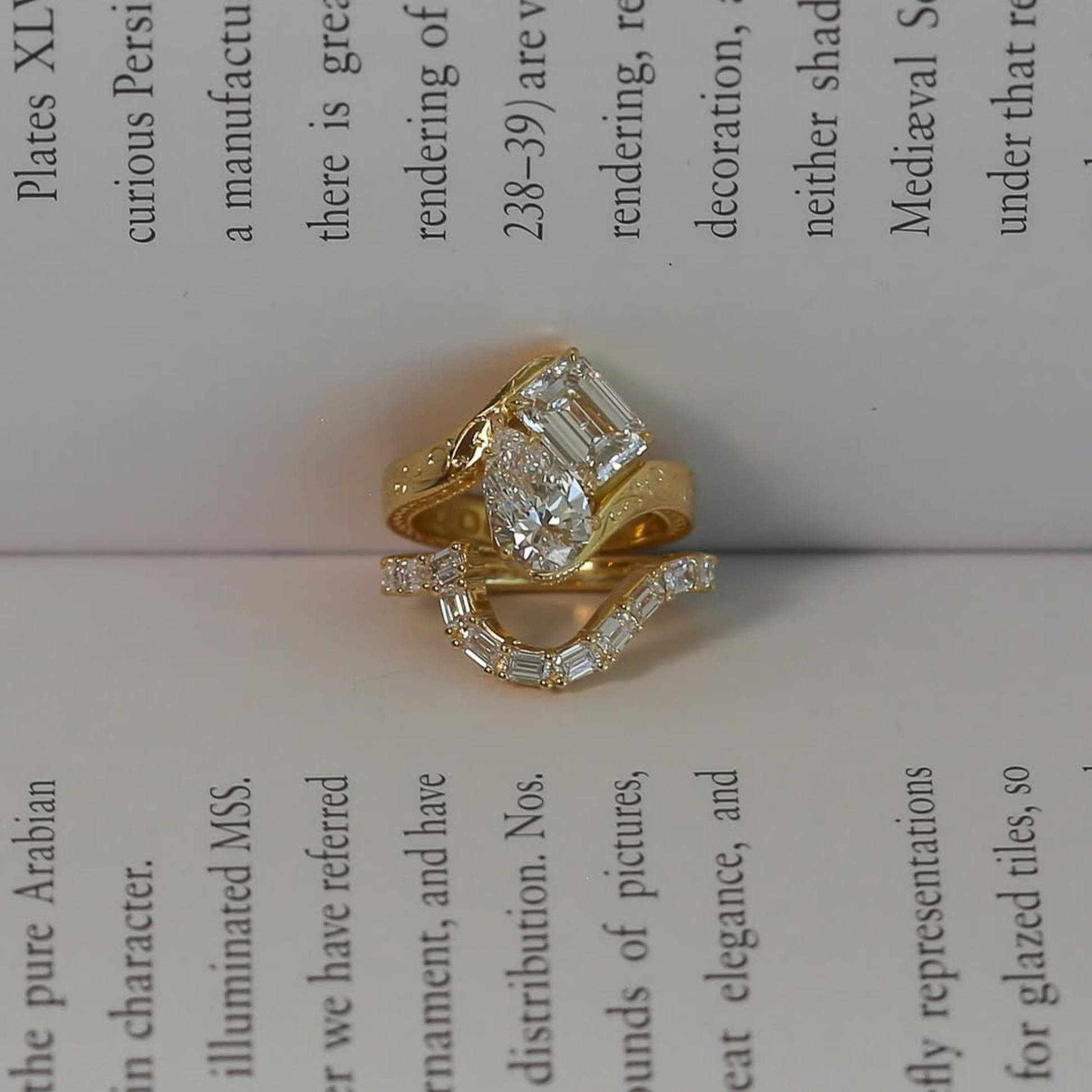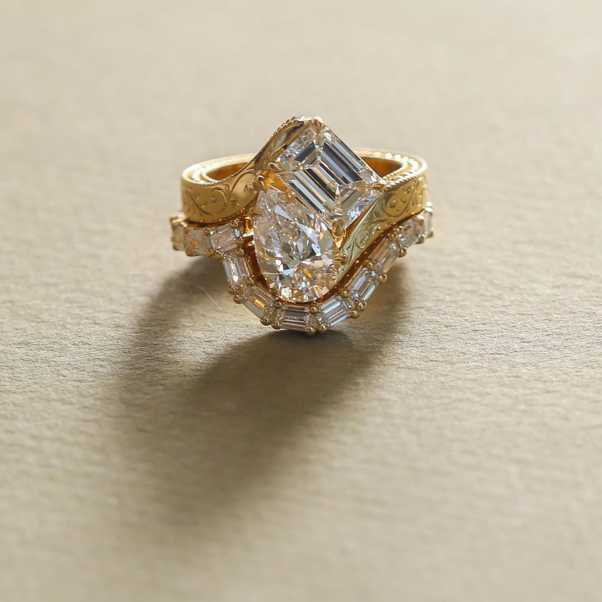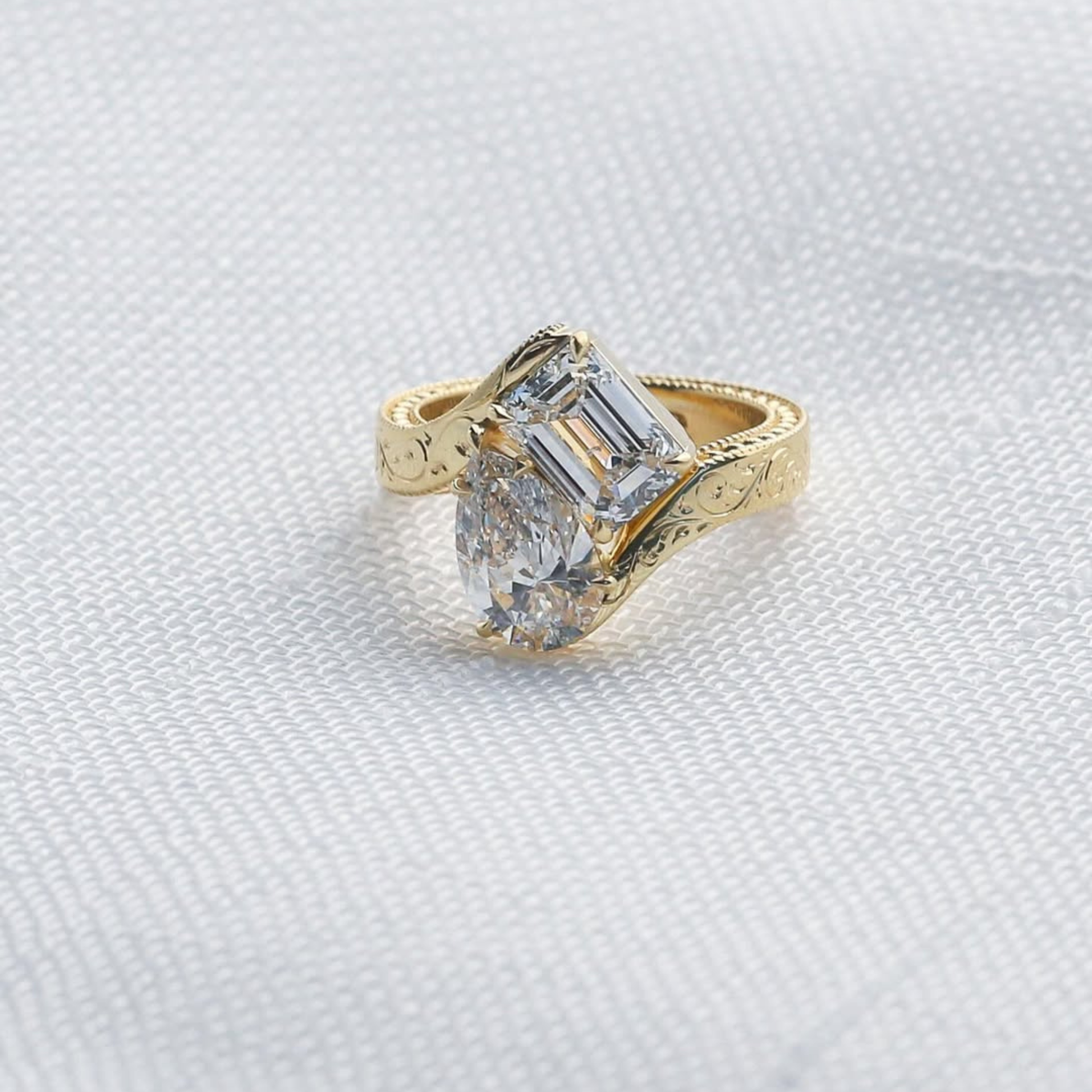 This breathtaking ring is designed for those who desire bold elegance and timeless artistry. Featuring a stunning pear-cut diamond paired with a striking emerald-cut diamond, this two-stone masterpiece symbolizes unity, strength, and everlasting love. the band showcases intricate hand-engraved detailing, adding a refined vintage charm. A halo of baguette-cut diamonds enhances brilliance and depth, creating a radiant statement from every angle.