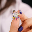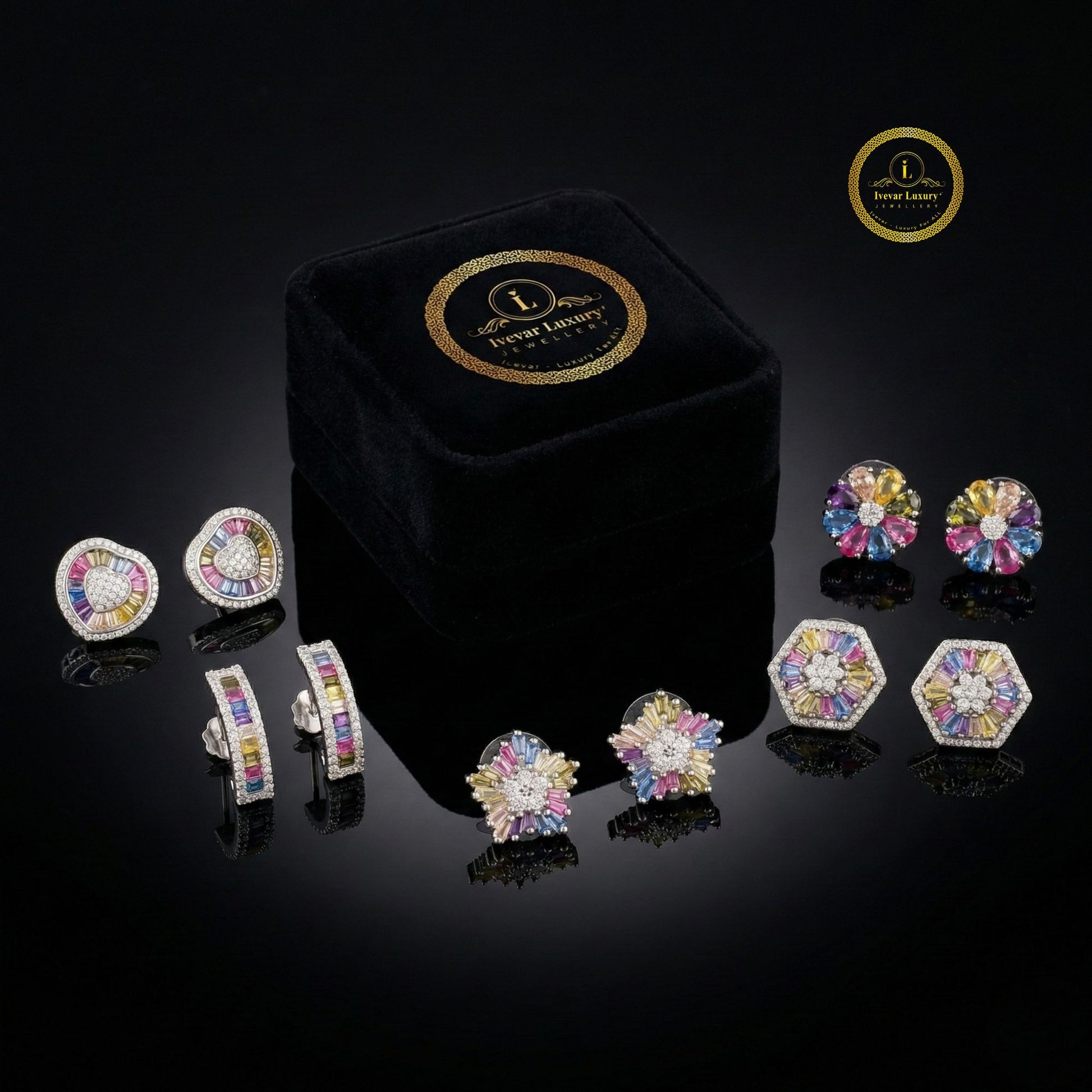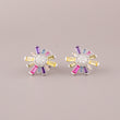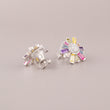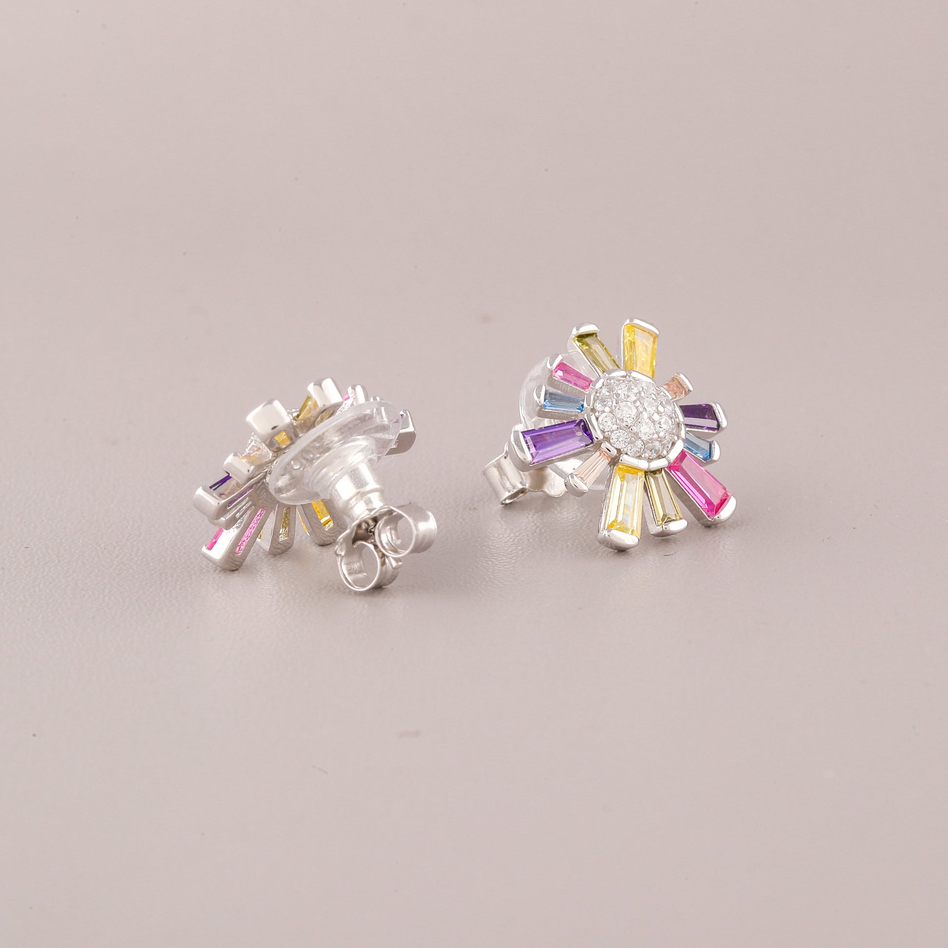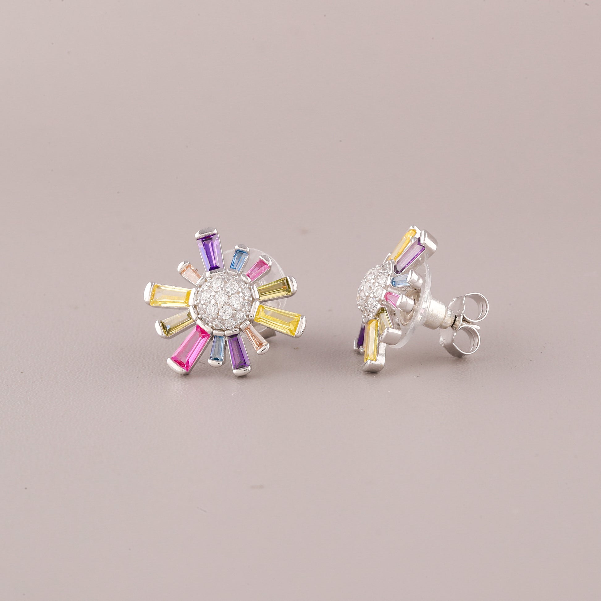 This image showcases a vibrant pair of Silver-Tone Rainbow Starburst Stud Earrings. The earrings feature a striking starburst or sunburst design. At the center, there is a cluster of small, round, pave-set clear stones (likely white diamonds or cubic zirconia) that forms a bright core. Radiating outwards from this center are thin, baguette-cut stones in a sequence of bright colors—including pink, yellow, blue, and purple—to create a captivating "natural rainbow" effect. Set in a cool, bright silver-tone metal, the overall look is cheerful, modern, and adds a playful burst of color, making them a fantastic accessory for everyday wear or a fun statement piece.