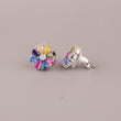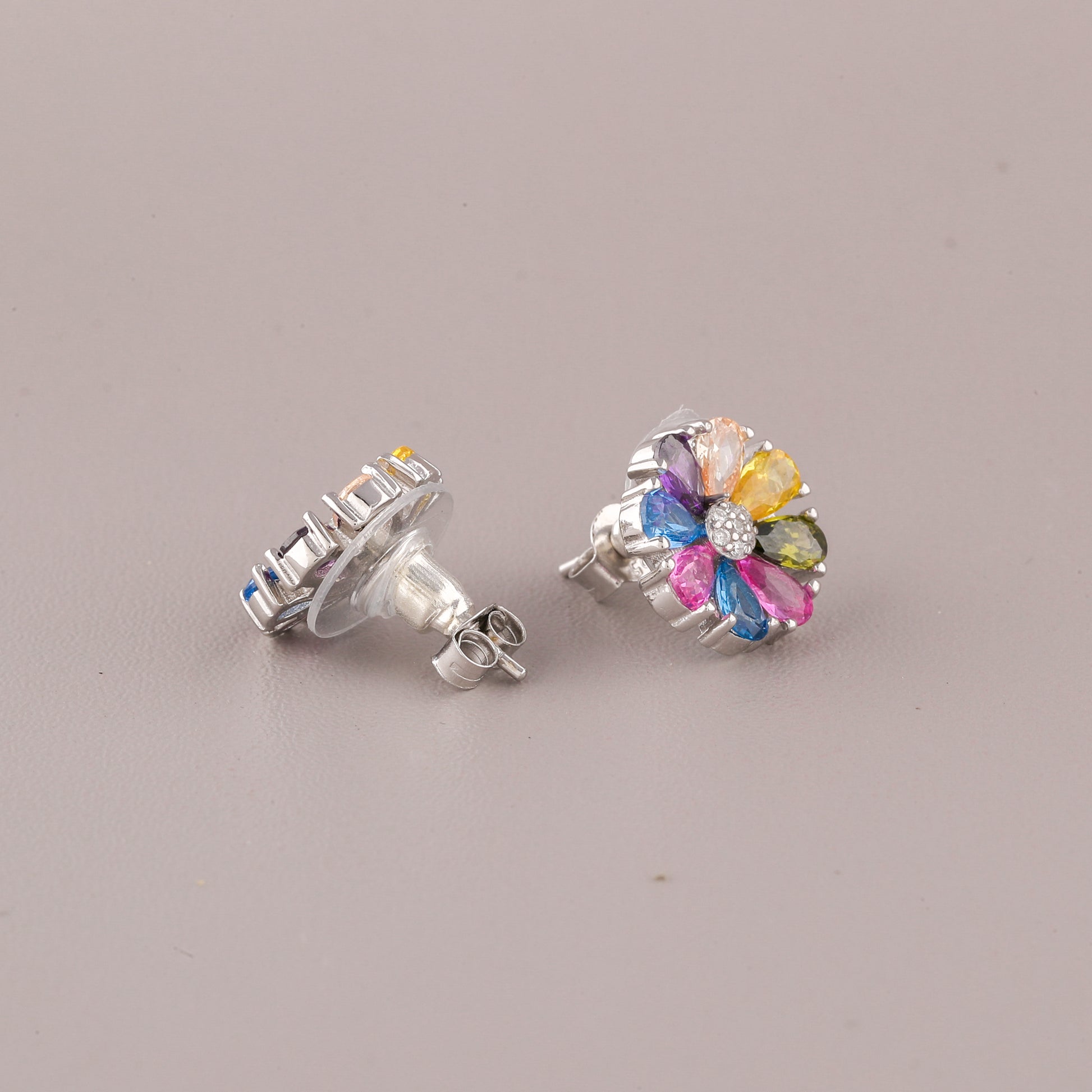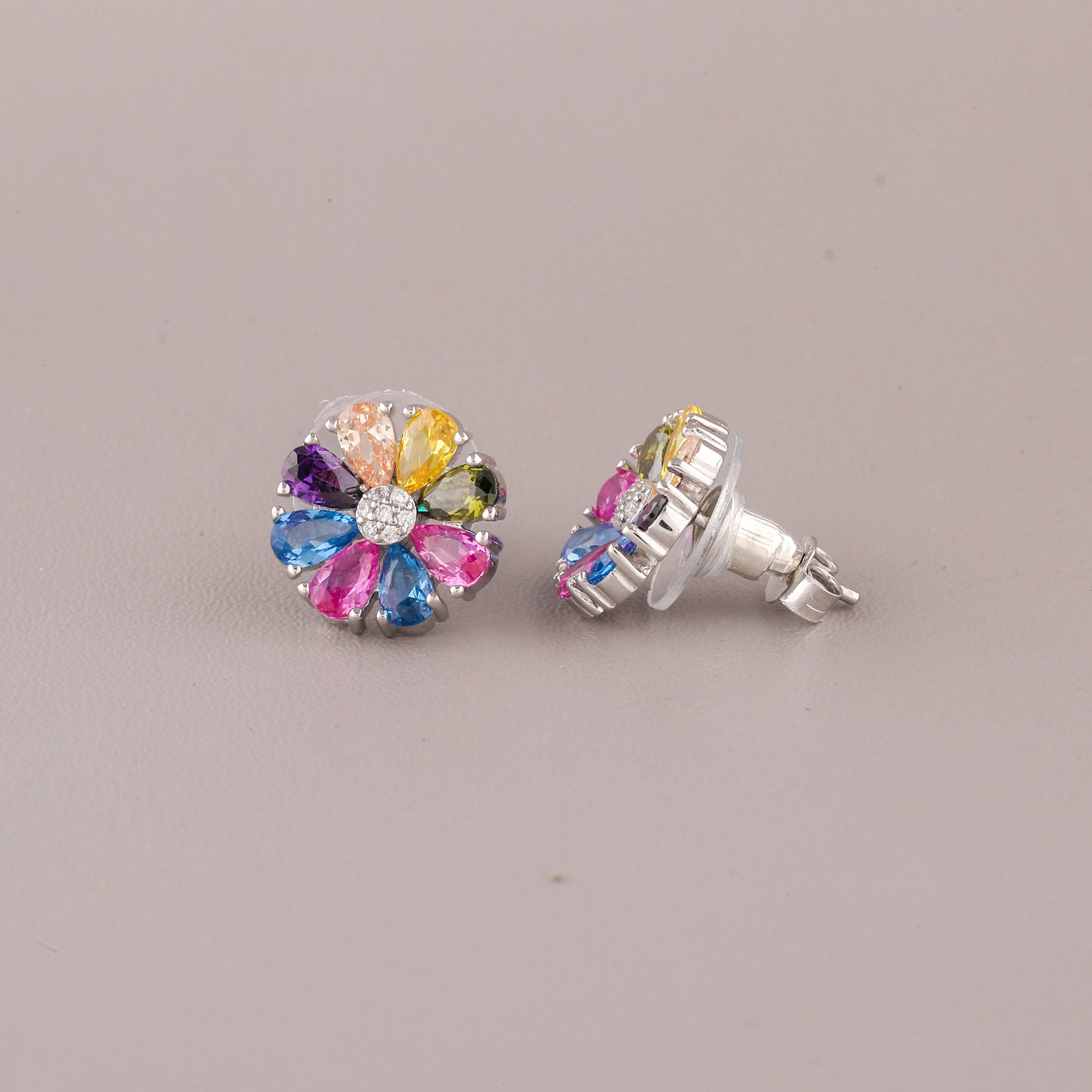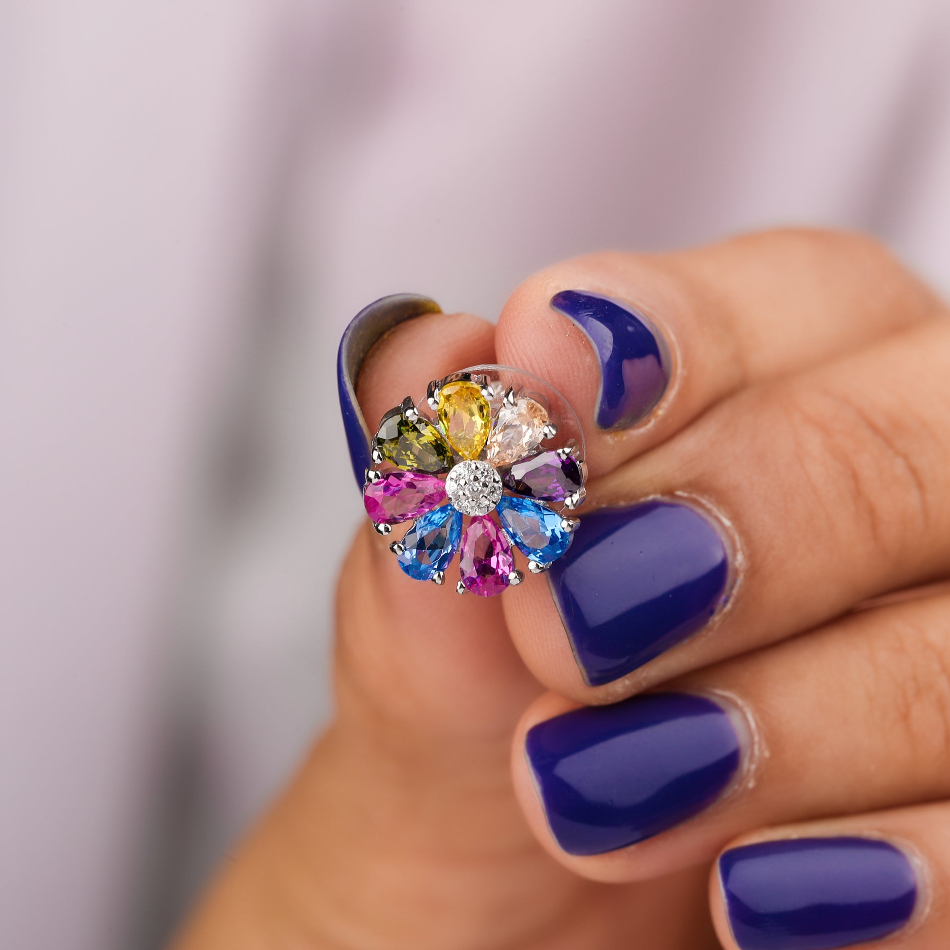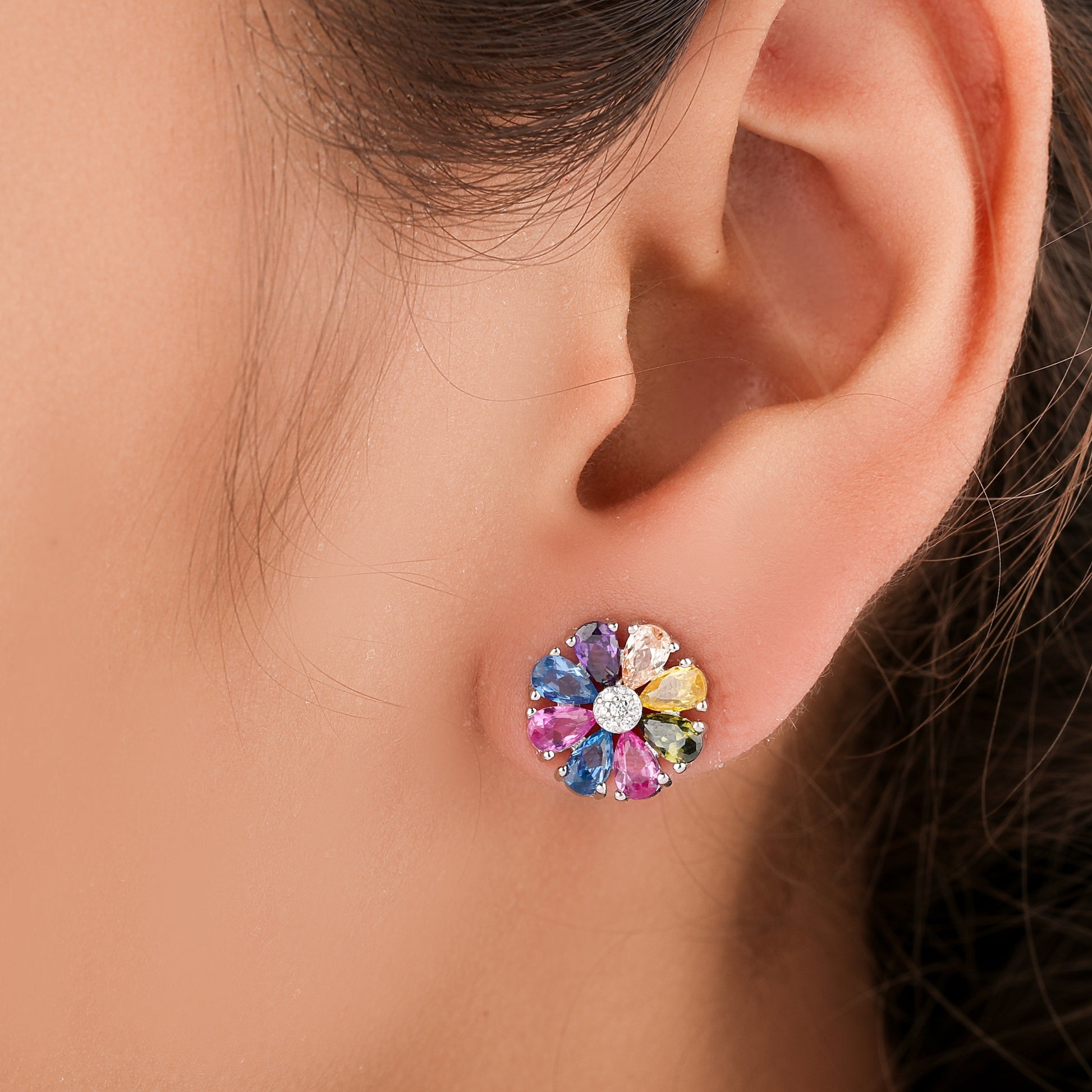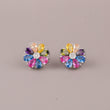 This image features an exquisite pair of Rainbow Pear-Cut Flower Stud Earrings. The design is a charming floral cluster, where the "petals" are formed by colorful, pear-shaped (teardrop) stones surrounding a small, central cluster of clear stones (likely diamonds or cubic zirconia). The pear-cut stones are arranged to showcase a beautiful rainbow spectrum, including vibrant shades of pink, blue, purple, yellow, and green. Set in a silver-tone metal, the overall look is delicate yet impactful, using the classic flower motif to present a modern and cheerful burst of "natural rainbow" color, making them a sophisticated and feminine accessory.