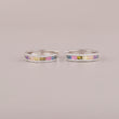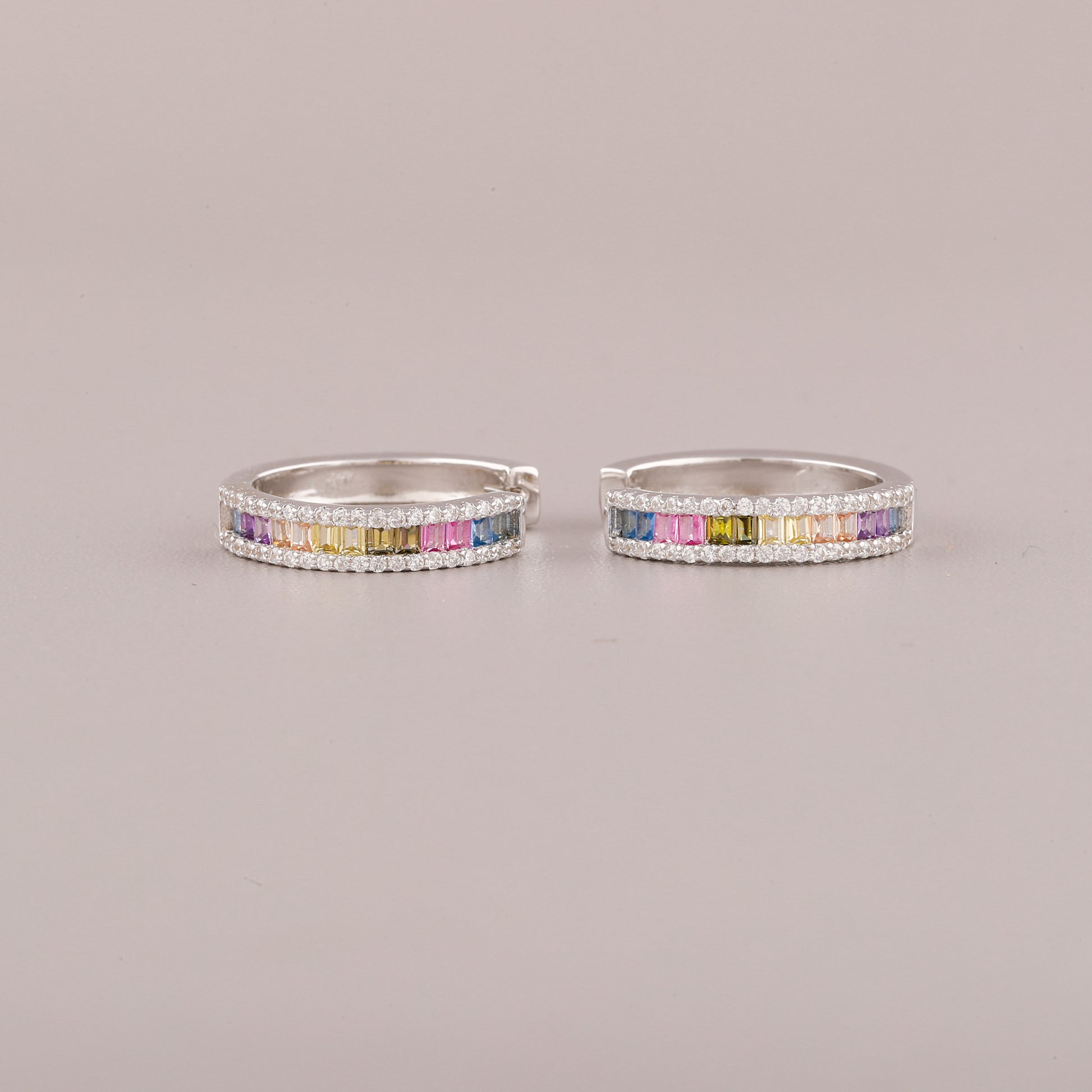 This image features a stylish pair of Silver-Tone Rainbow Baguette Huggie Hoop Earrings. One earring showcases a vibrant section of channel-set baguette-cut stones arranged in a colorful rainbow spectrum (red, yellow, green, blue, etc.), offering a playful yet luxurious pop of color. This colorful section is framed by small, clear pave-set stones. The second earring is completely set with the small, clear brilliant-cut stones (likely white diamonds or cubic zirconia). This striking combination of a colorful rainbow hoop and a classic, sparkling white hoop creates an intentionally mismatched pair, designed to be worn together for a trendy and eye-catching look.
