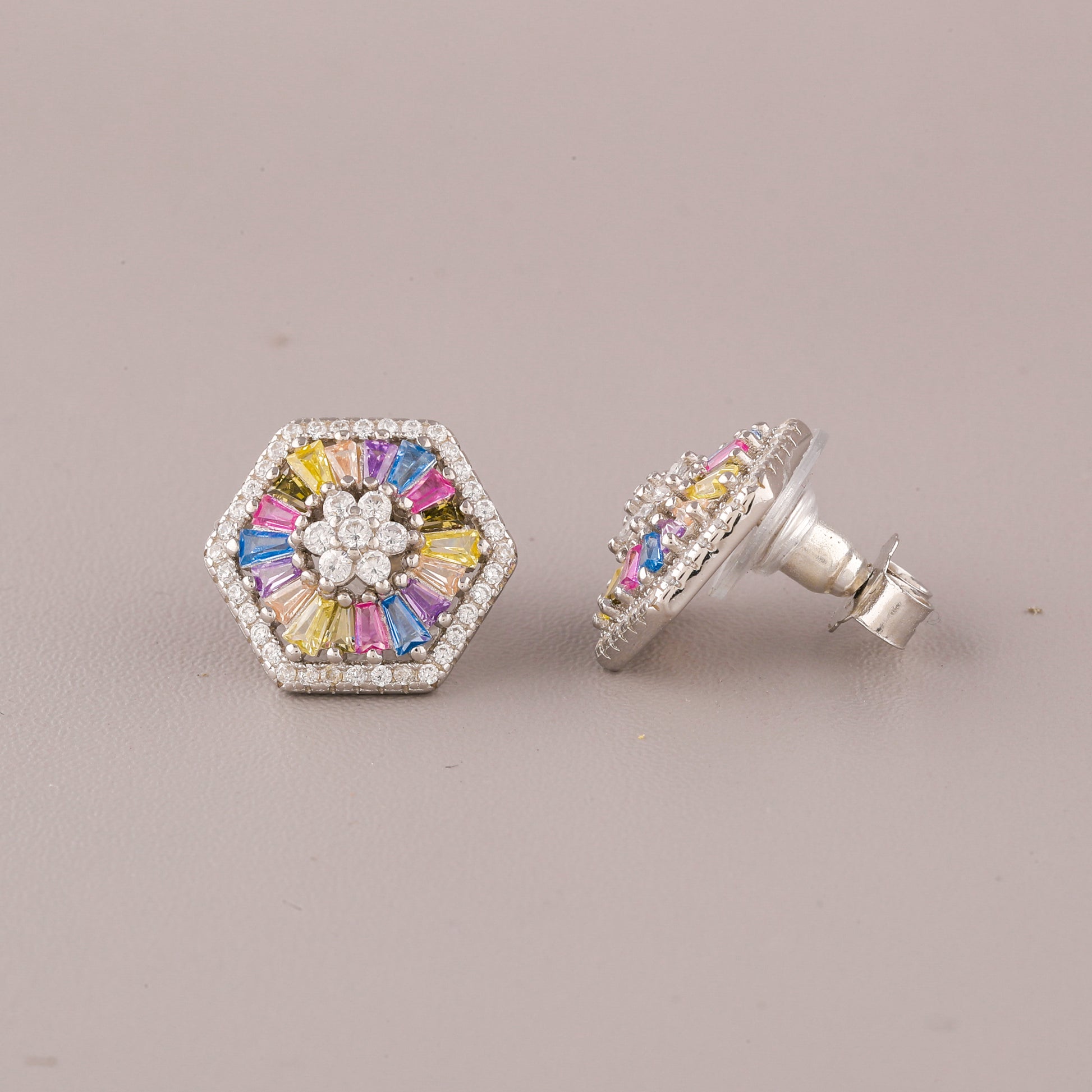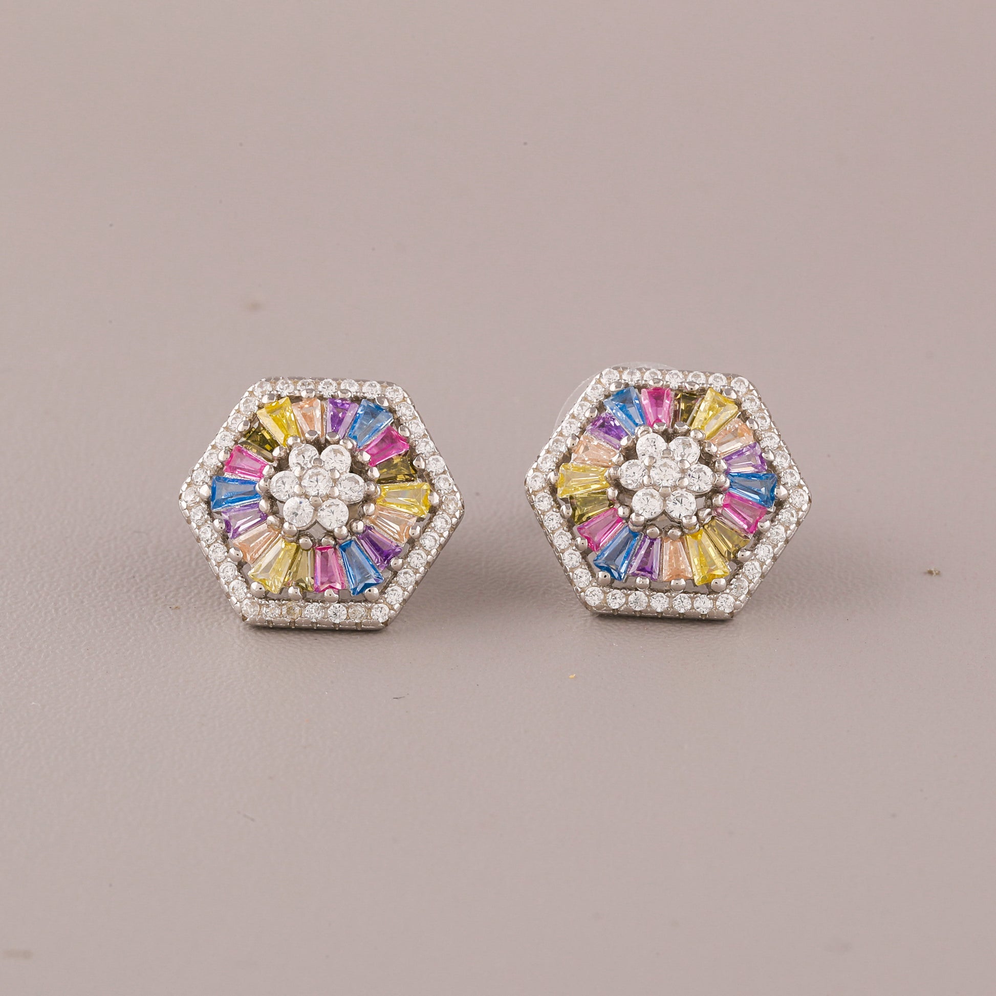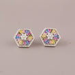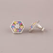 This image captures a single, striking Silver-Tone Rainbow Flower Cut Cabochon Stud Earring held between two fingers with vibrant blue nail polish. The earring features a bold Flower Cut Cabochon shape bordered by a halo of small, clear pave-set stones. Within this frame, the design centers around a small cluster of clear stones. Radiating outwards from the center are Flower Cut Cabochon-cut stones in a vibrant, scattered "natural rainbow" pattern of yellow, pink, blue, and white, creating a dynamic, geometric starburst effect. The combination of the modern hexagon outline and the colorful, sparkling stones makes this stud a unique and substantial statement piece, blending contemporary geometry with cheerful luxury.