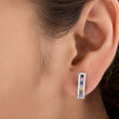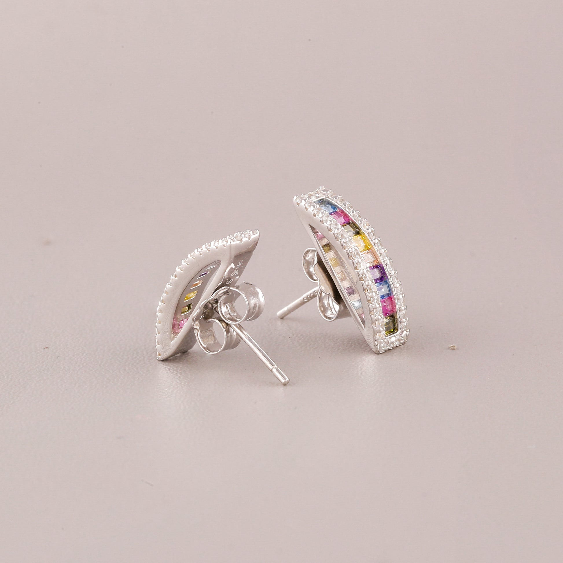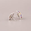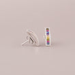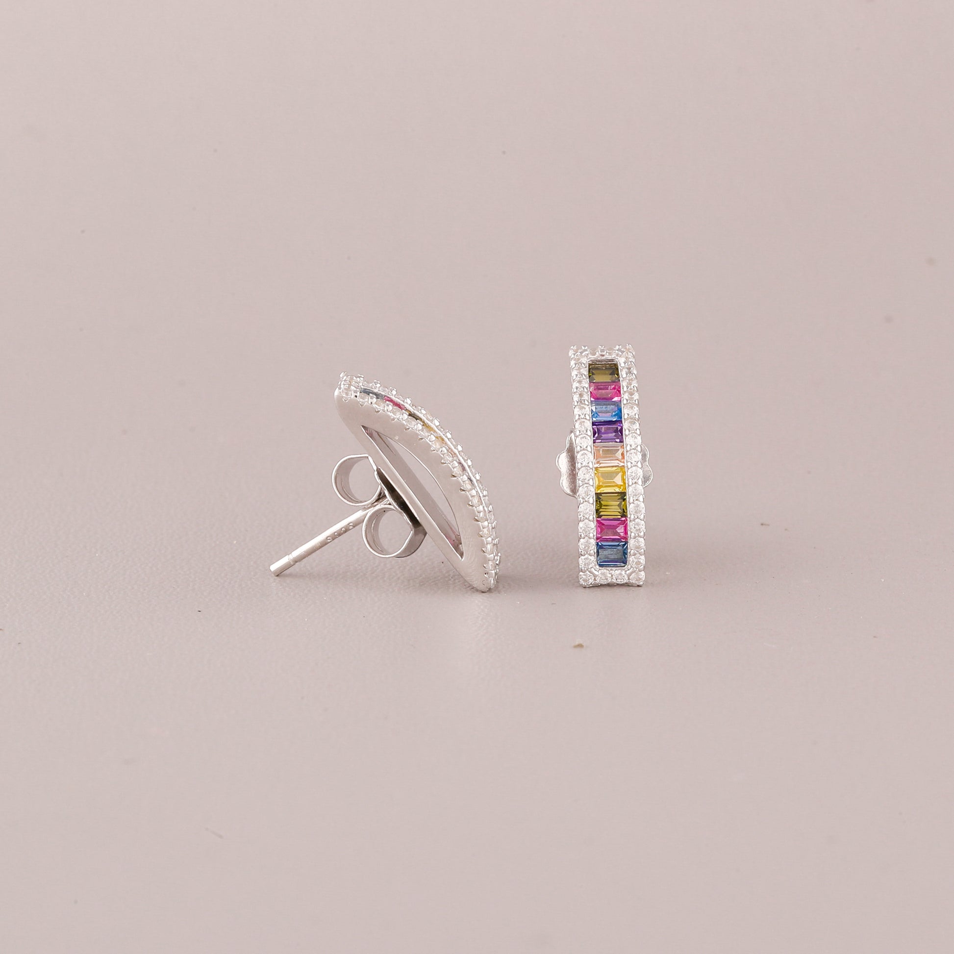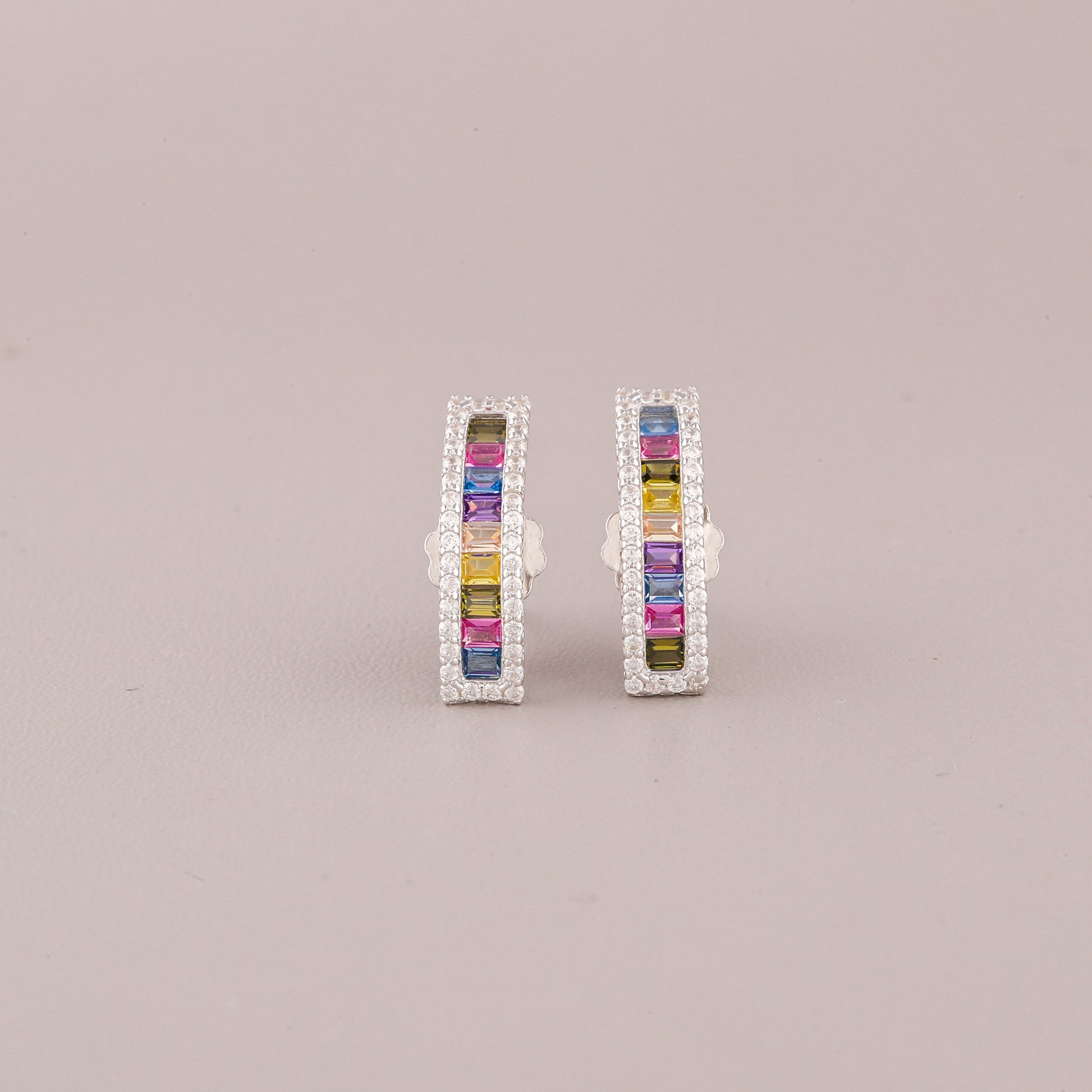 This image showcases a vibrant pair of Silver-Tone Rainbow Baguette Half-Hoop Earrings. The earrings feature a rectangular, half-hoop design, offering a bold and modern silhouette. The central channel is set with striking, square or rectangular-cut stones arranged in a vivid "natural rainbow" spectrum, including rich pinks, yellows, greens, and blues. This central color band is beautifully framed on both sides by two outer rows of small, round, pave-set clear stones (likely white diamonds or cubic zirconia). Set in a bright silver-tone metal, the thick profile and strong color contrast make these earrings a luxurious yet playful everyday statement piece.
