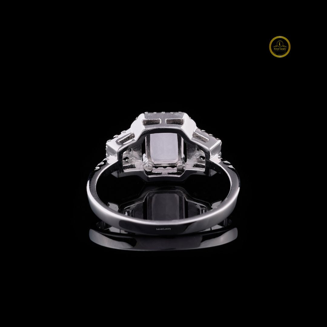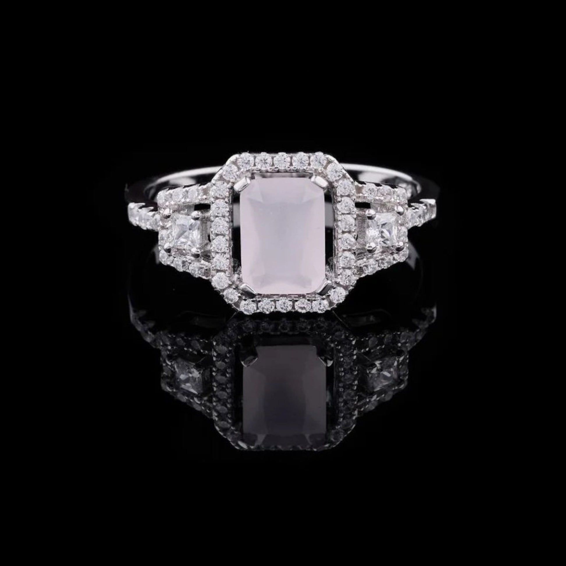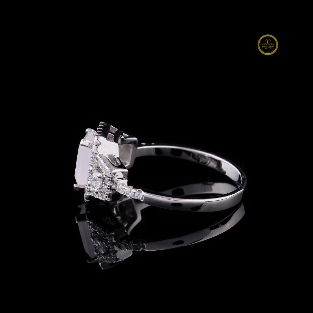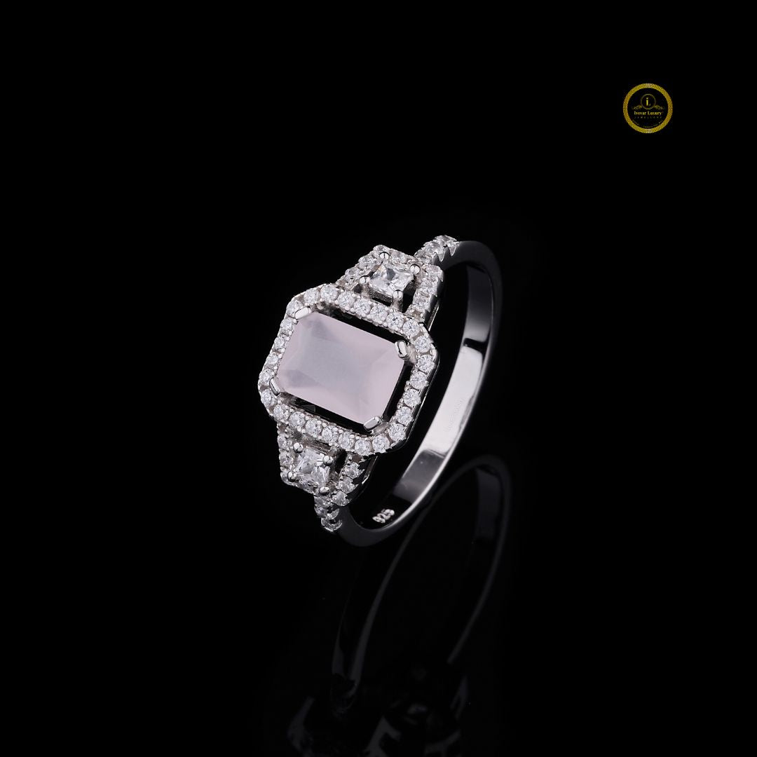 This stunning ring features an emerald-cut rose quartz centerpiece, beautifully framed by a double halo of brilliant diamonds. The elegant split-shank design enhances its sparkle, while the high-polish white gold setting adds a touch of modern luxury. Crafted with exceptional precision, this piece embodies timeless elegance, sophisticated craftsmanship, and the unmistakable refinement of Luxury. Perfect for special occasions or as a statement of everyday elegance, this ring brings together radiance, romance, and premium artistry.