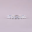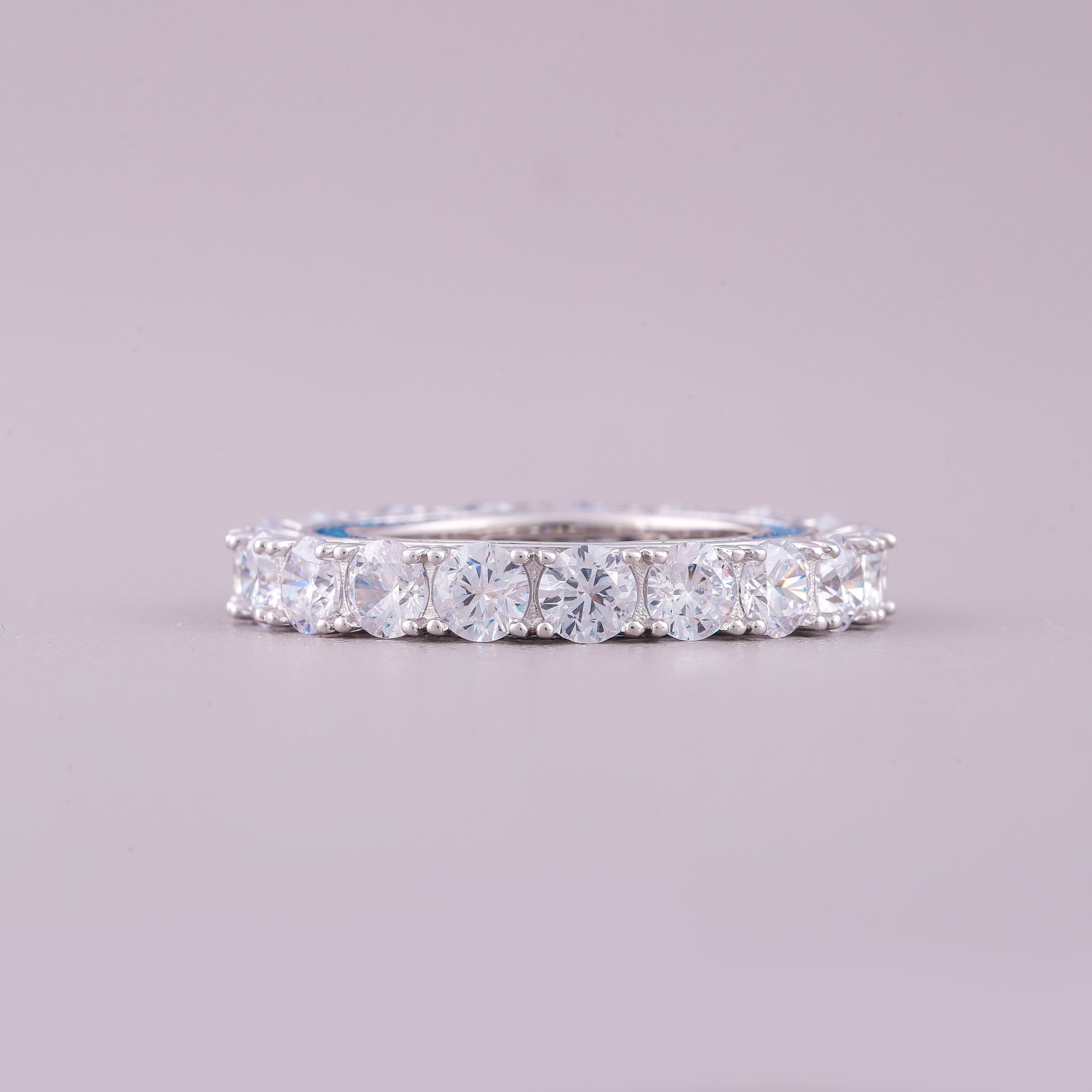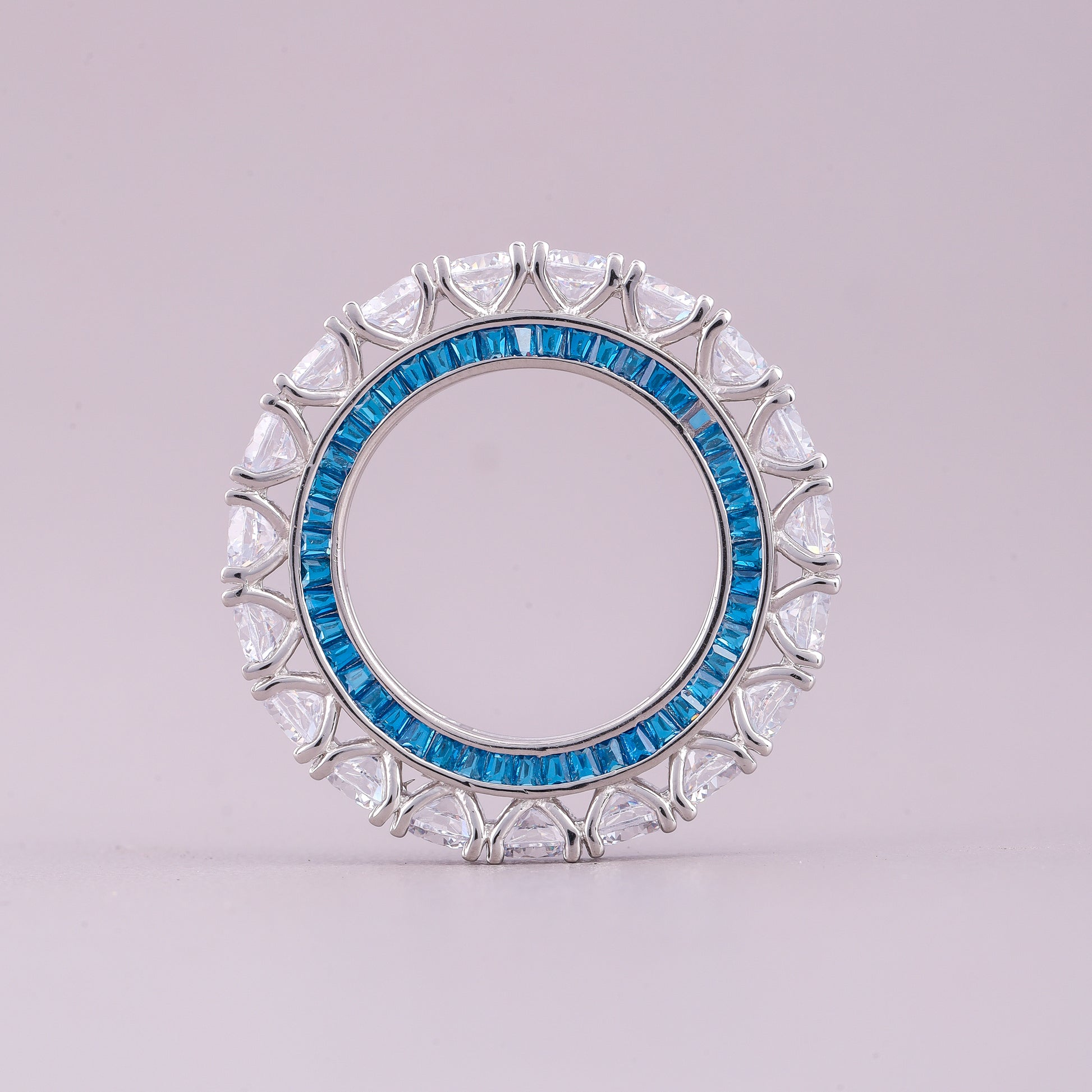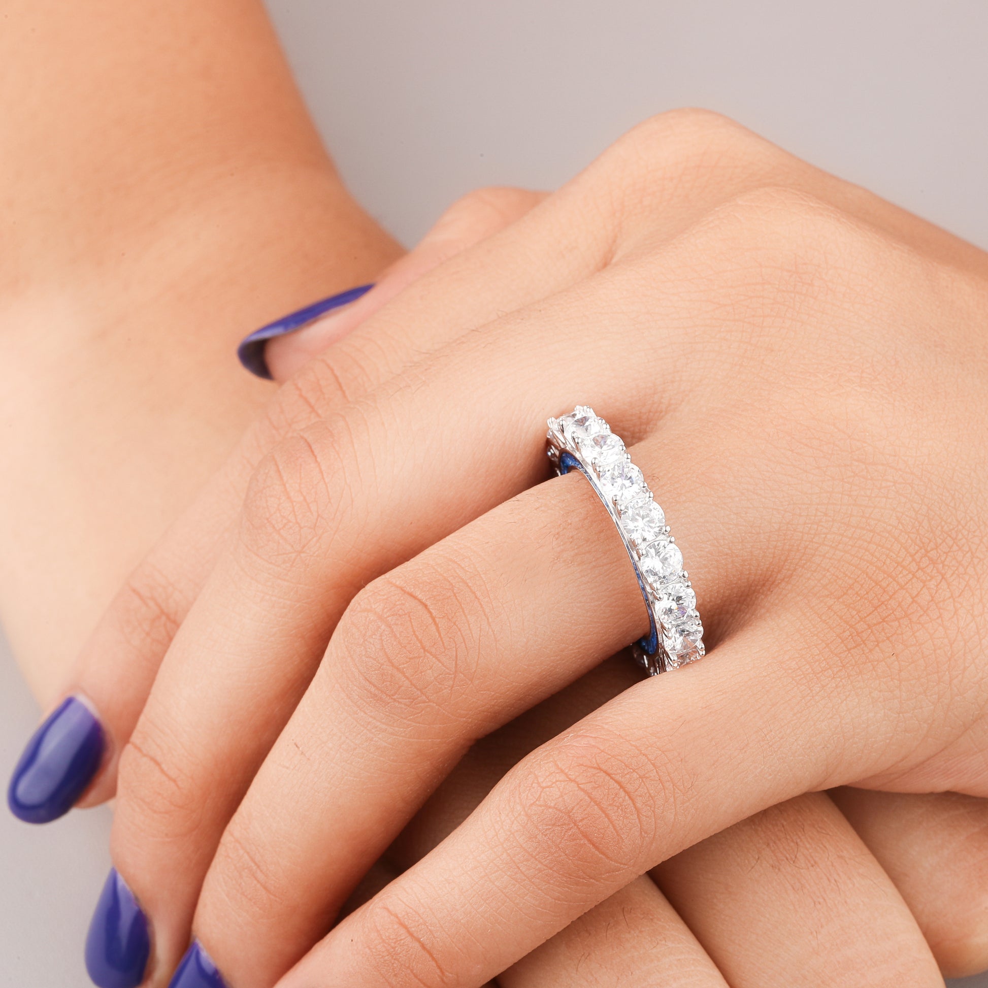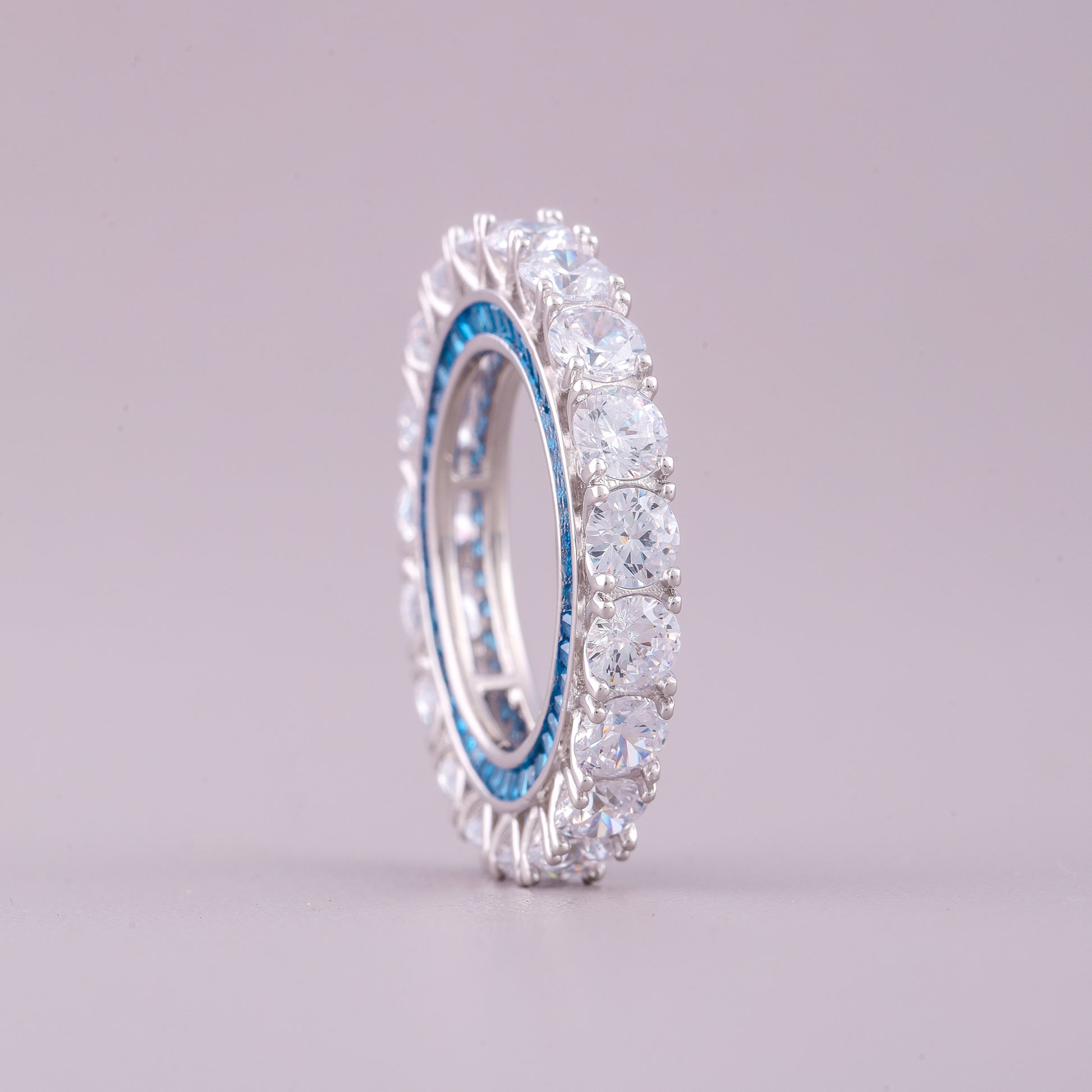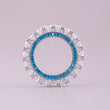 This exquisite ring is a striking example of a sapphire and diamond eternity band, likely set in white gold or platinum. The design features a continuous, full circle of round-cut gemstones, symbolizing everlasting love. Large, brilliant-cut diamonds dominate the outer edge, maximizing their sparkle. Complementing them are smaller, vivid blue natural sapphires, nestled on the inner circumference, providing a luxurious pop of color and rich contrast against the bright metal. This multi-row, stacked appearance offers exceptional depth and brilliance. The alternating arrangement and robust setting suggest both a classic and glamorous statement piece, perfect as a wedding band, anniversary gift, or luxurious stacking ring.