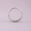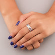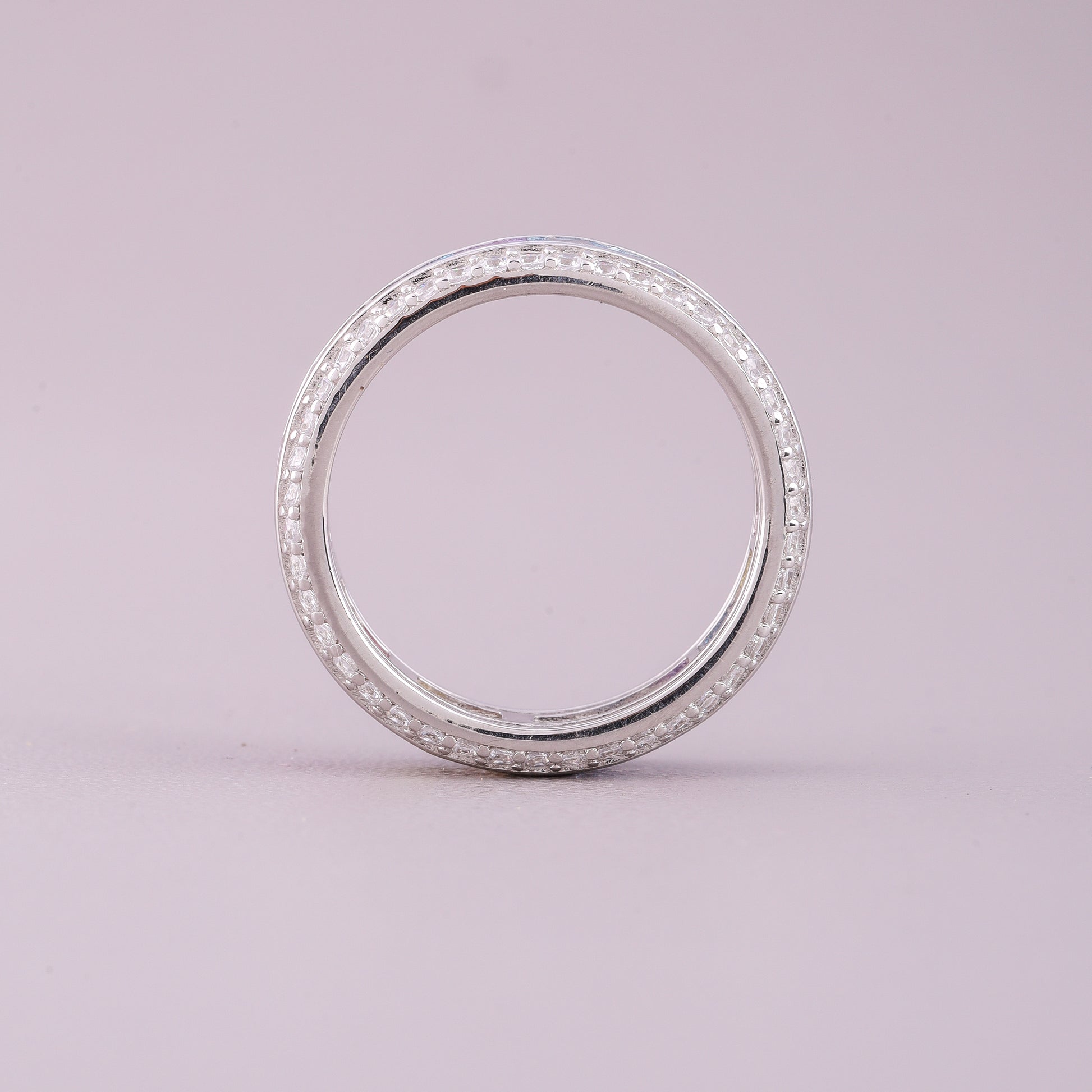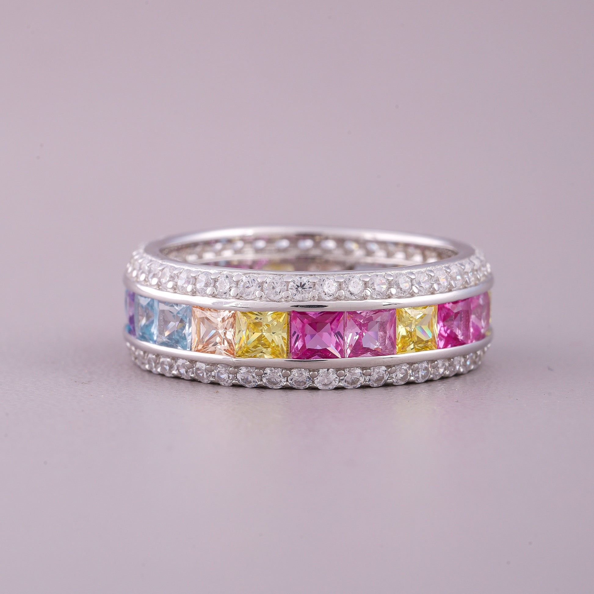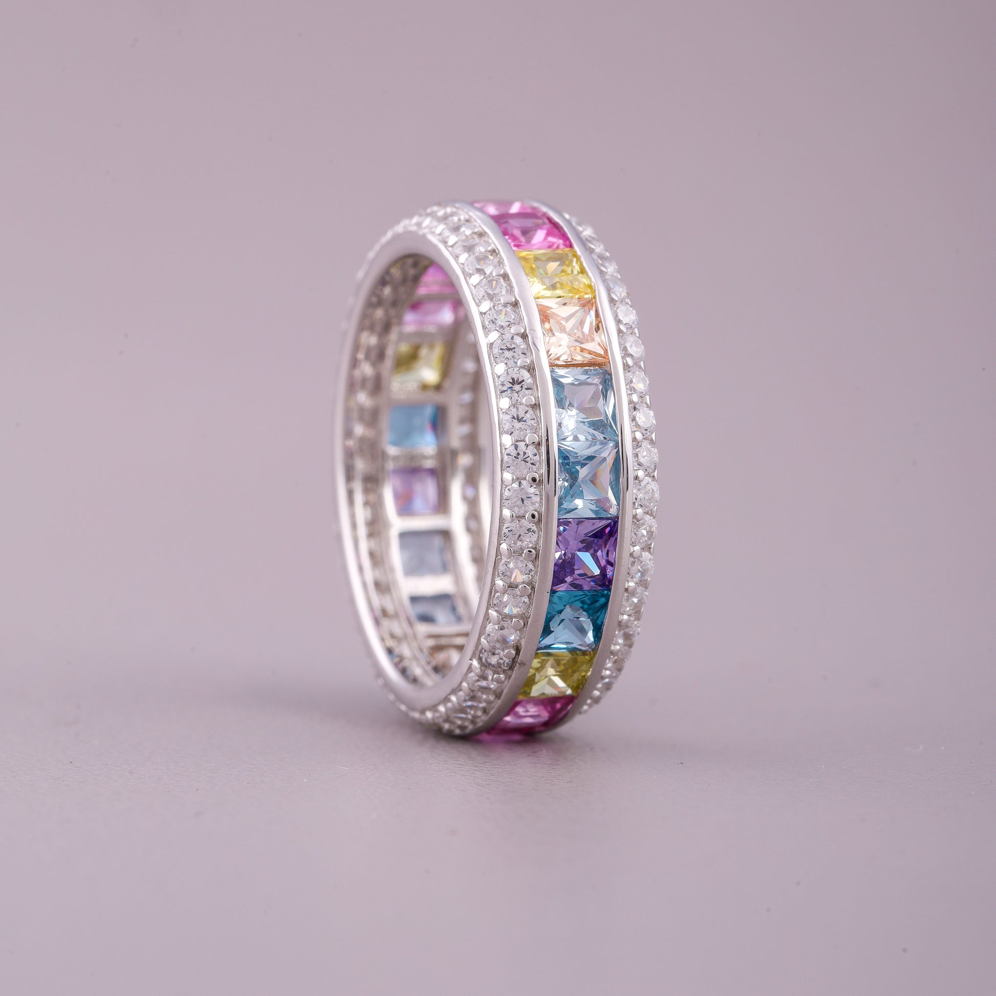 This vibrant ring is a captivating multi-color sapphire and diamond eternity band, likely set in sterling silver or white gold. The central feature is a striking continuous row of natural princess-cut sapphires in a vivid spectrum of colors, including shades of blue, pink, and yellow. These radiant stones are channel-set, creating a clean, seamless line. Framing the colorful center are two rows of smaller, round-cut diamonds, which are pavé-set along the edges. The diamond borders enhance the brilliance and provide a glittering contrast to the bold colors. This piece is a modern and playful take on the classic eternity ring, offering a lively and cheerful statement perfect for everyday wear or stacking.