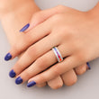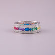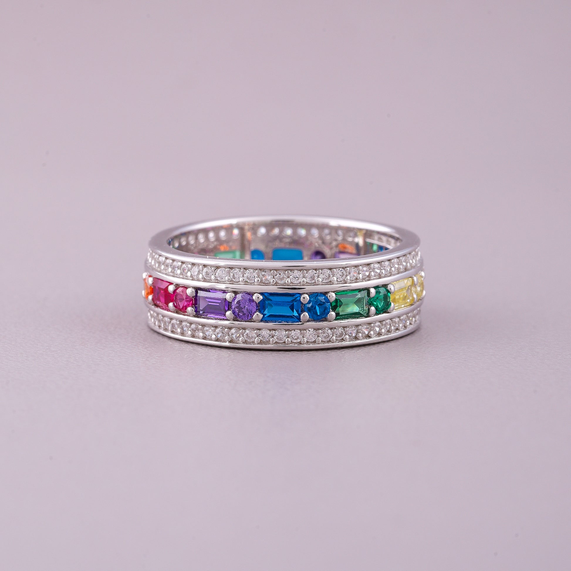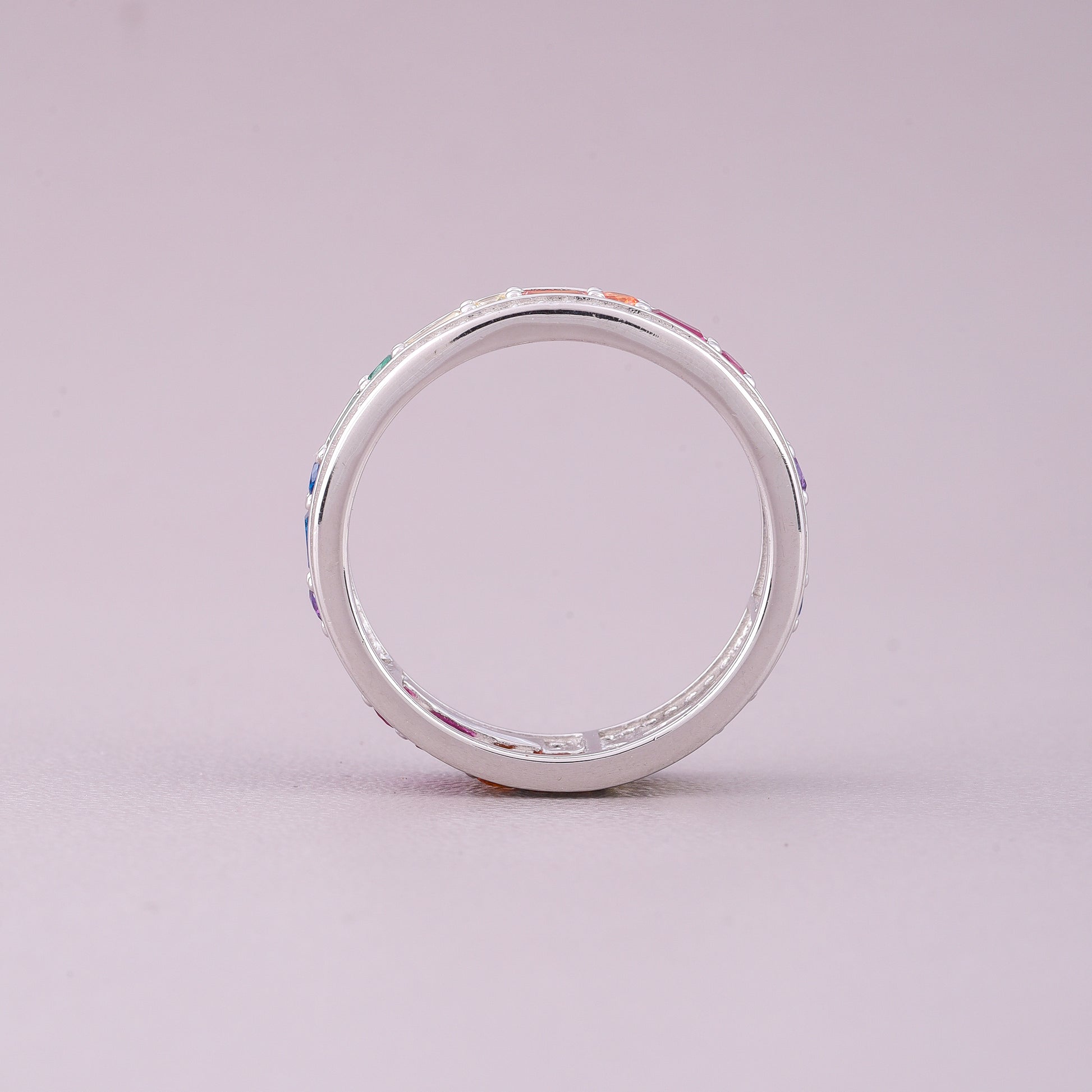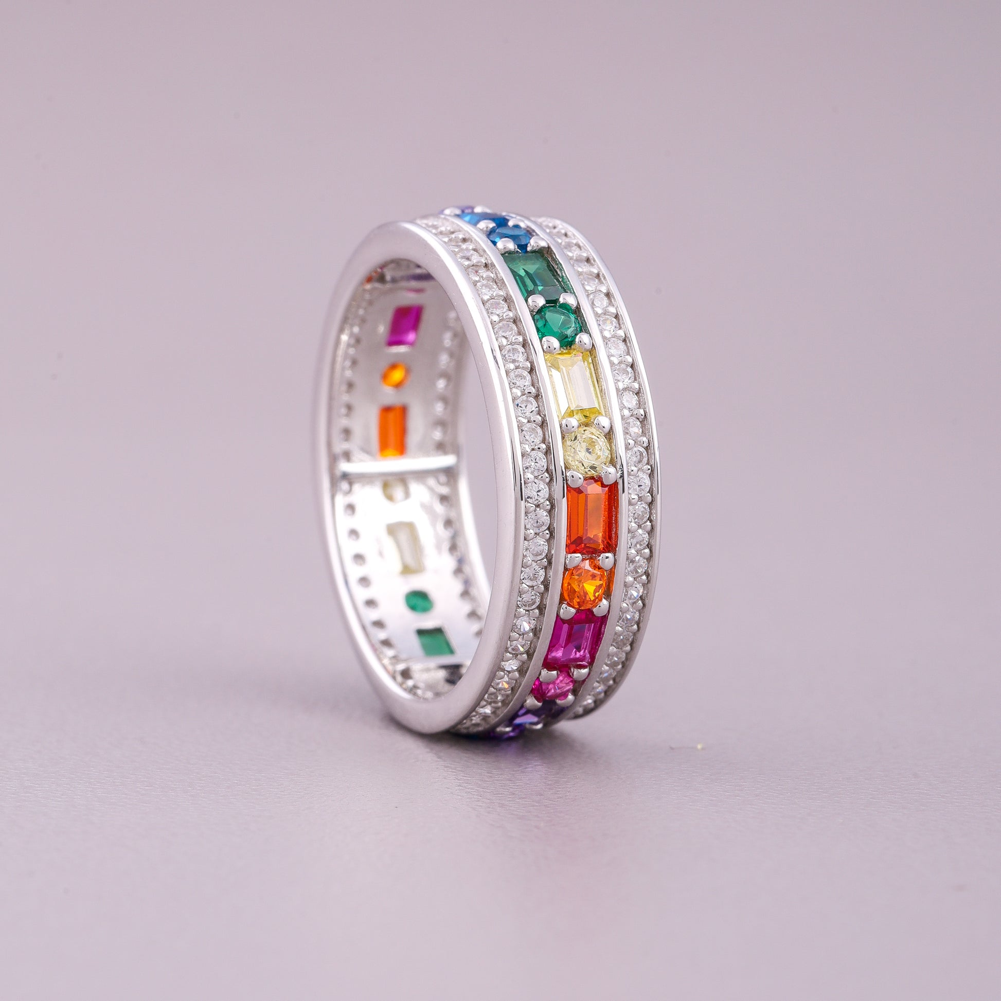 This eye-catching band showcases a stunning rainbow eternity design, featuring a central row of brilliantly colored, natural emerald-cut sapphires. The vibrant stones are precisely set in a spectrum of hues, including ruby red, amethyst purple, sapphire blue, and emerald green, creating a bold, continuous circle of color. These sapphires are securely channel-set in what appears to be white gold or platinum. Flanking the colorful gemstones are two delicate rows of pavé-set diamonds along the top and bottom edges, which add a significant layer of sparkle and contrast. This contemporary, wide-band style is a luxurious celebration of color, perfect for making a stylish statement or serving as a cheerful stacking piece.