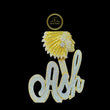 The design features the name "Ash" in a flowing, layered script, completely "iced out" with brilliant moissanite diamonds set in a white metal. The name hangs beneath a highly detailed, solid yellow gold element shaped like the profile of a Native American Indian Chief wearing a feather headdress. The headdress is also heavily accented with white moissanite. This two-tone design blends the shimmering brilliance of the script name with the bold, traditional symbolism of the chief's head, creating a unique and substantial statement piece.
