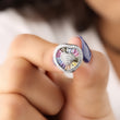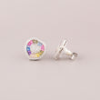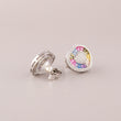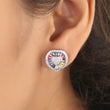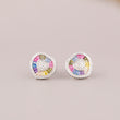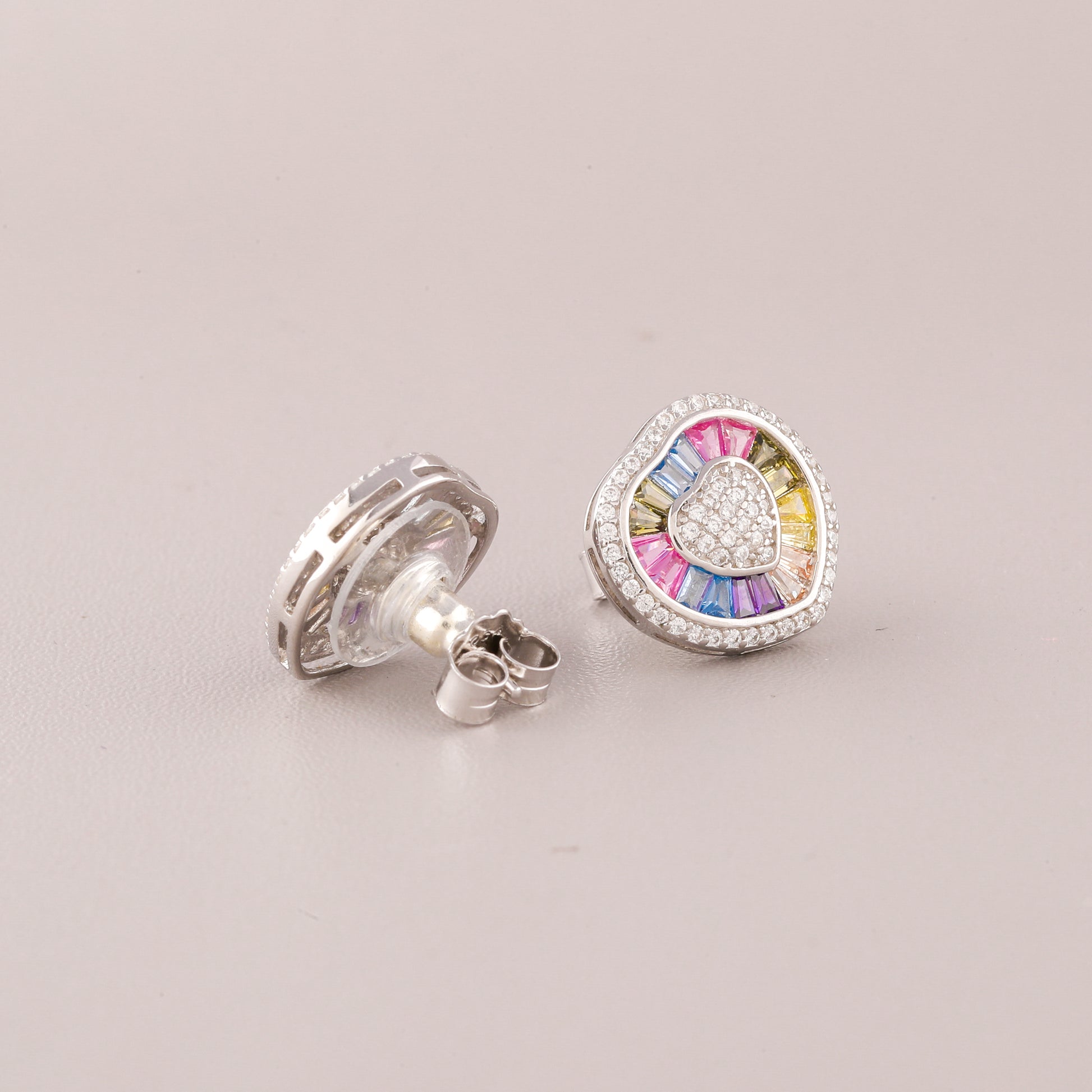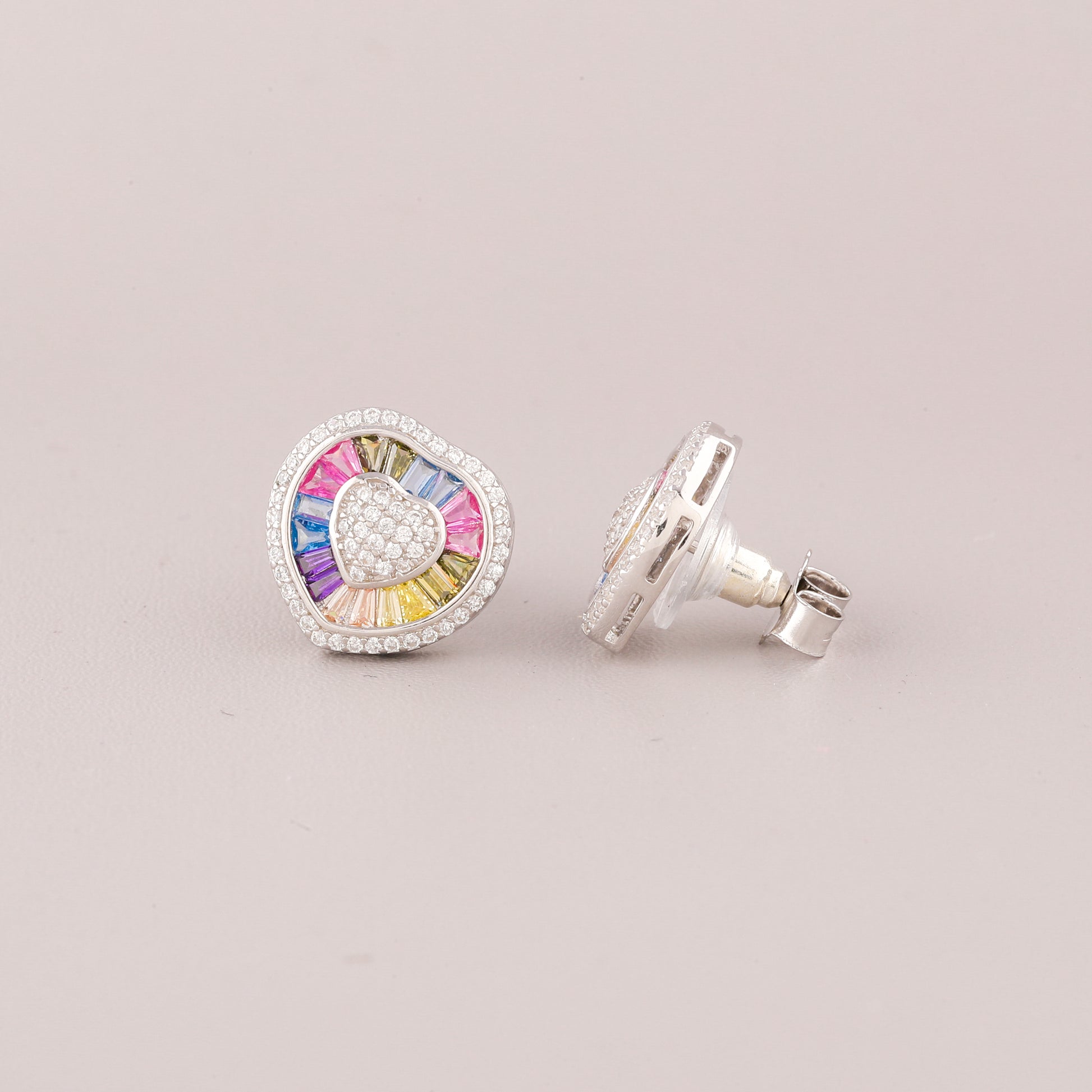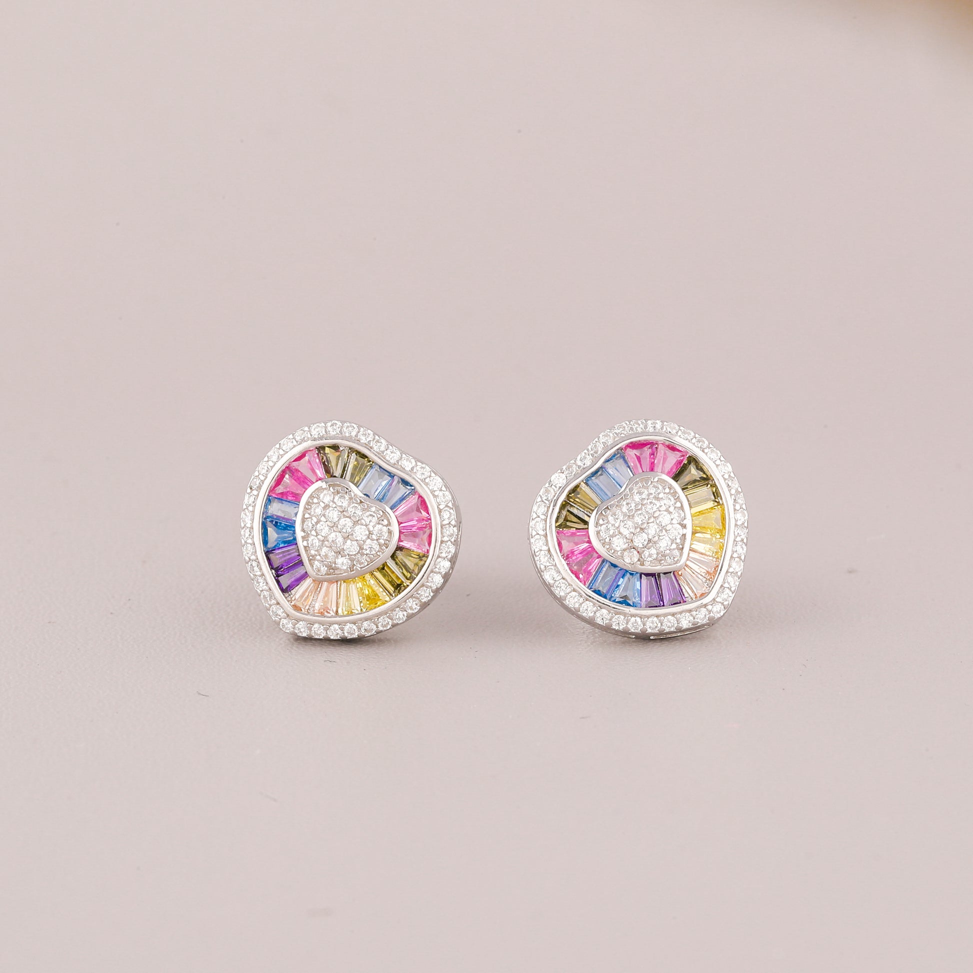This image displays a charming pair of Silver-Tone Rainbow Heart Stud Earrings. The earrings are designed with a playful yet luxurious motif. At the center of each stud is a small, slightly rounded heart shape, entirely paved with small, clear stones (likely diamonds or cubic zirconia). Radiating outwards from this sparkling heart is a border of baguette-cut stones meticulously set in a vibrant "natural rainbow" sequence, featuring colors like pink, blue, yellow, and purple. The entire design is then framed by a final halo of clear pave stones. Set in a cool silver-tone metal, these studs blend romantic sentiment with cheerful modern color.