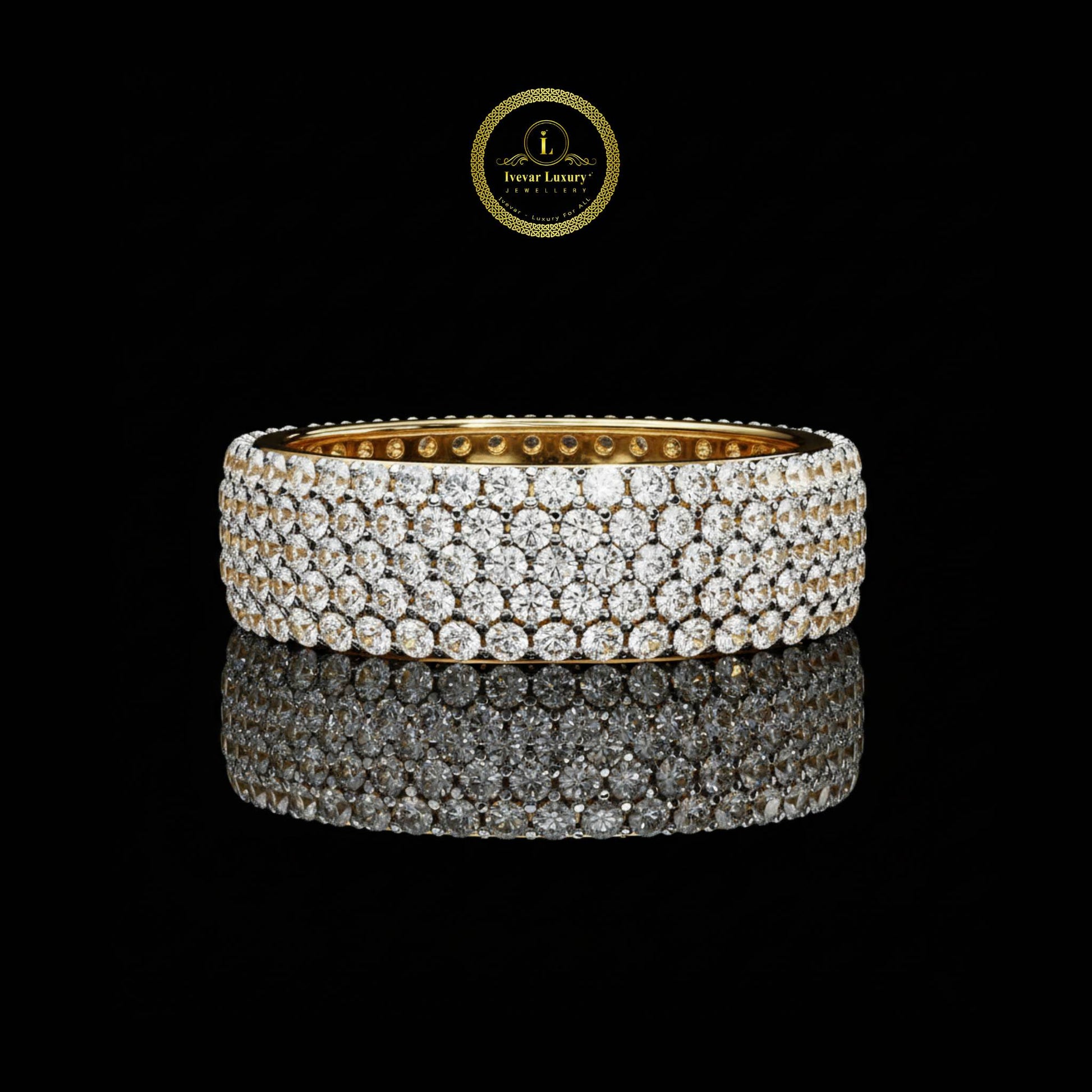 This stunning bangle features a golden base adorned with an intricate arrangement of sparkling diamonds. The piece is designed to catch the light from every angle, offering an elegant and luxurious appearance. Its fine craftsmanship ensures a timeless appeal, perfect for adding a touch of glamour to any formal outfit. Ideal for those who appreciate refined beauty and exquisite luxury jewelry.