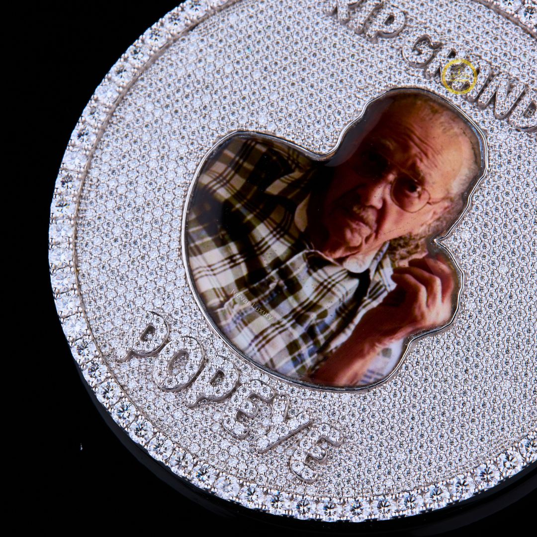 The pendant's primary function is a tribute, featuring a detailed photo of an elderly man set in the center. The surrounding field and bezel are entirely paved with brilliant round-cut Moissanite diamonds, giving the piece a full, icy aesthetic. The custom, raised lettering above and below the photo reads "RIP GRANDPA" and "POPEYE", indicating a personal nickname or term of endearment. The design is executed in a silver-toned metal with a substantial, pave-set bail, making it a visible and enduring personal statement of remembrance.