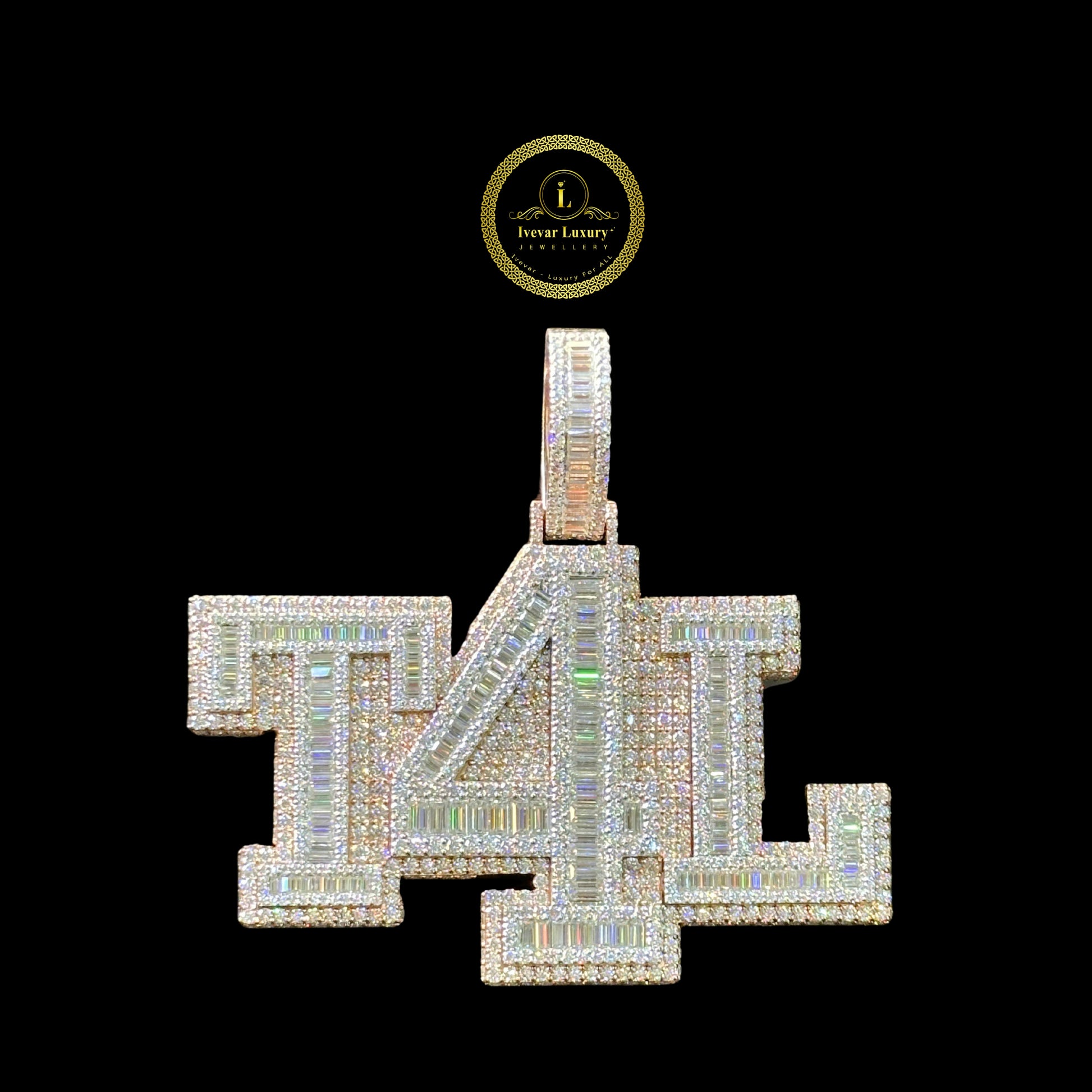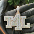 The pendant features the stylized initials "T4L" intricately combined into one solid piece. The structure is heavily "iced out" with high-quality moissanite diamonds. The design expertly utilizes two distinct cuts: prominent baguette-cut stones define the main lines of the letters, while smaller round-cut stones (pave-set) fill the borders and background, maximizing the piece's sparkle. This mix of cuts and the large size give the pendant a highly dimensional, luxurious, and modern hip-hop aesthetic.